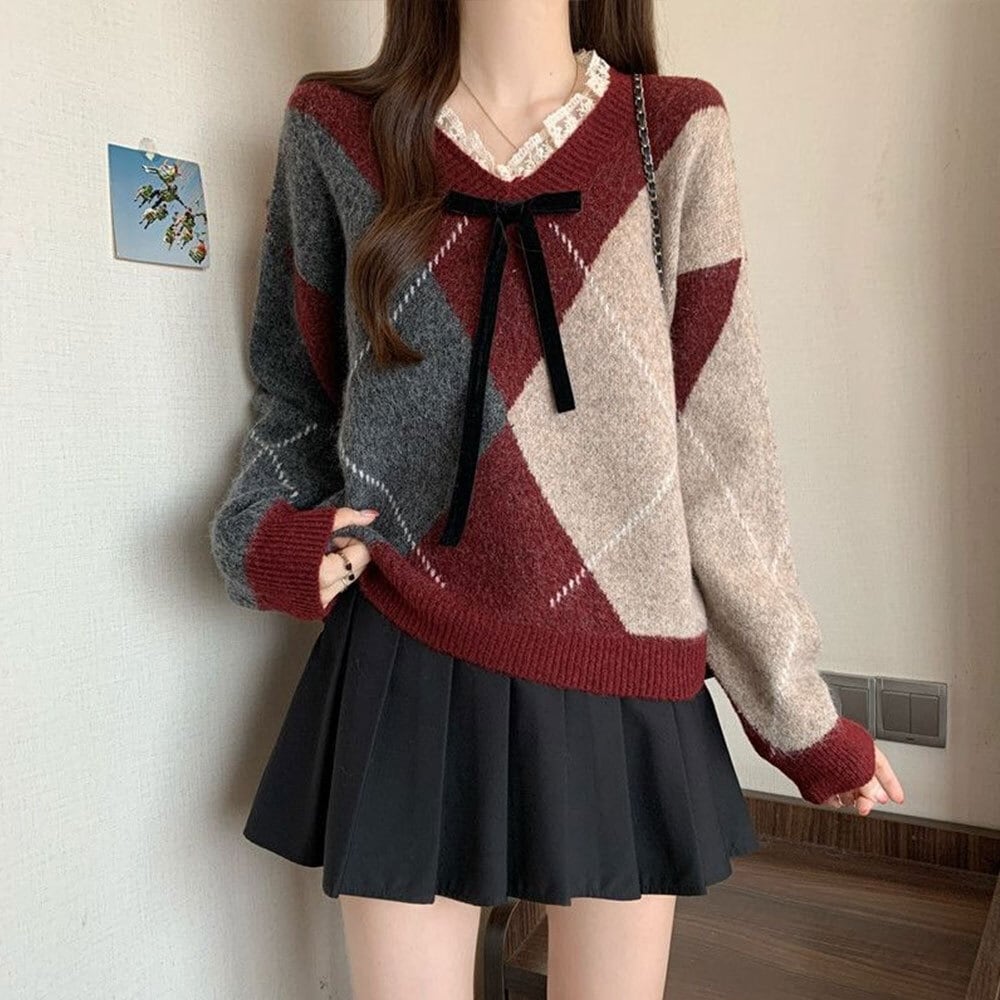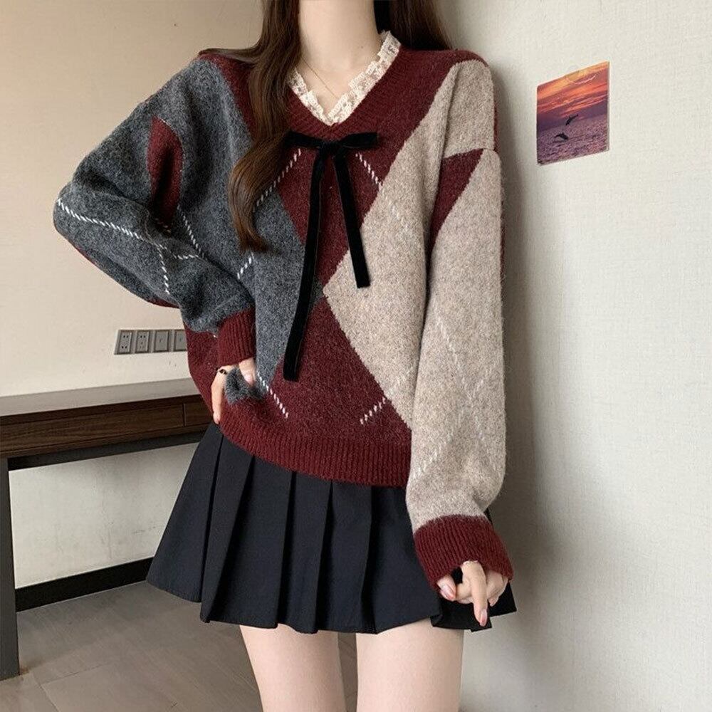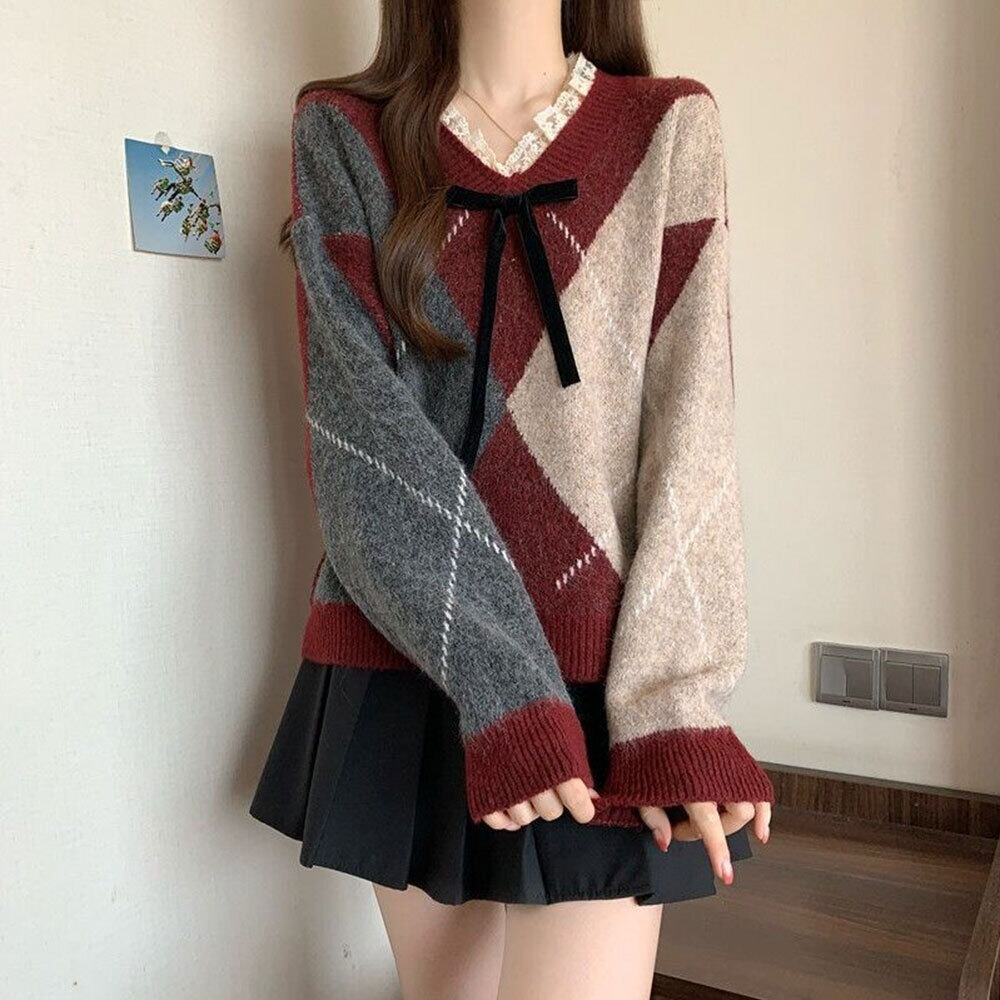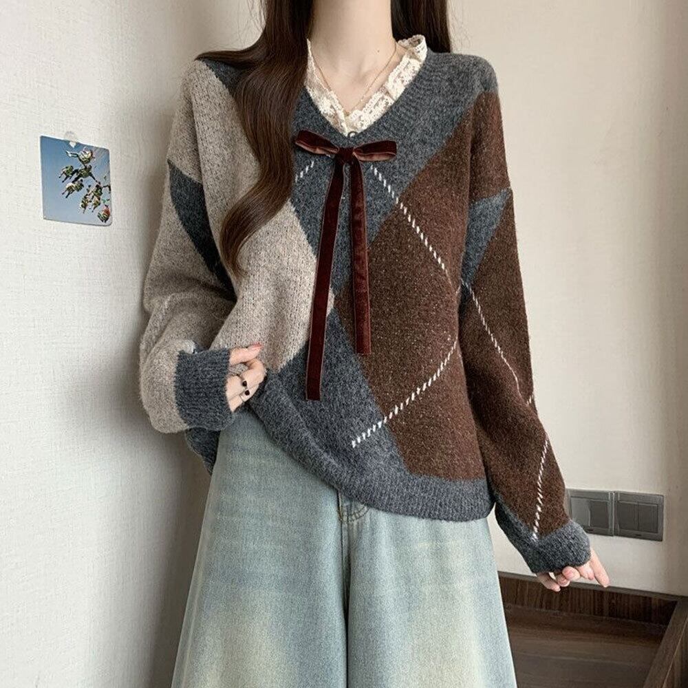 【送料無料】 ダイヤ柄 ニット セーター 長袖 Vネック レディース 春秋冬 韓国 大人 かわいい リボン付き レースネック おしゃれ きれいめ レトロ ゆったり リラックス 大人可愛い 大人女子