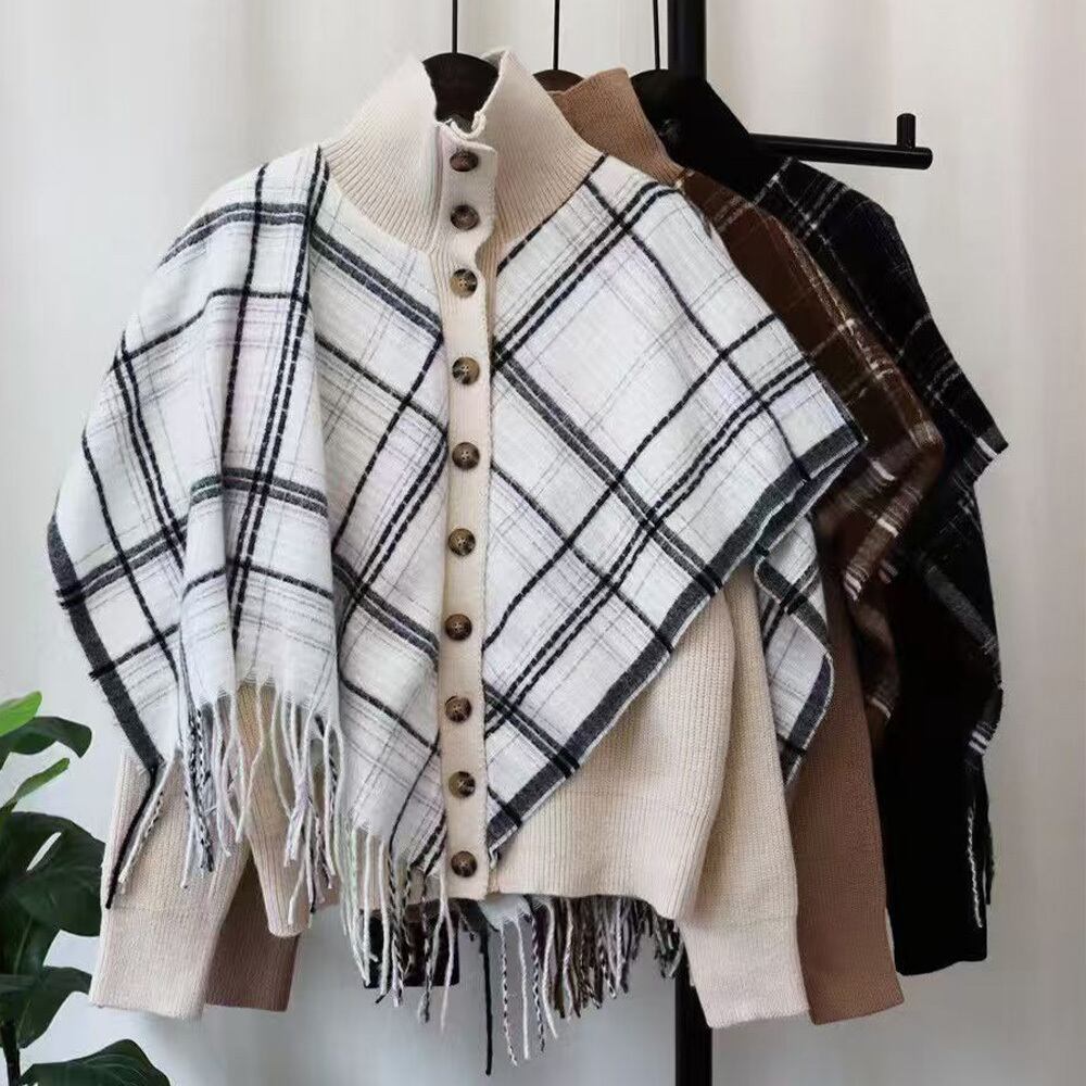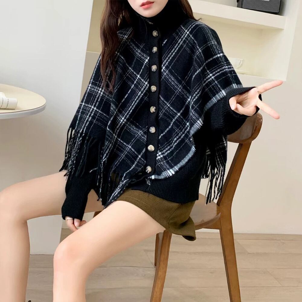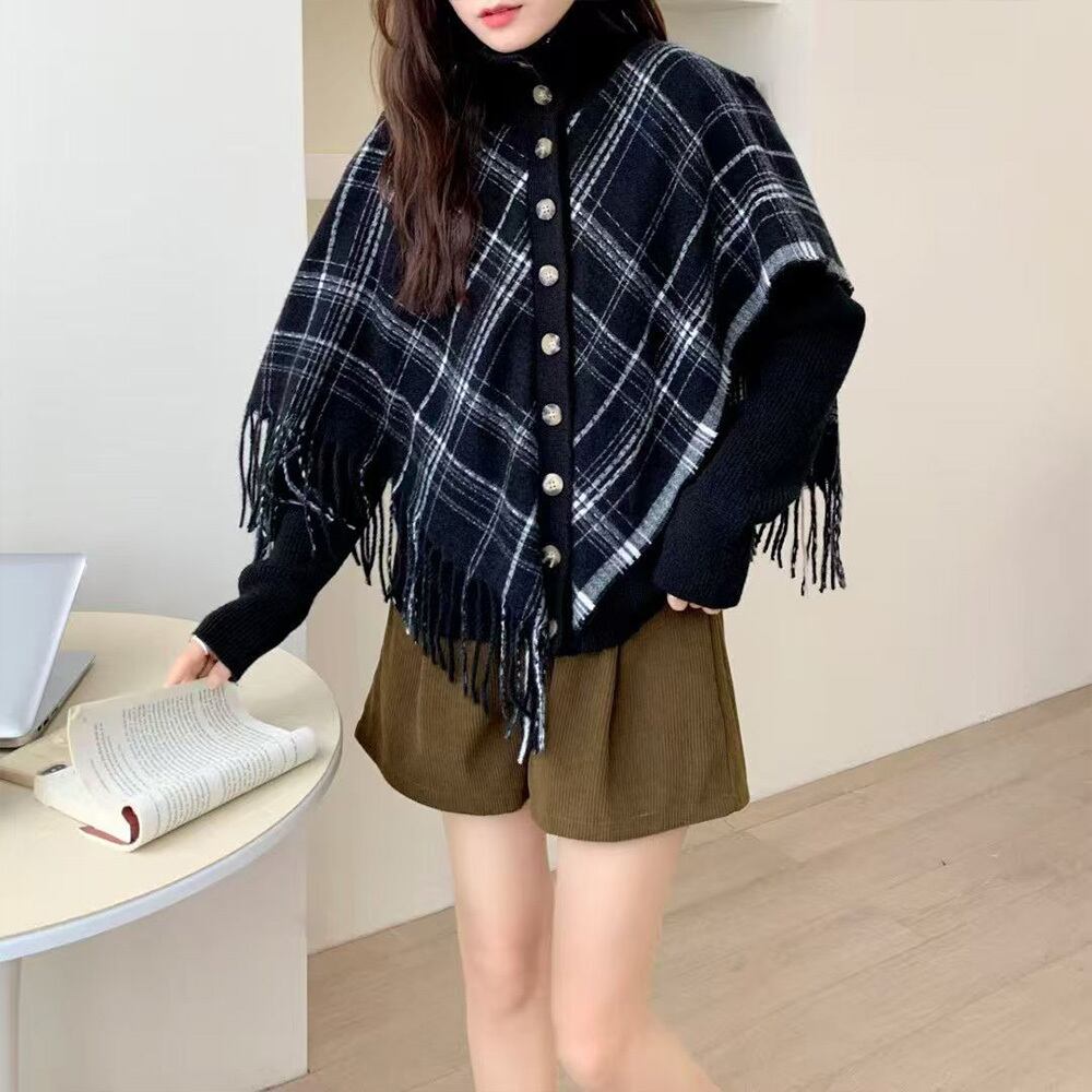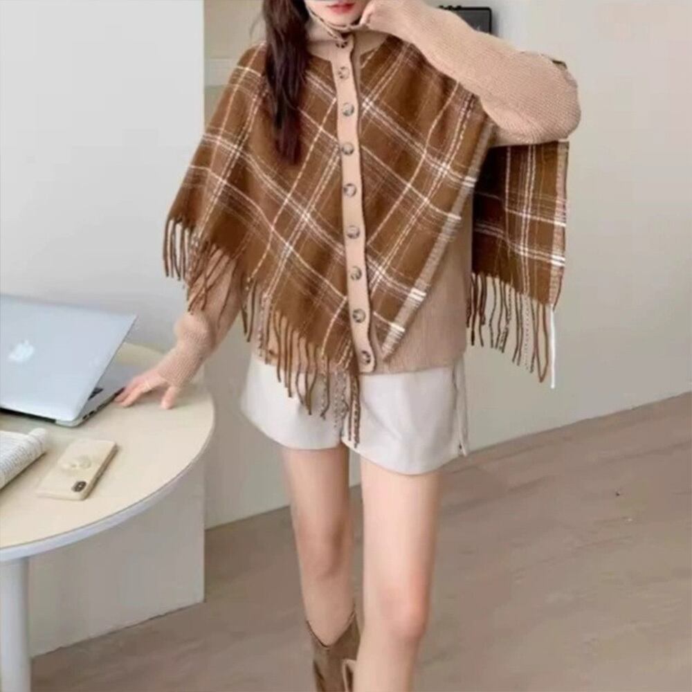 【送料無料】 ポンチョ風 ニット カーディガン 長袖 レディース 秋冬 韓国 重ね着 チェック柄 おしゃれ 大人 かわいい きれいめ カジュアル 防寒 保温 タッセルショール風 大人可愛い 大人女子