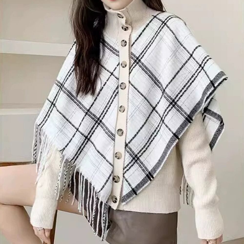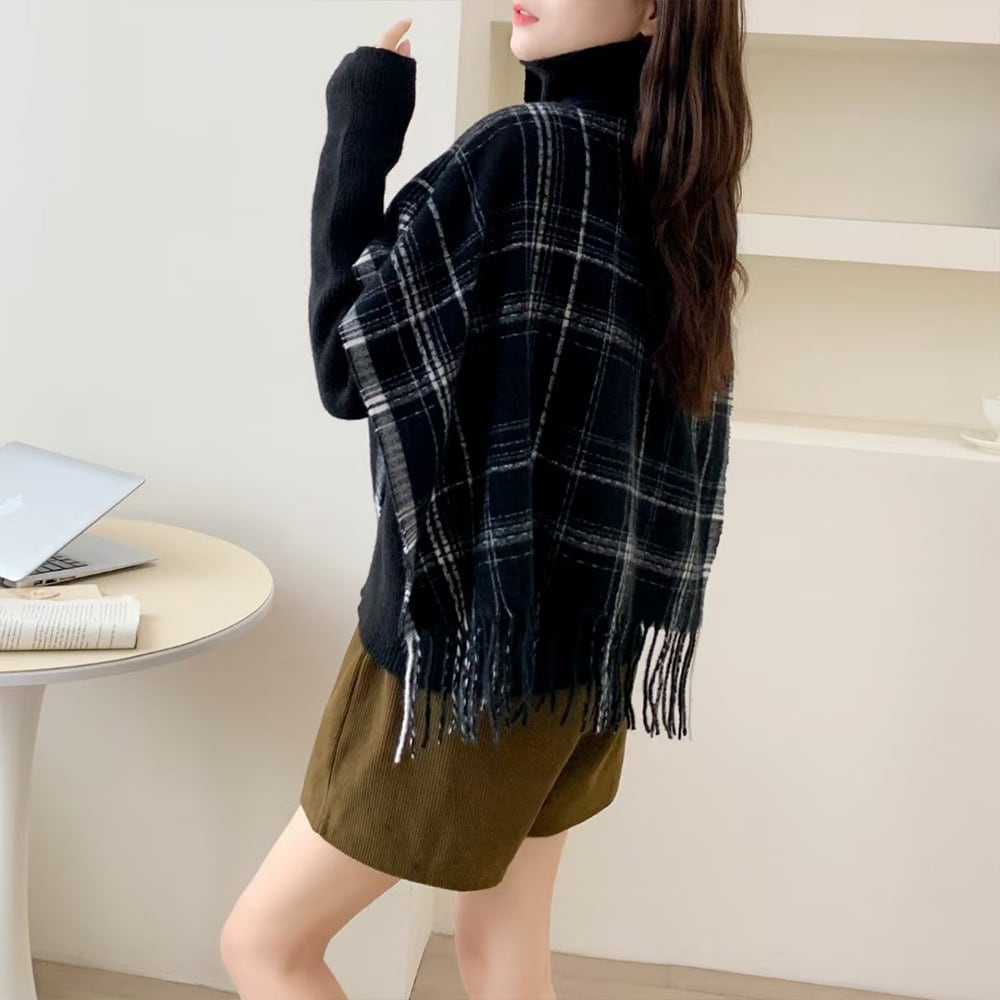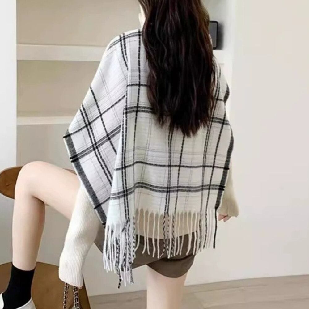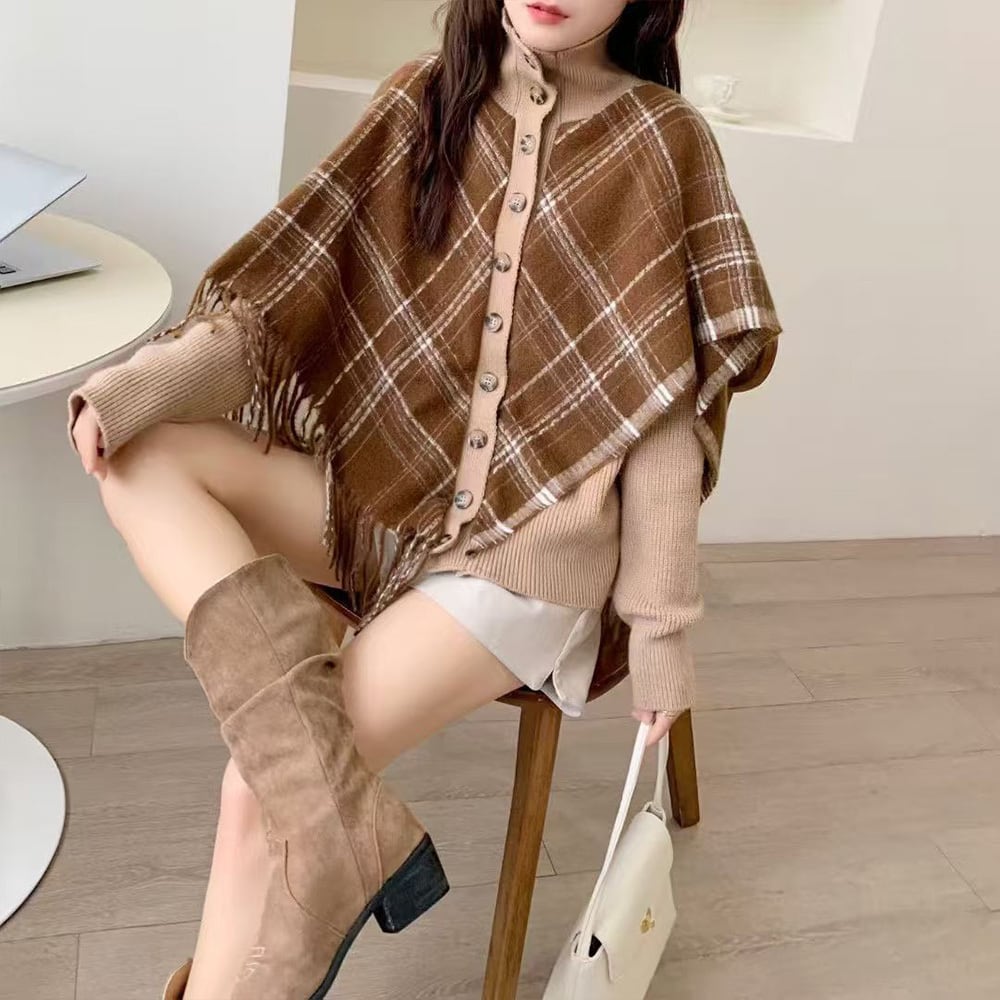【送料無料】 ポンチョ風 ニット カーディガン 長袖 レディース 秋冬 韓国 重ね着 チェック柄 おしゃれ 大人 かわいい きれいめ カジュアル 防寒 保温 タッセルショール風 大人可愛い 大人女子