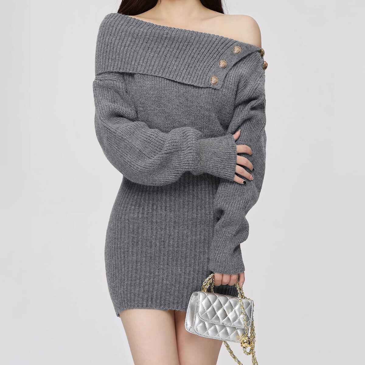 トレンドのオフショルダーデザインで、秋冬のお洒落を楽しむためにデザインされた、長袖のミニワンピースです。