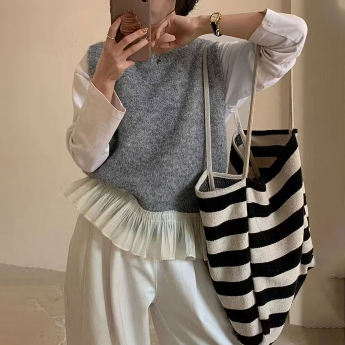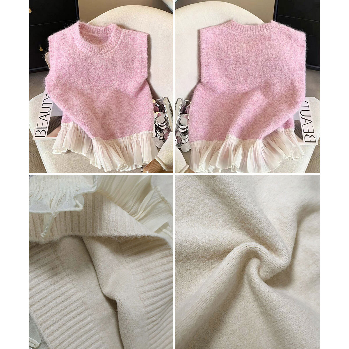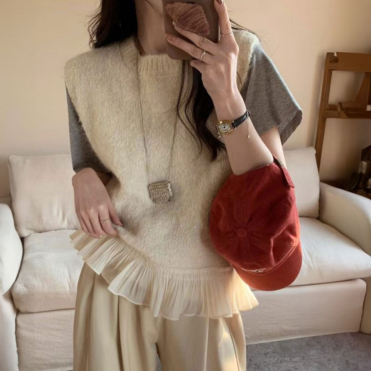 裾フリル ニット ベスト レディース 春秋冬 韓国 ジレ きれいめ 大人 かわいい 重ね着 レイヤード セーター ノースリーブ カジュアル プリーツフリル チョッキ 大人可愛い 大人女子