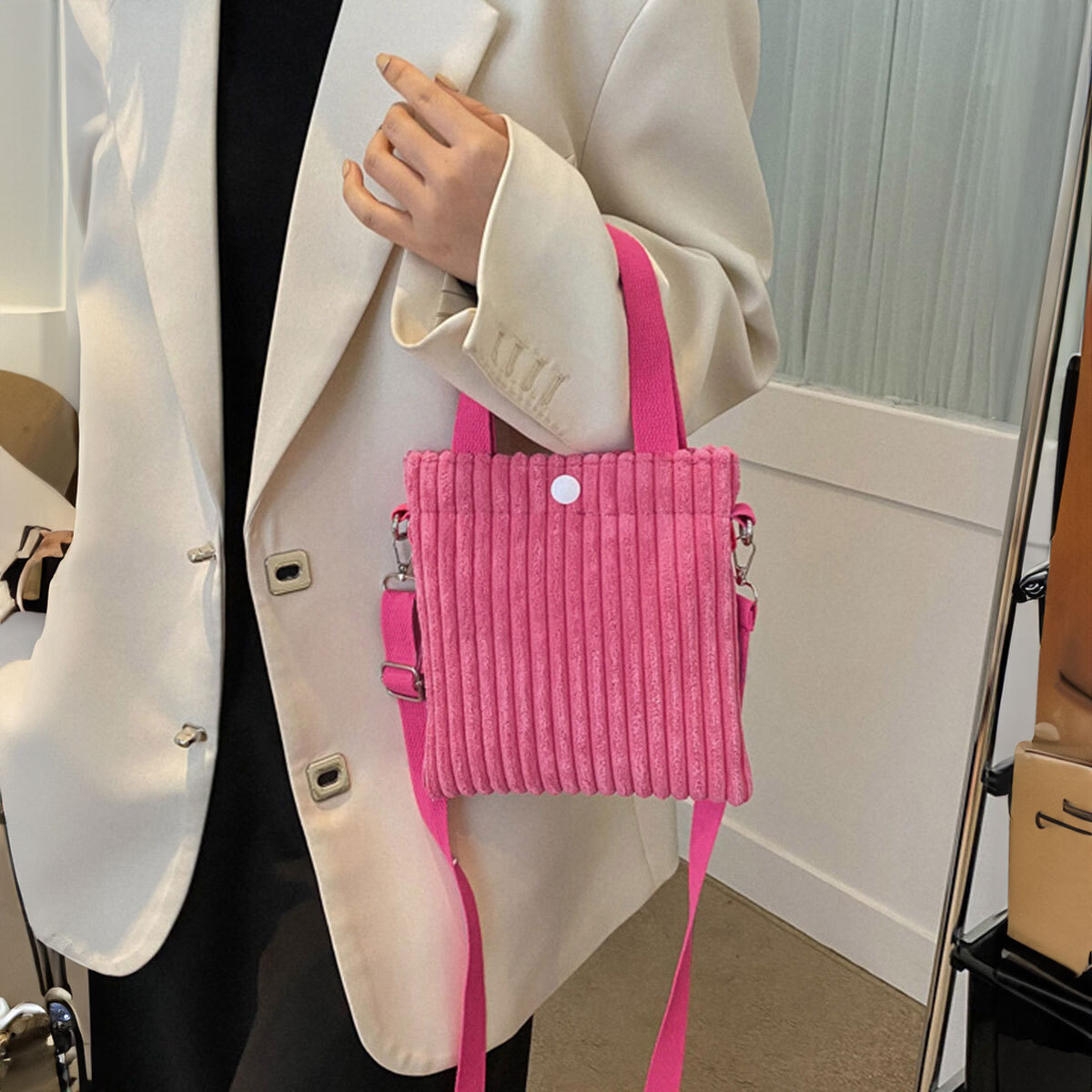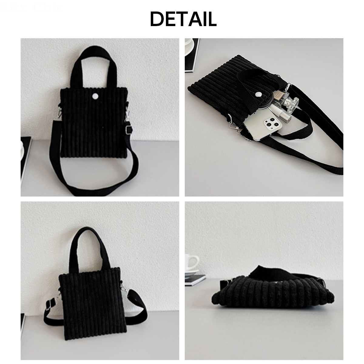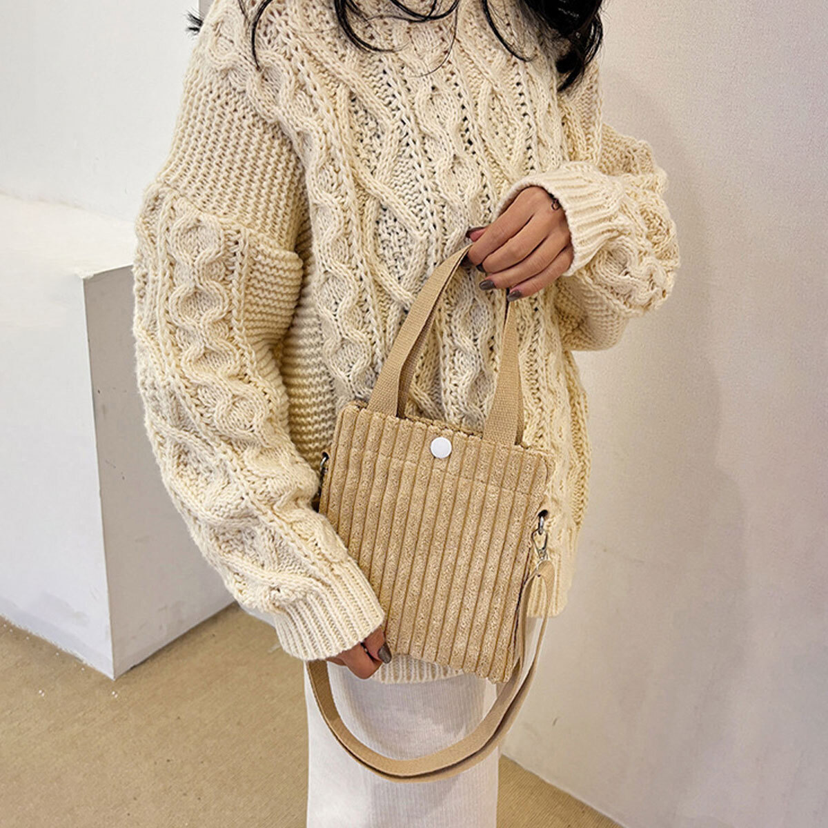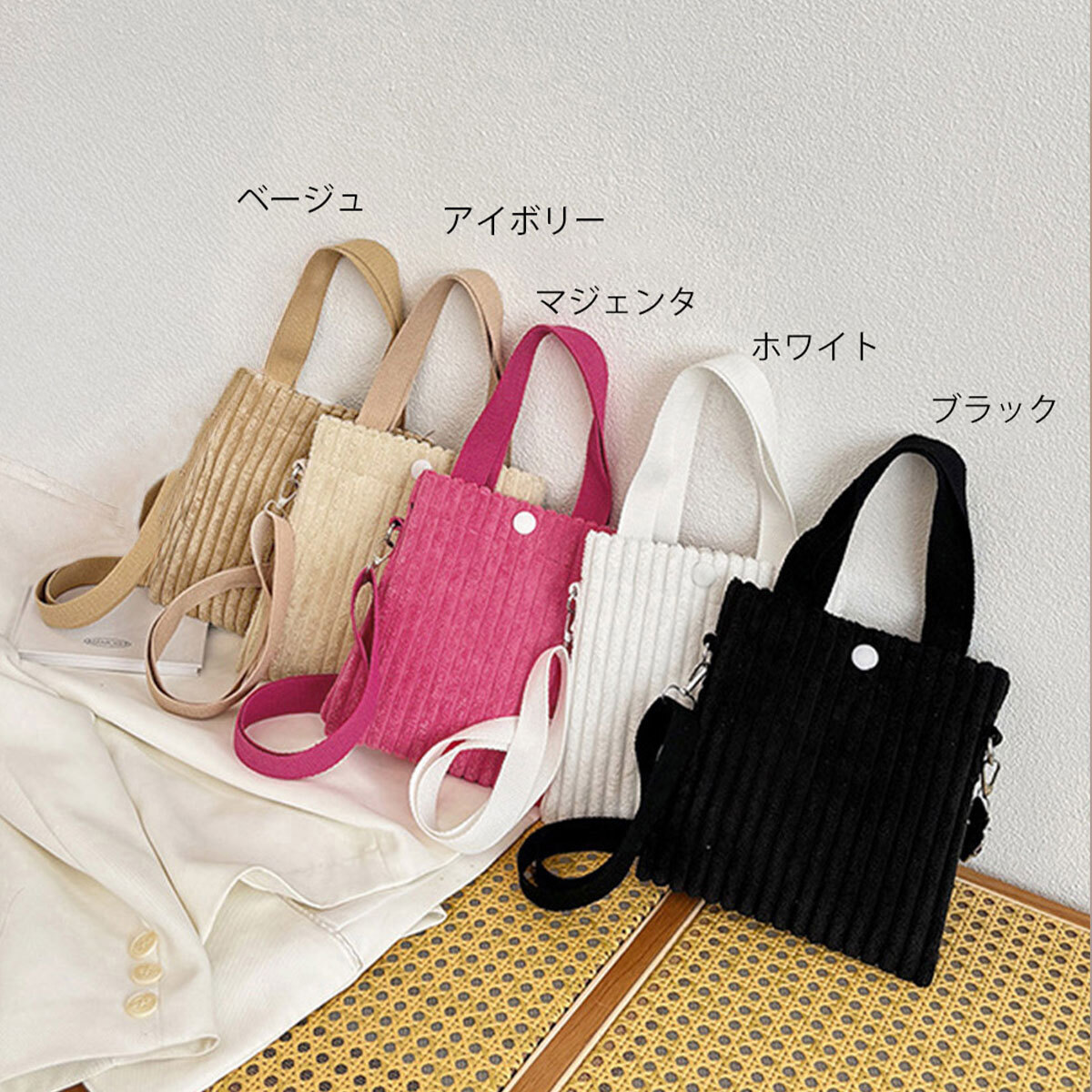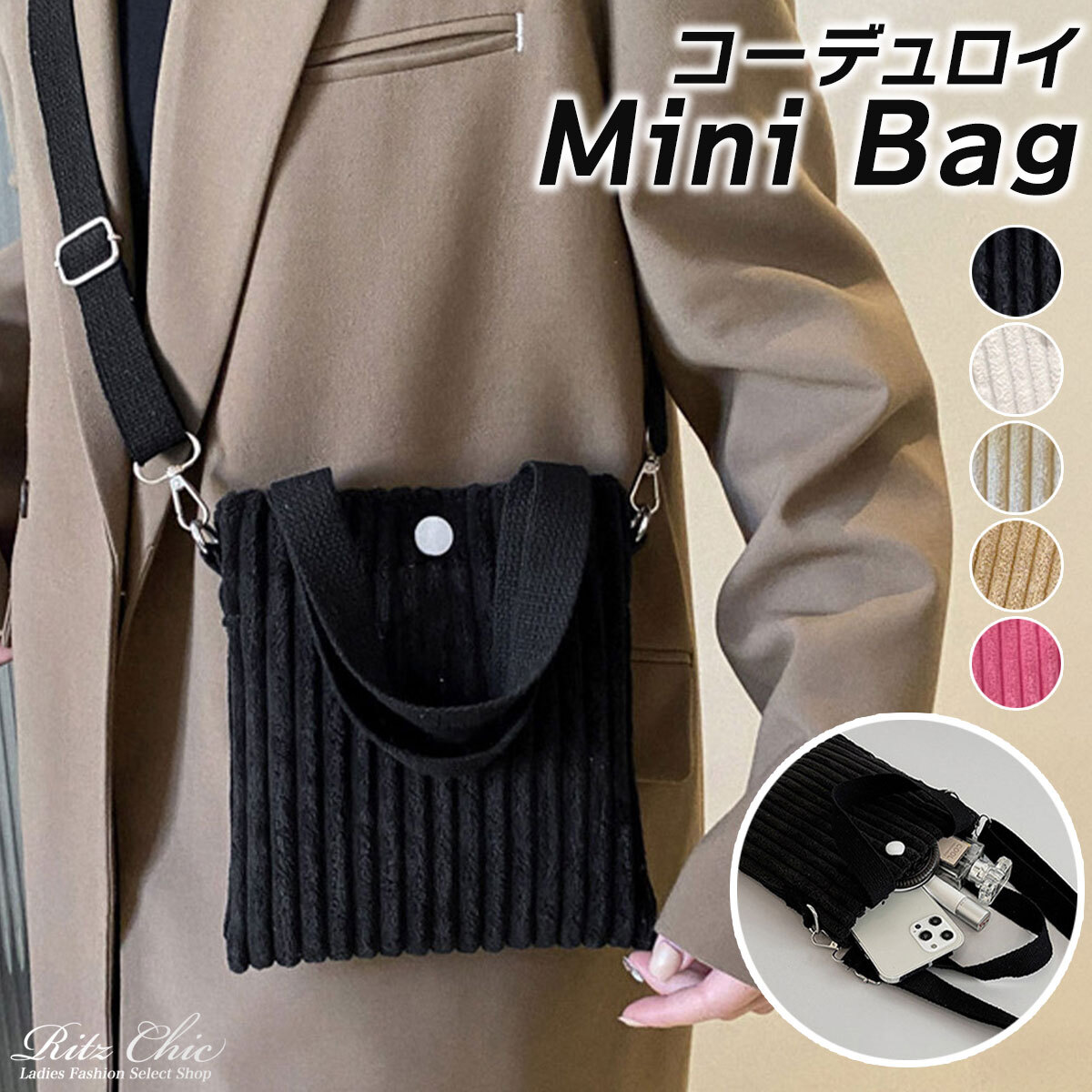 季節感のあるコーデュロイ素材を使用し、小さめのサイズ感と軽量設計で持ち運びがしやすい大人可愛いミニバッグです。