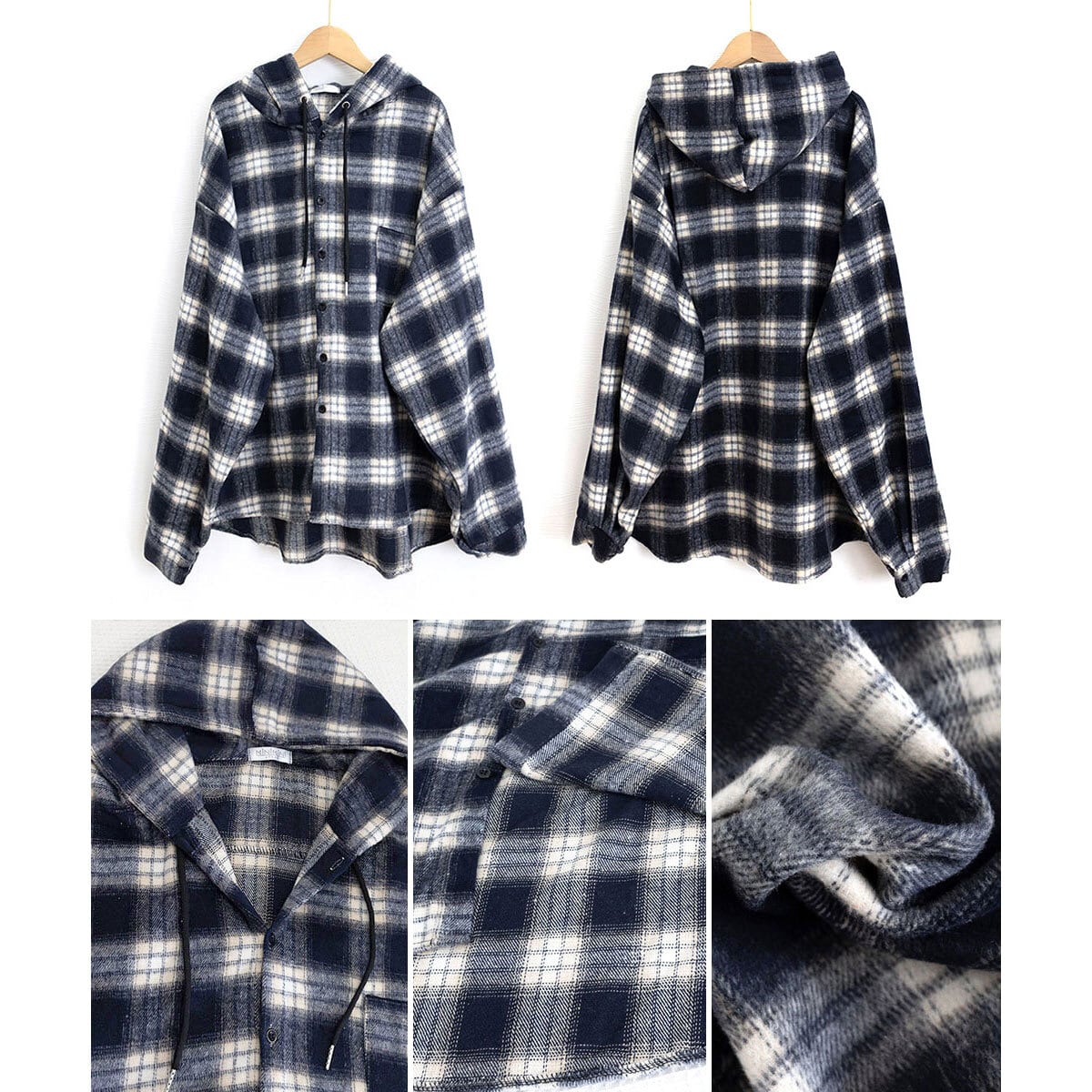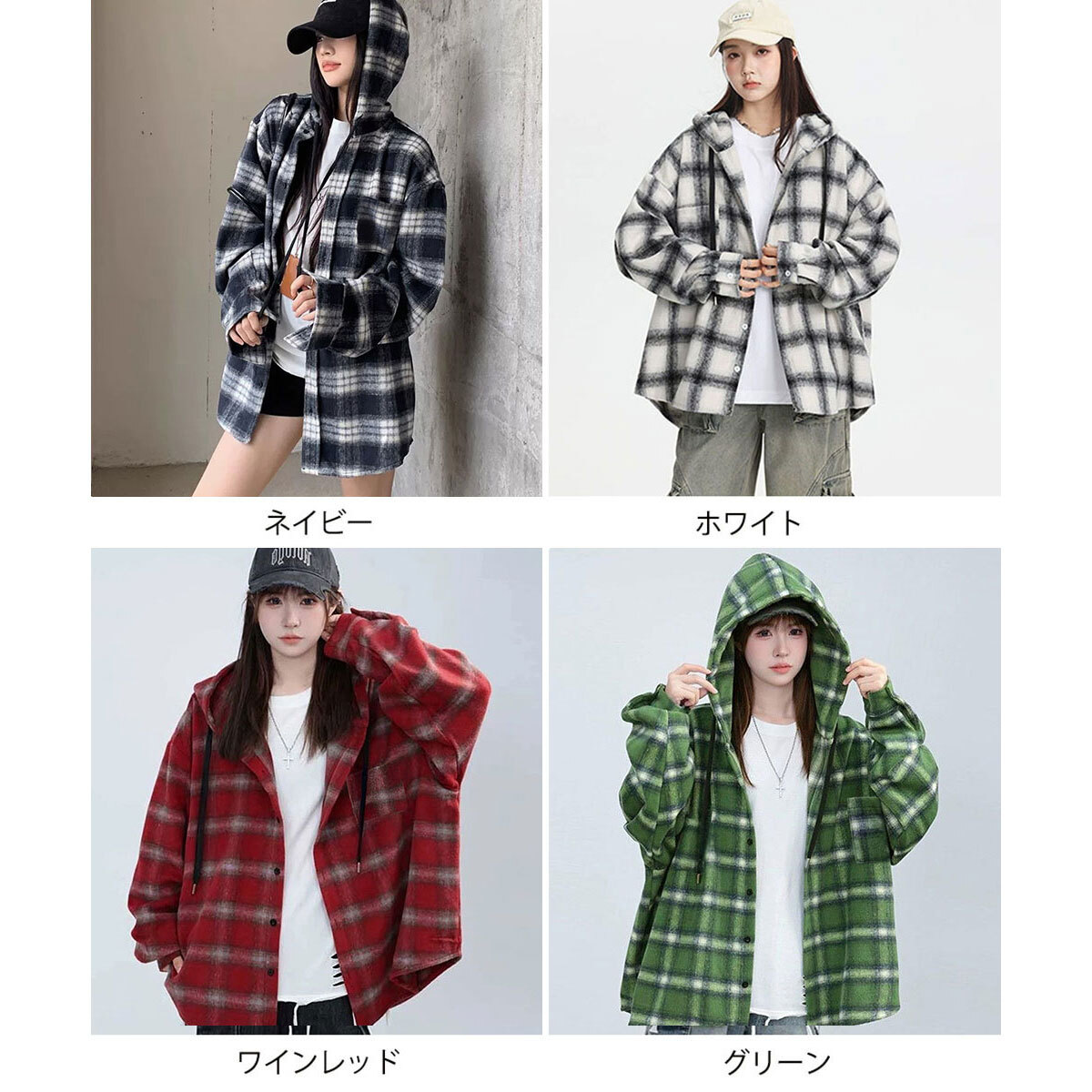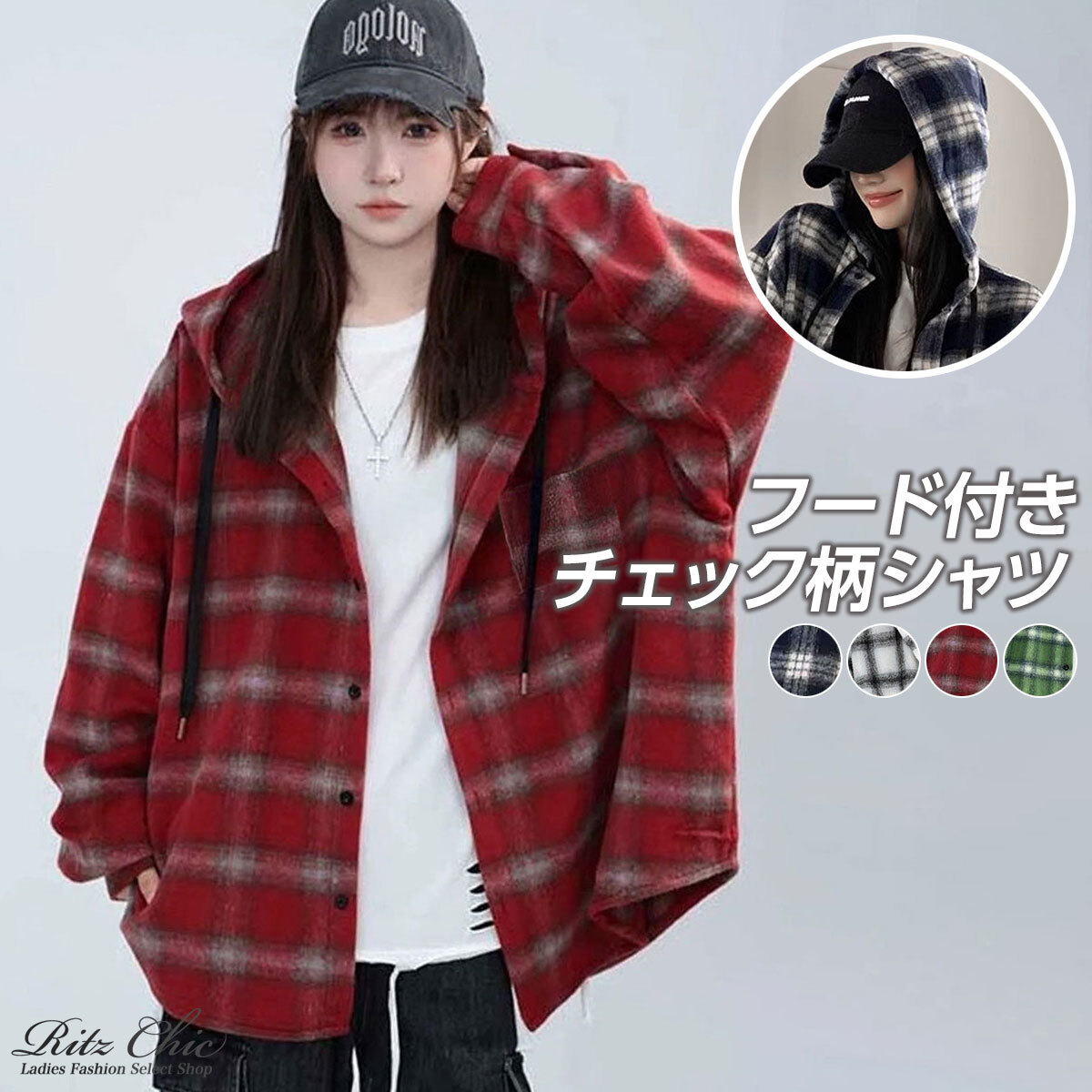 フード付き チェック柄 シャツ 長袖 レディース 春秋 起毛 韓国 大人 カジュアル ストリート アメカジ ゆったり オーバーサイズ 体型カバー レトロ おしゃれ 羽織り 大人可愛い 大人女子