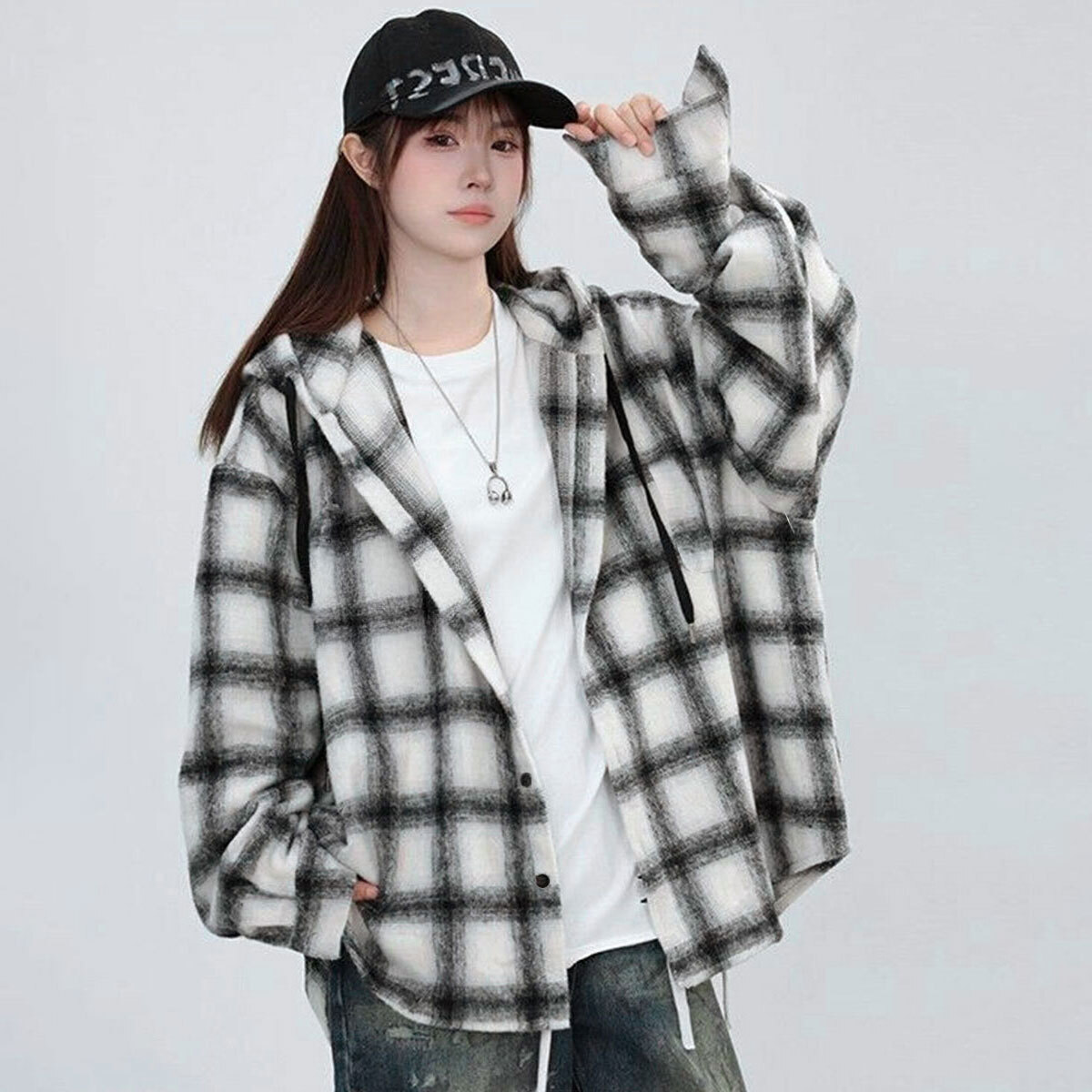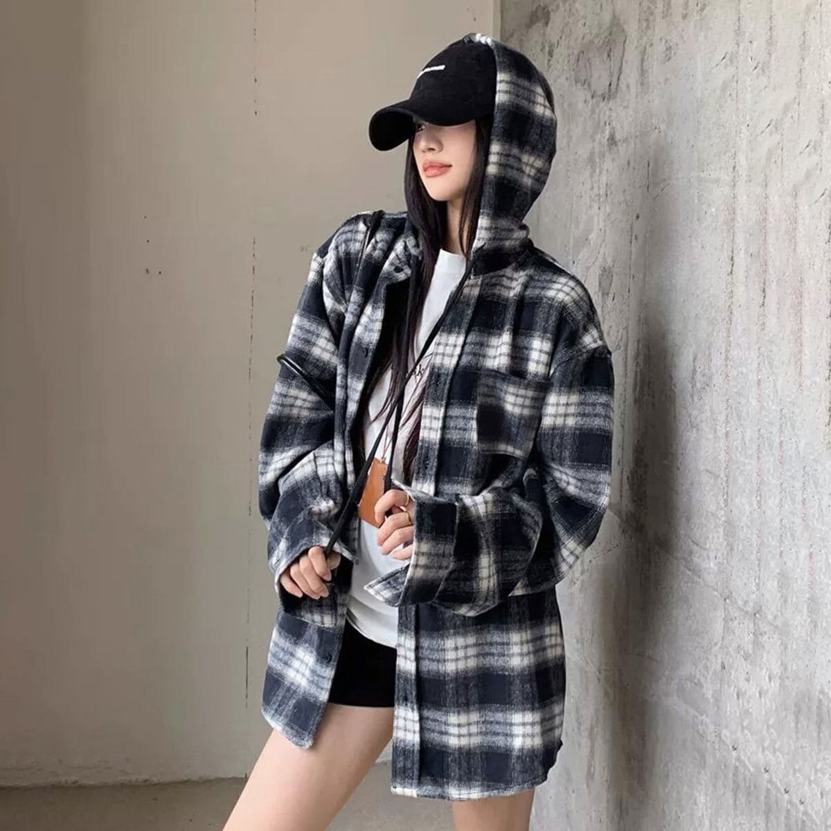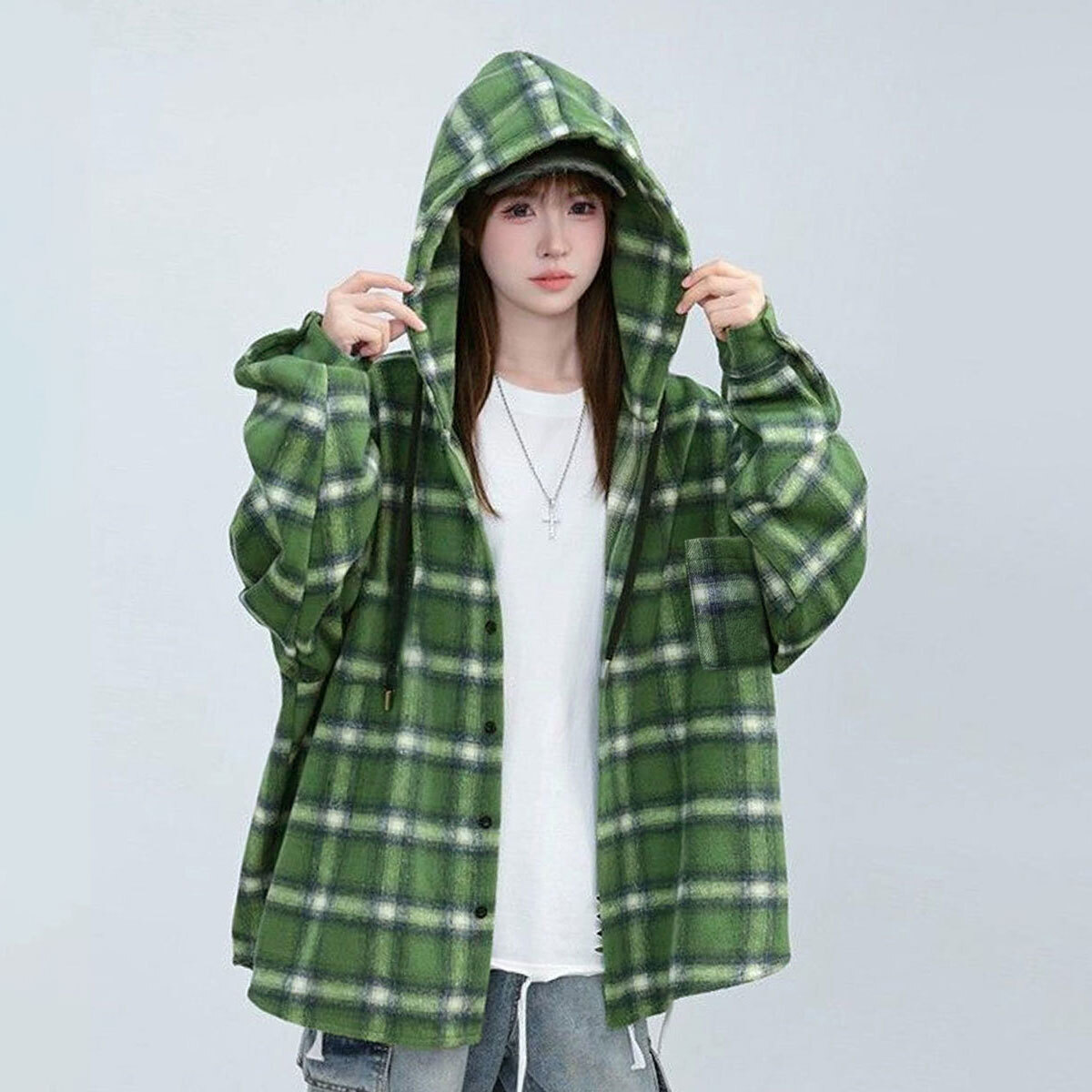 フード付き チェック柄 シャツ 長袖 レディース 春秋 起毛 韓国 大人 カジュアル ストリート アメカジ ゆったり オーバーサイズ 体型カバー レトロ おしゃれ 羽織り 大人可愛い 大人女子