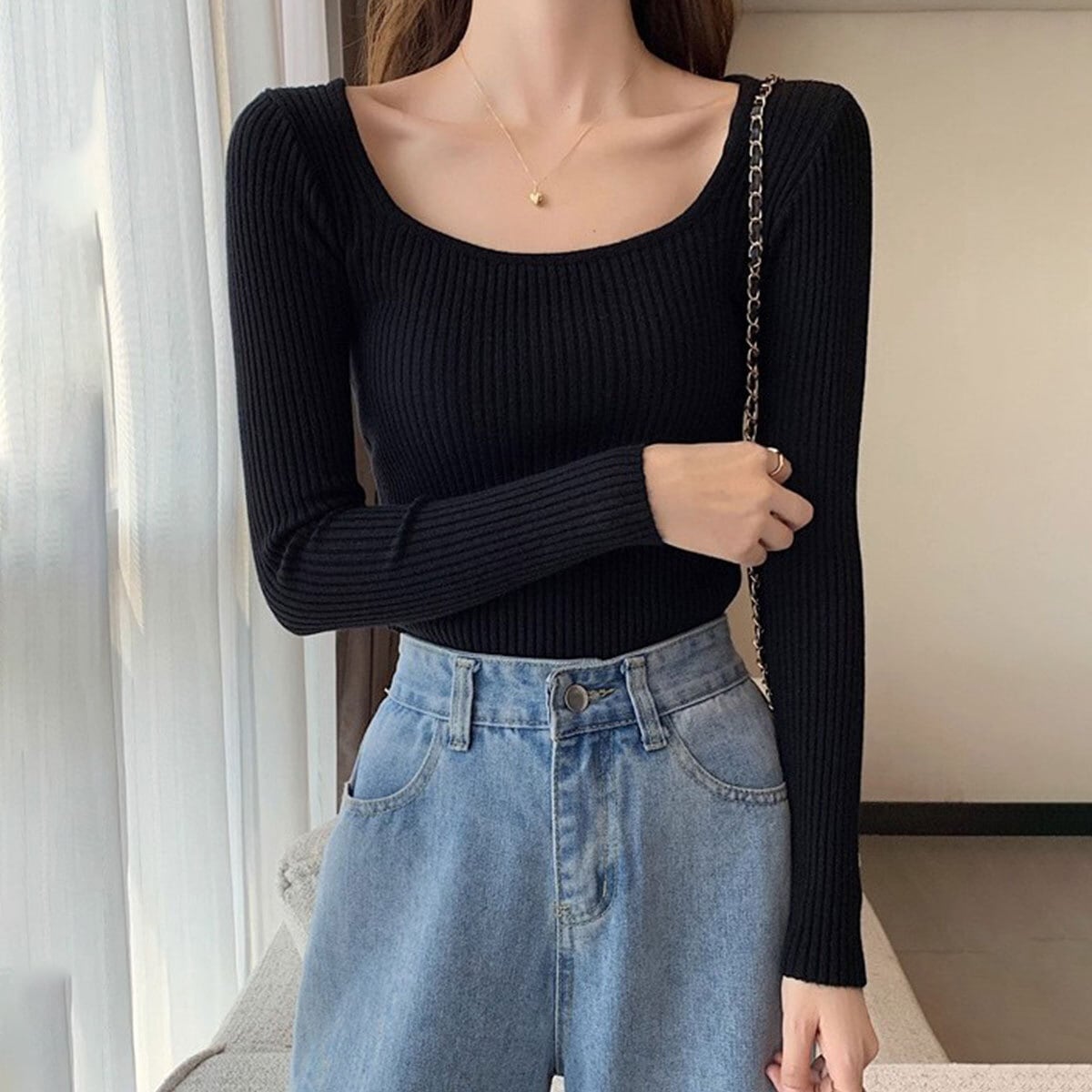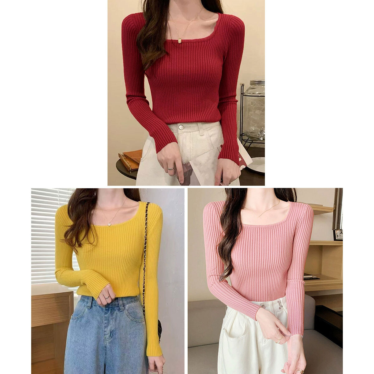 シンプルなリブ編みデザインに、顔周りをすっきりと見せる広めのスクエアネックで、大人の女性らしさを引き立ててくれる長袖のニットトップスです。