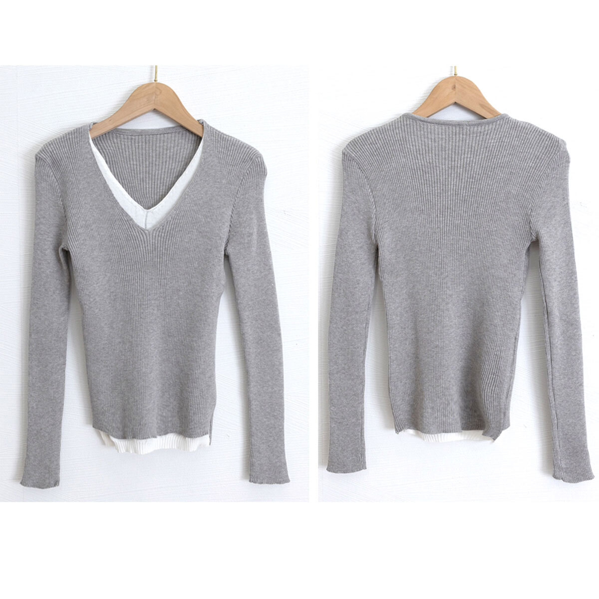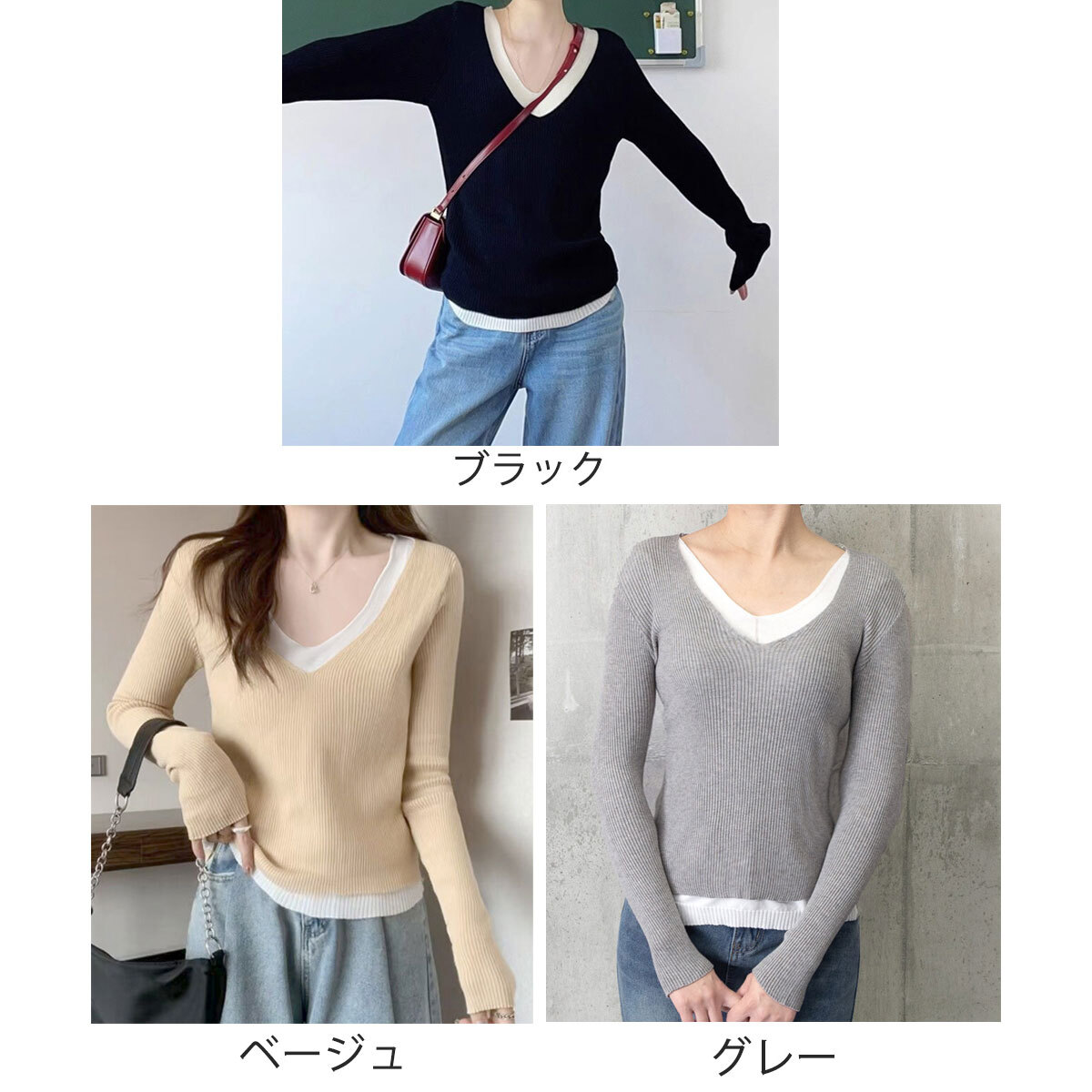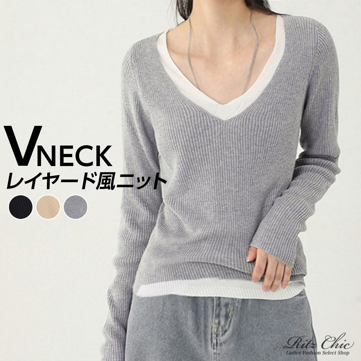 レイヤード風 ニット 長袖 トップス レディース 春秋冬 韓国 重ね着風 Vネック 大人 きれいめ カジュアル おしゃれ リブニット 薄手 無地 インナー 大人可愛い 大人女子
