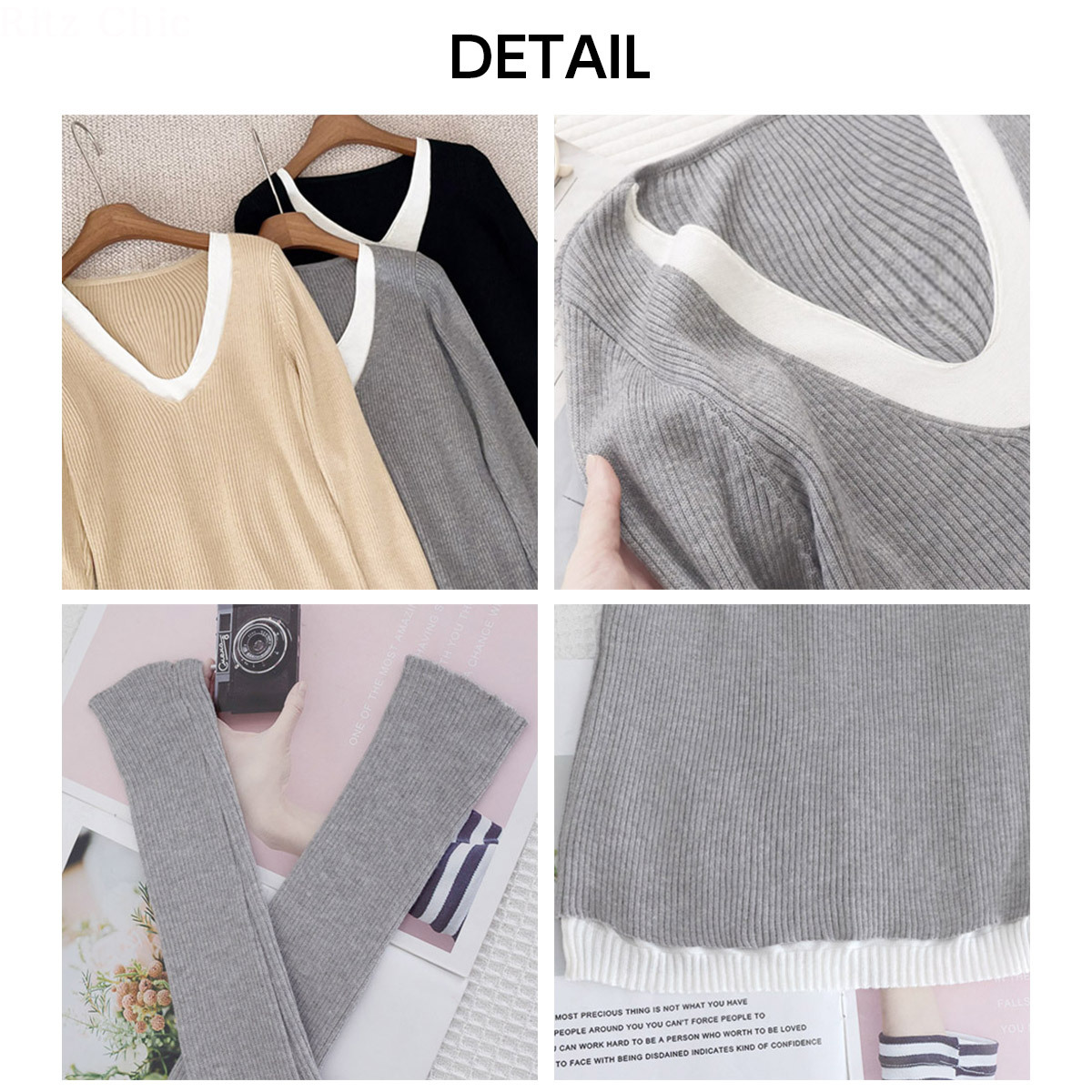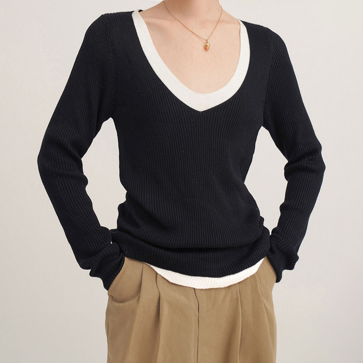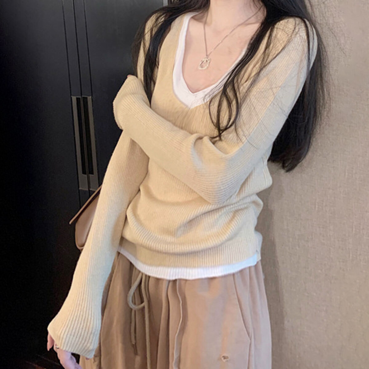 レイヤード風 ニット 長袖 トップス レディース 春秋冬 韓国 重ね着風 Vネック 大人 きれいめ カジュアル おしゃれ リブニット 薄手 無地 インナー 大人可愛い 大人女子