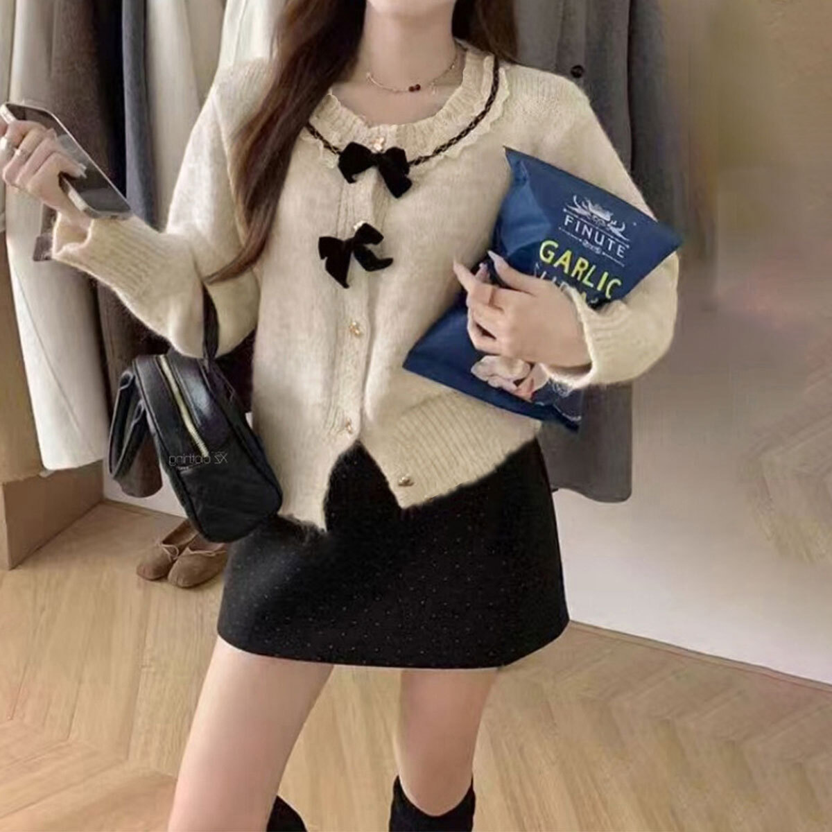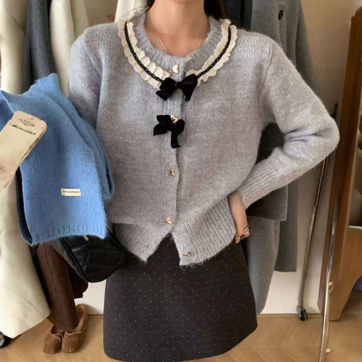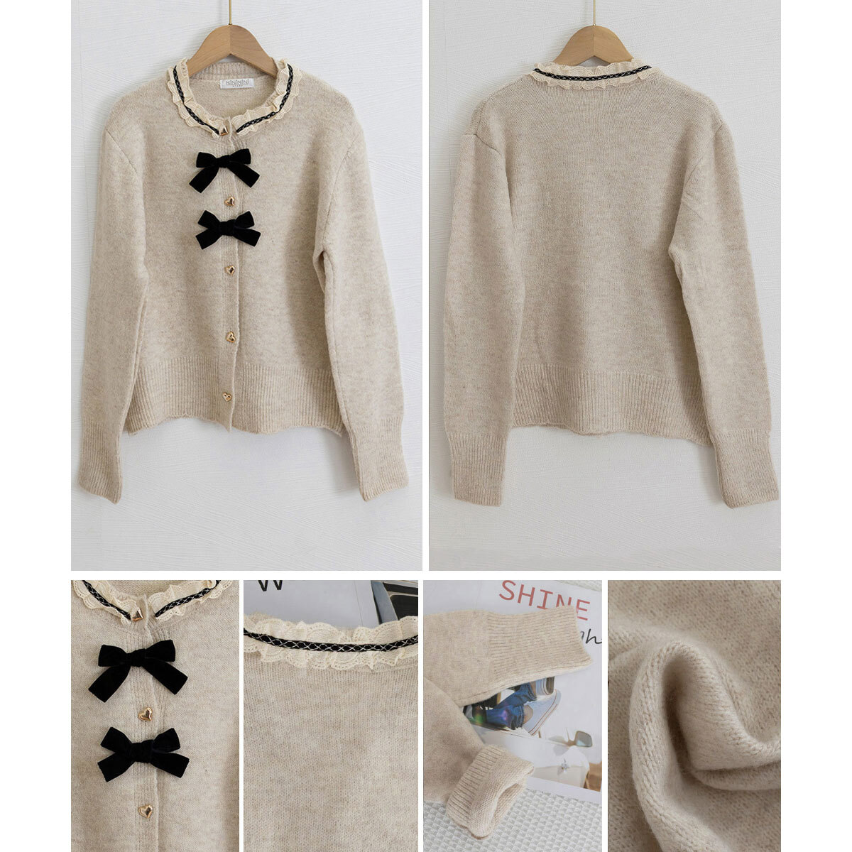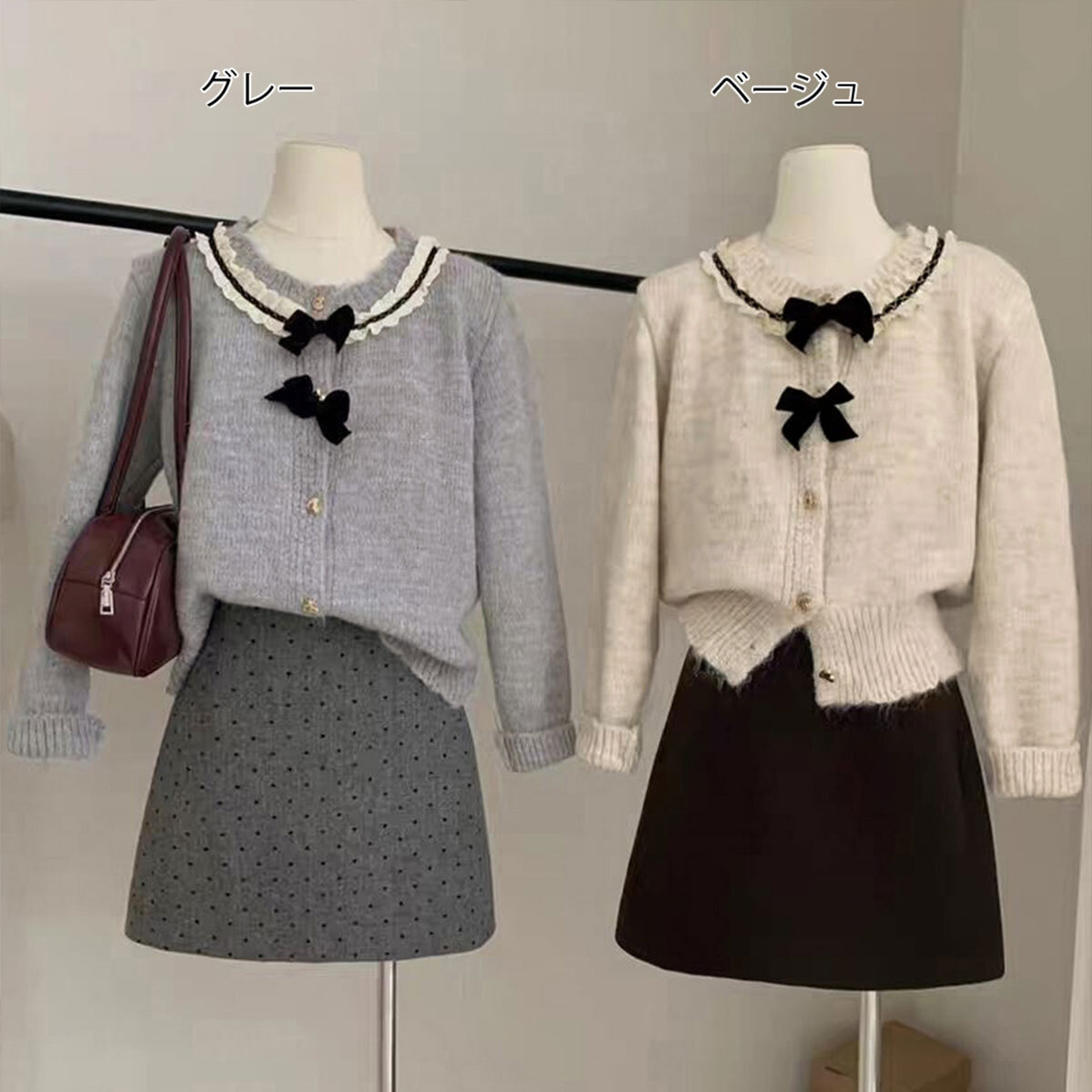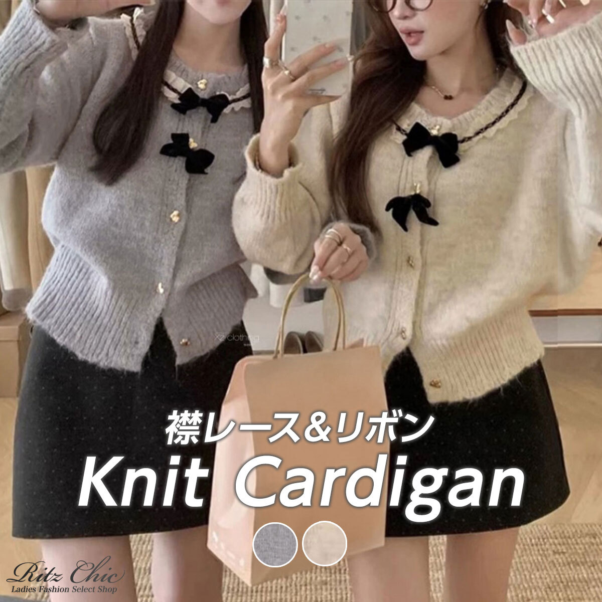 ニット カーディガン 長袖 レディース 春秋冬 韓国 レトロ きれいめ フェミニン 大人 かわいい 襟レース リボン フリル おしゃれ ハートボタン ショート丈 大人可愛い 大人女子
