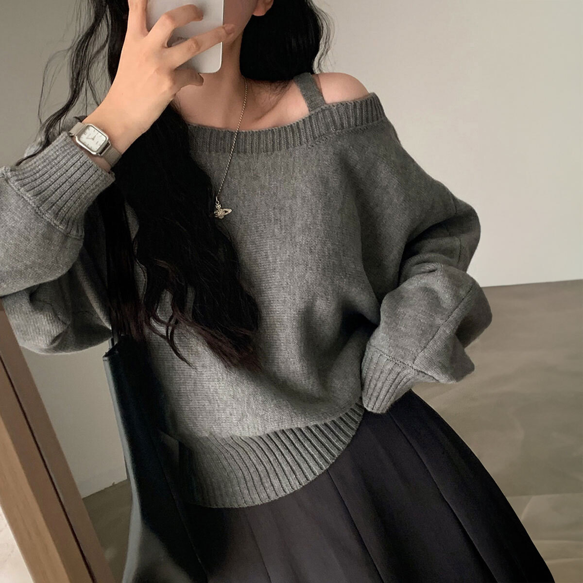ストラップ付きのオフショルダーなので、さりげなく女性らしさをプラスして、肩を大胆に見せるデザインがトレンド感を与えつつ、大人可愛い着こなしを叶えます。