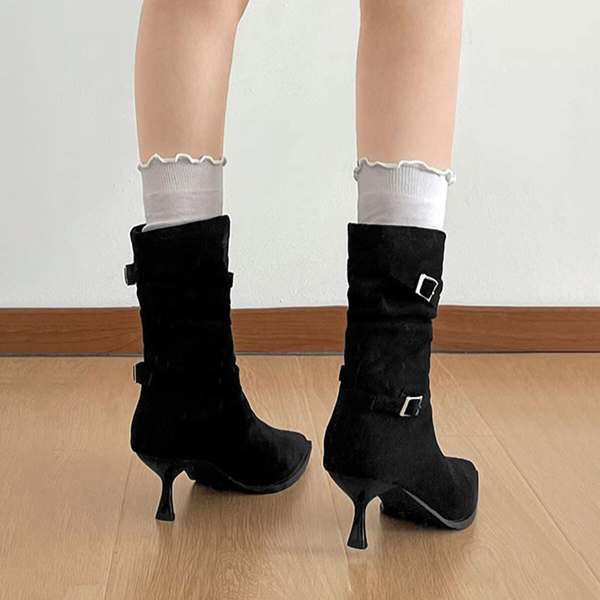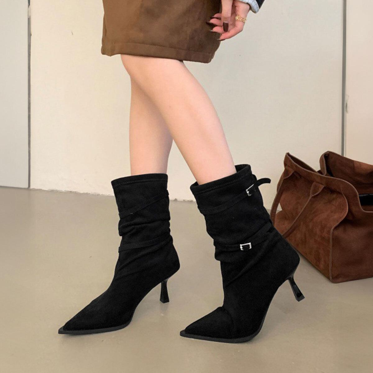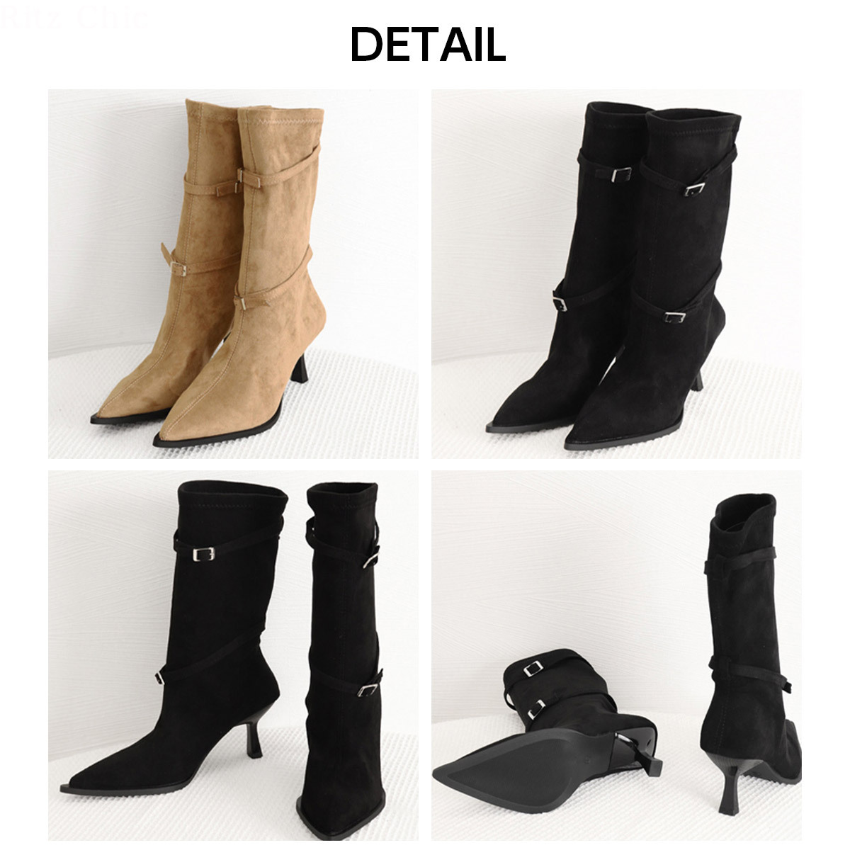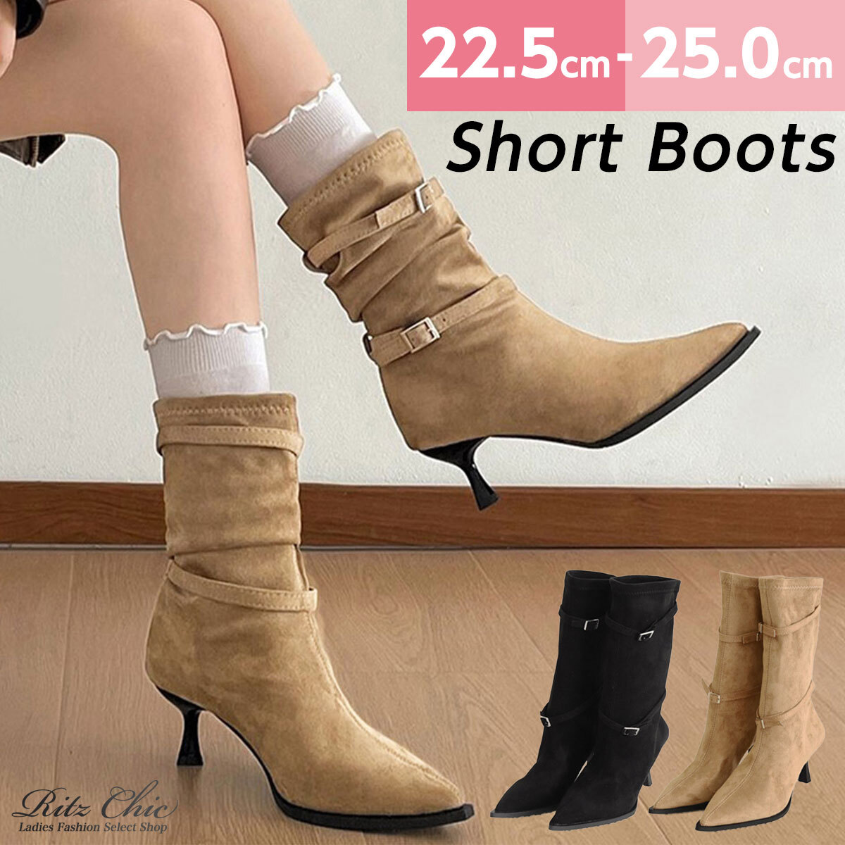 しなやかなスエード調の素材で、中筒部分の細身ベルトが大人の女性らしい上品さを添える、ショートブーツです。