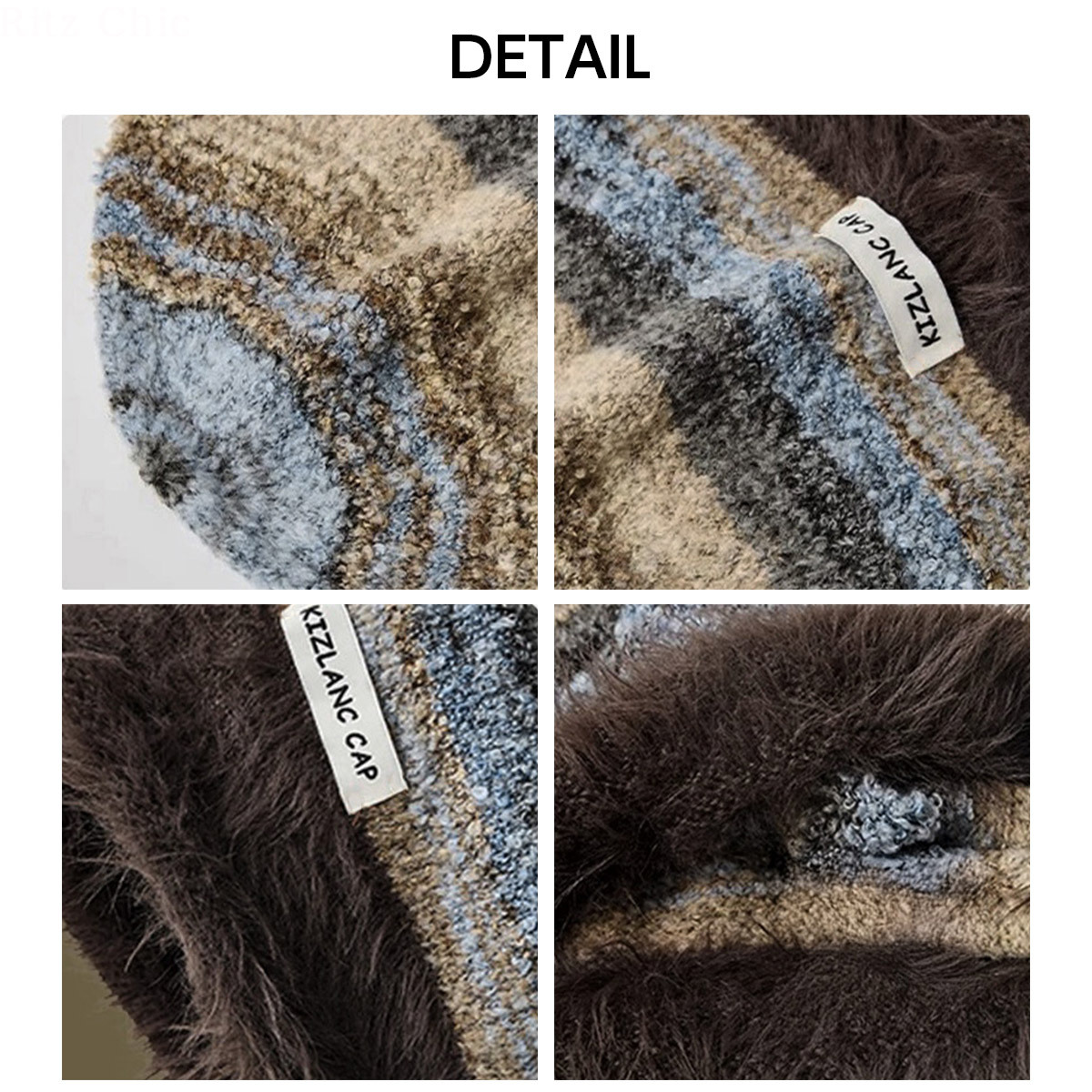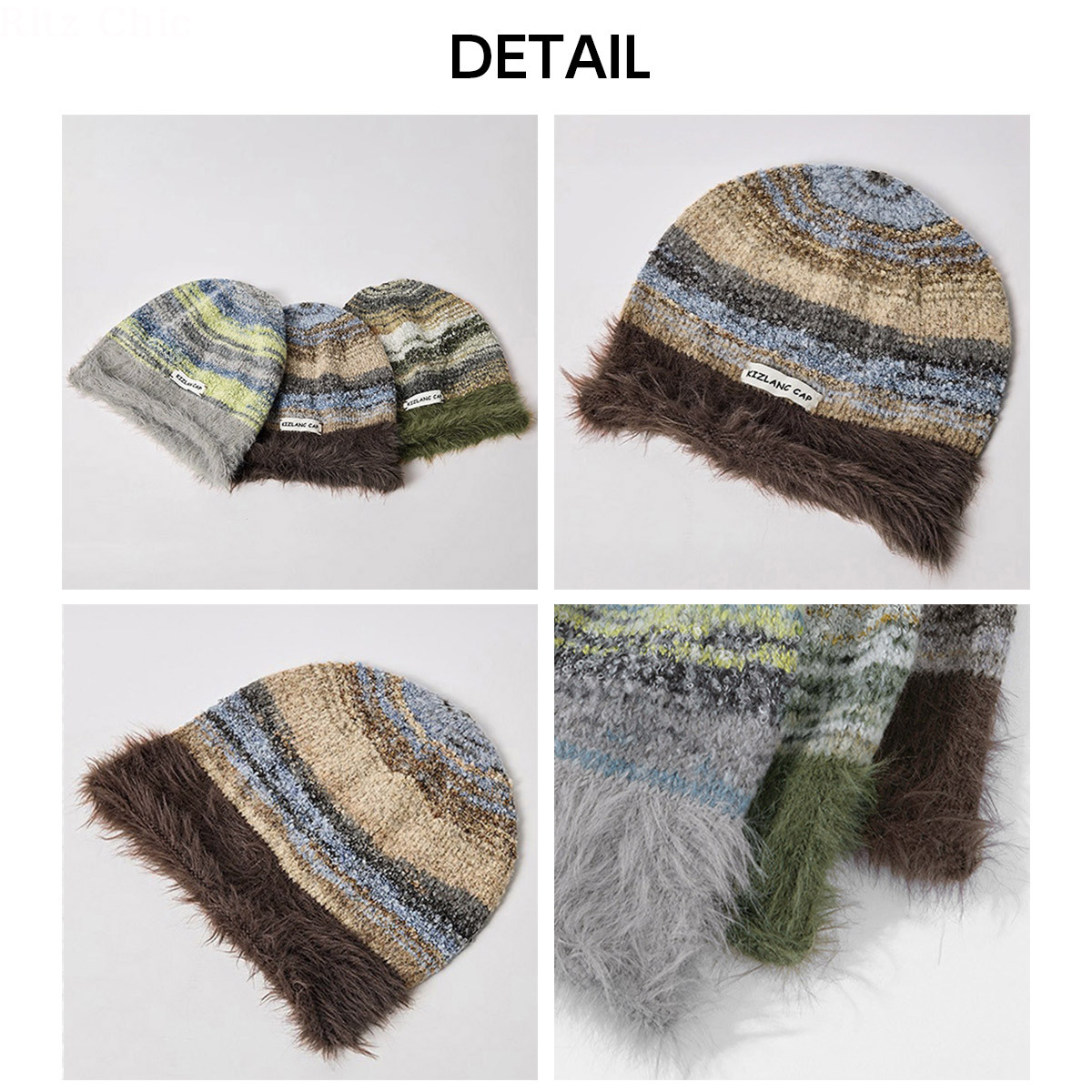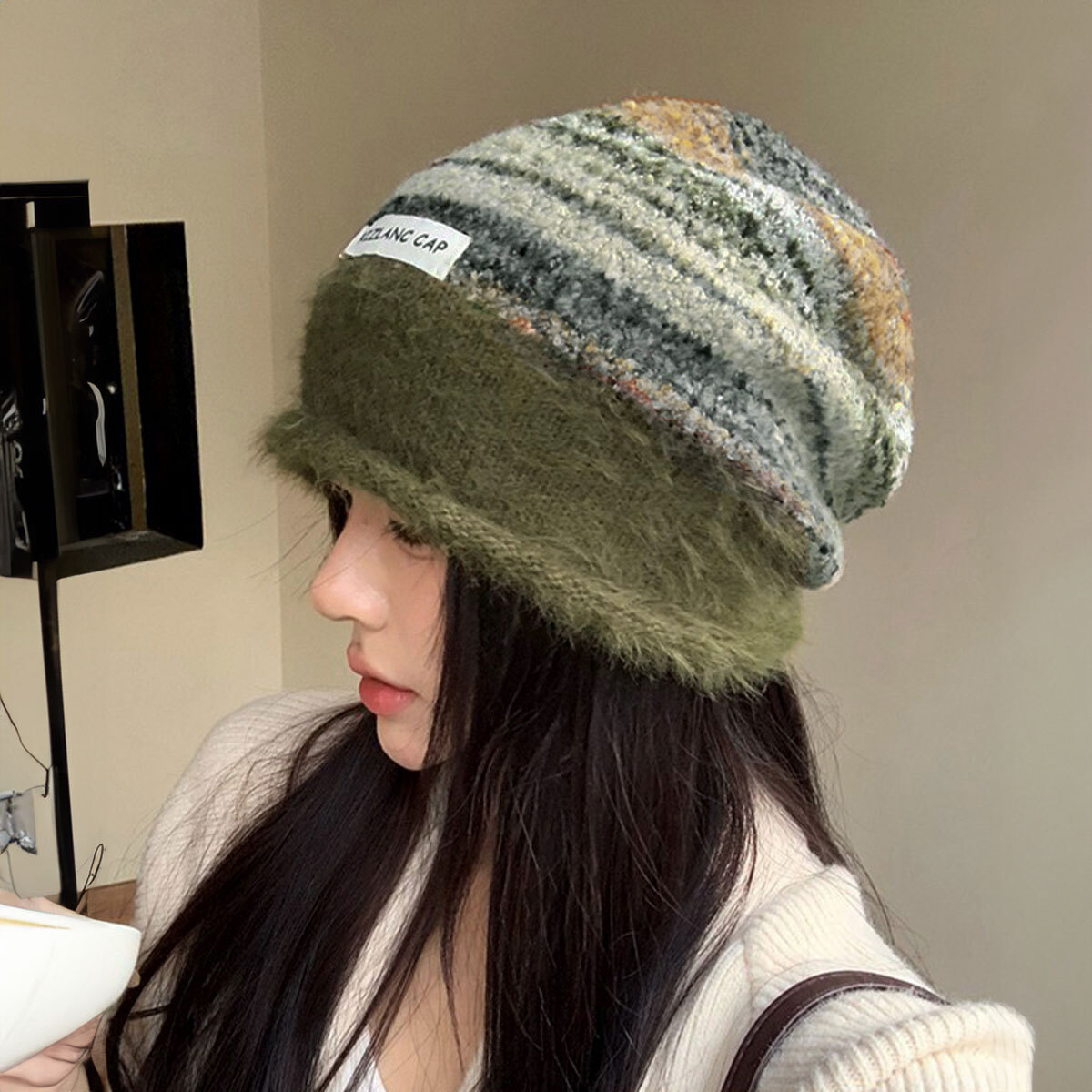 ふわふわと柔らかな毛足が魅力のポイントになっていて、ふわふわと暖かみのある印象が秋冬らしいシーズンムードを盛り上げてくれる配色ニット帽です。