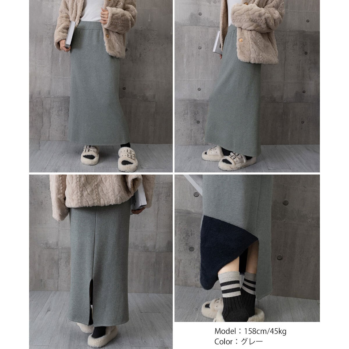 裏起毛仕様で暖かさと快適さを両立し、寒い季節でも安心してお洒落を楽しめるニットスカートです。