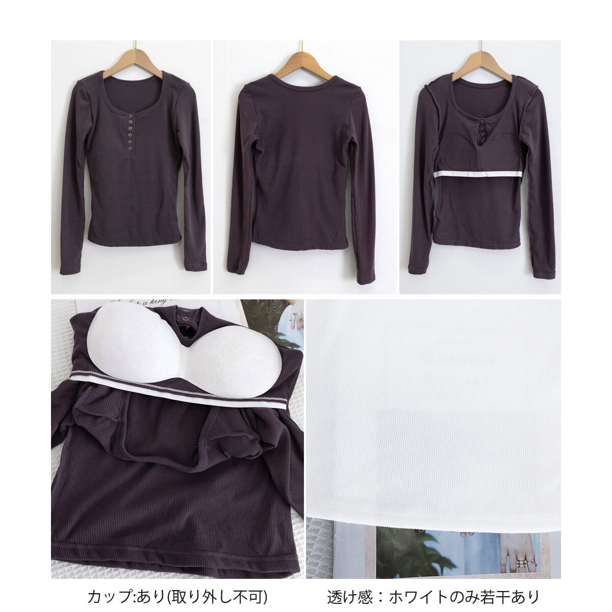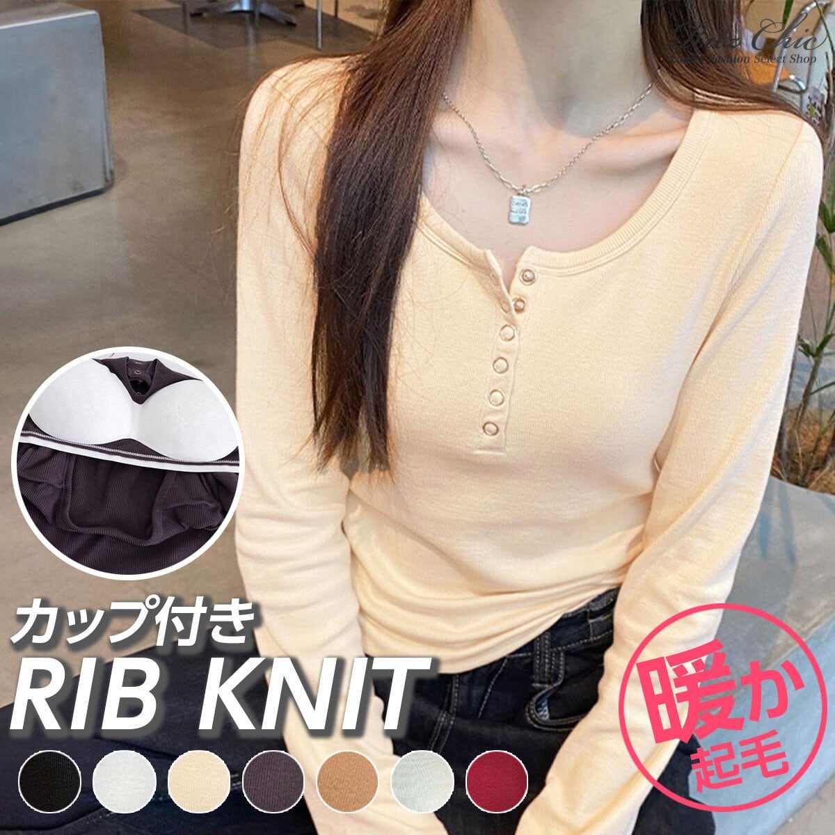 カップ付き リブニット 暖か インナー レディース 秋冬 韓国 ヘンリーネック 防寒 保温 きれいめ おしゃれ 大人 シンプル カジュアル パッド入り 長袖 カットソー 大人可愛い 大人女子