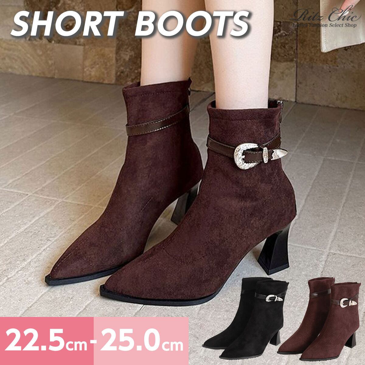 筒周りに細めベルトとシルバーパーツを加え、華やかさと女性らしさを演出してくれるきれいめデザインのショートブーツです。