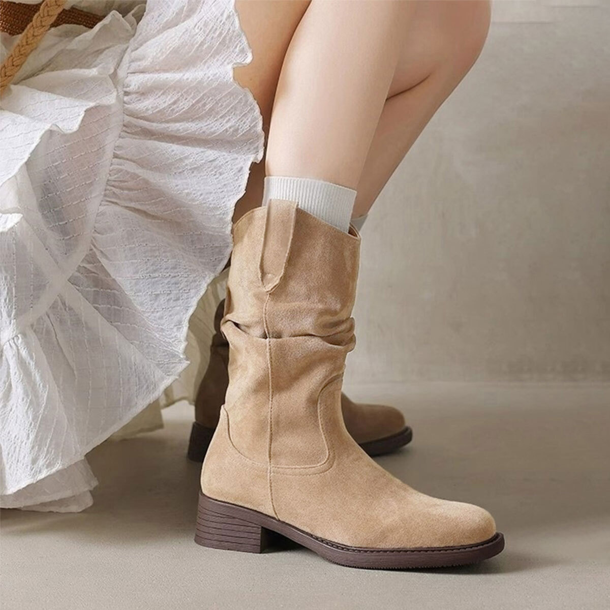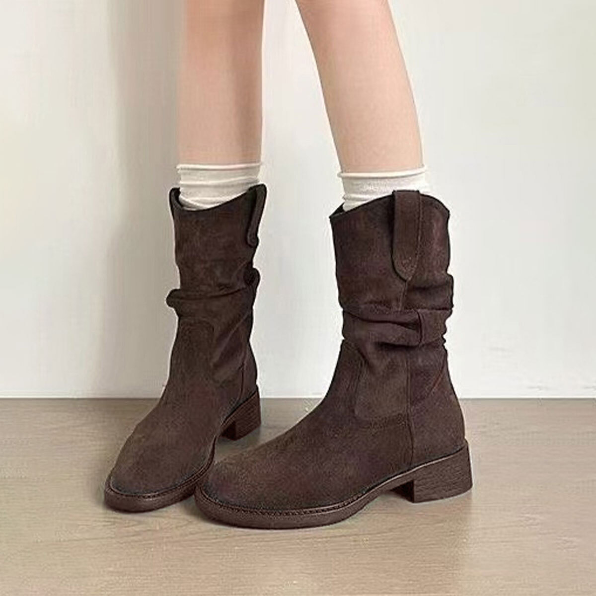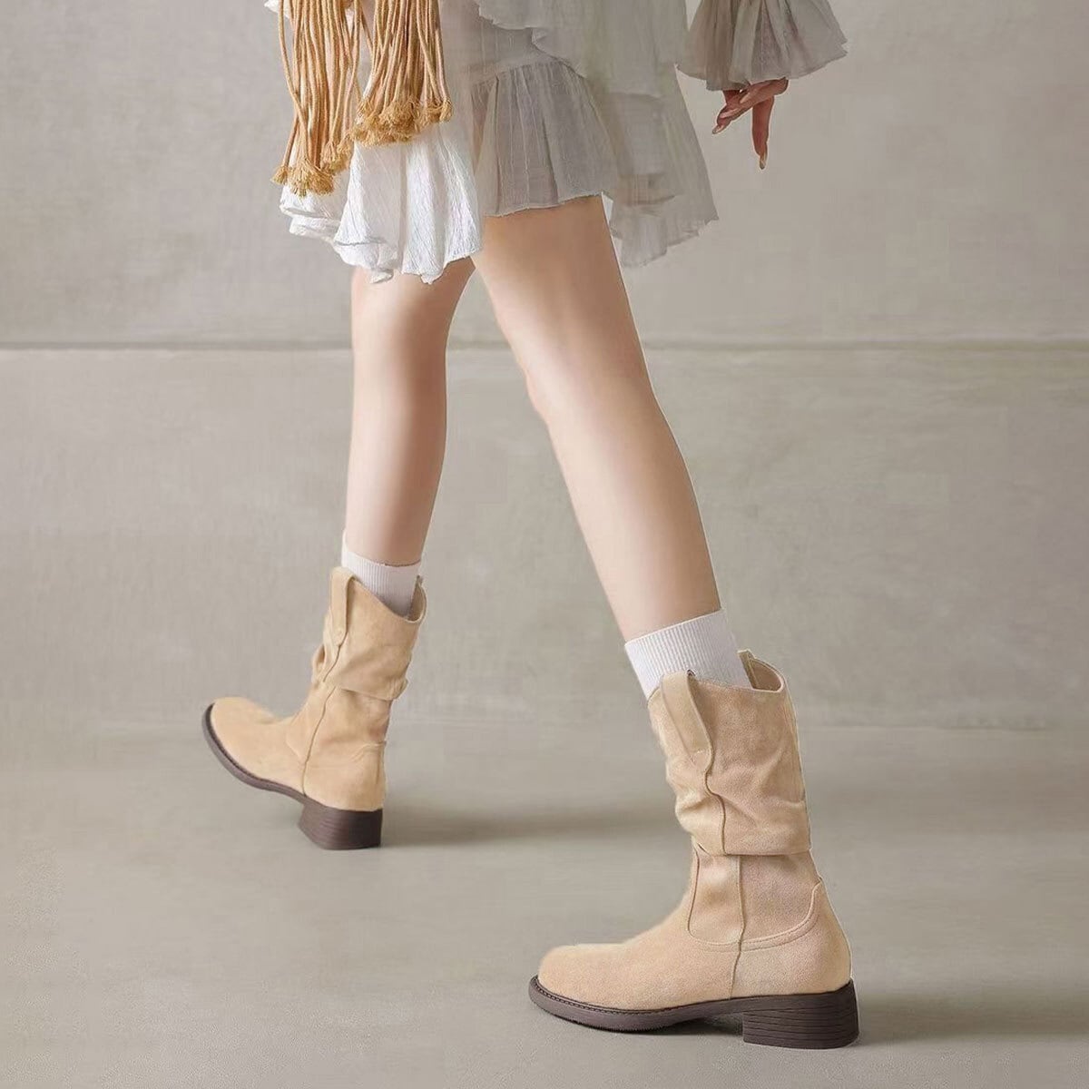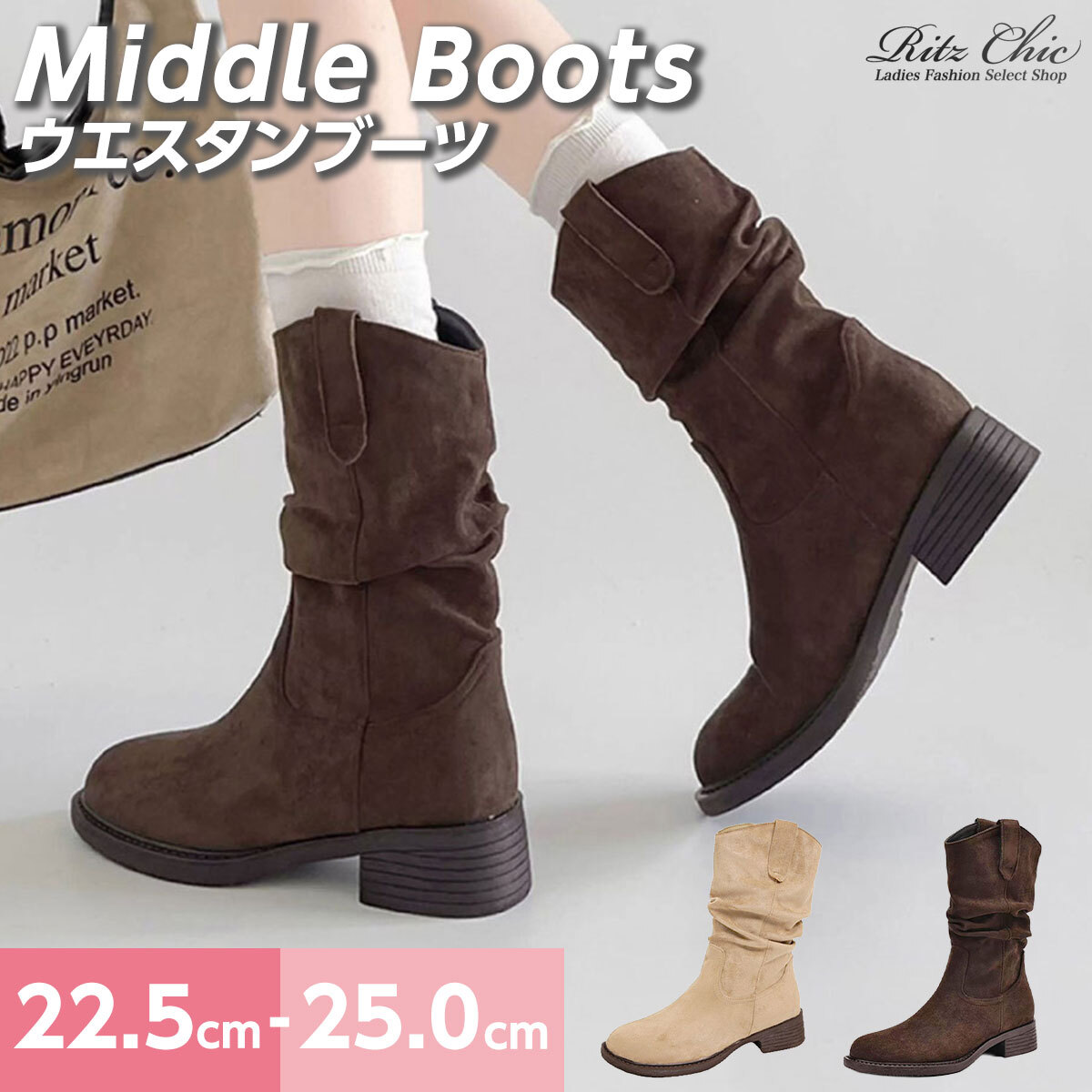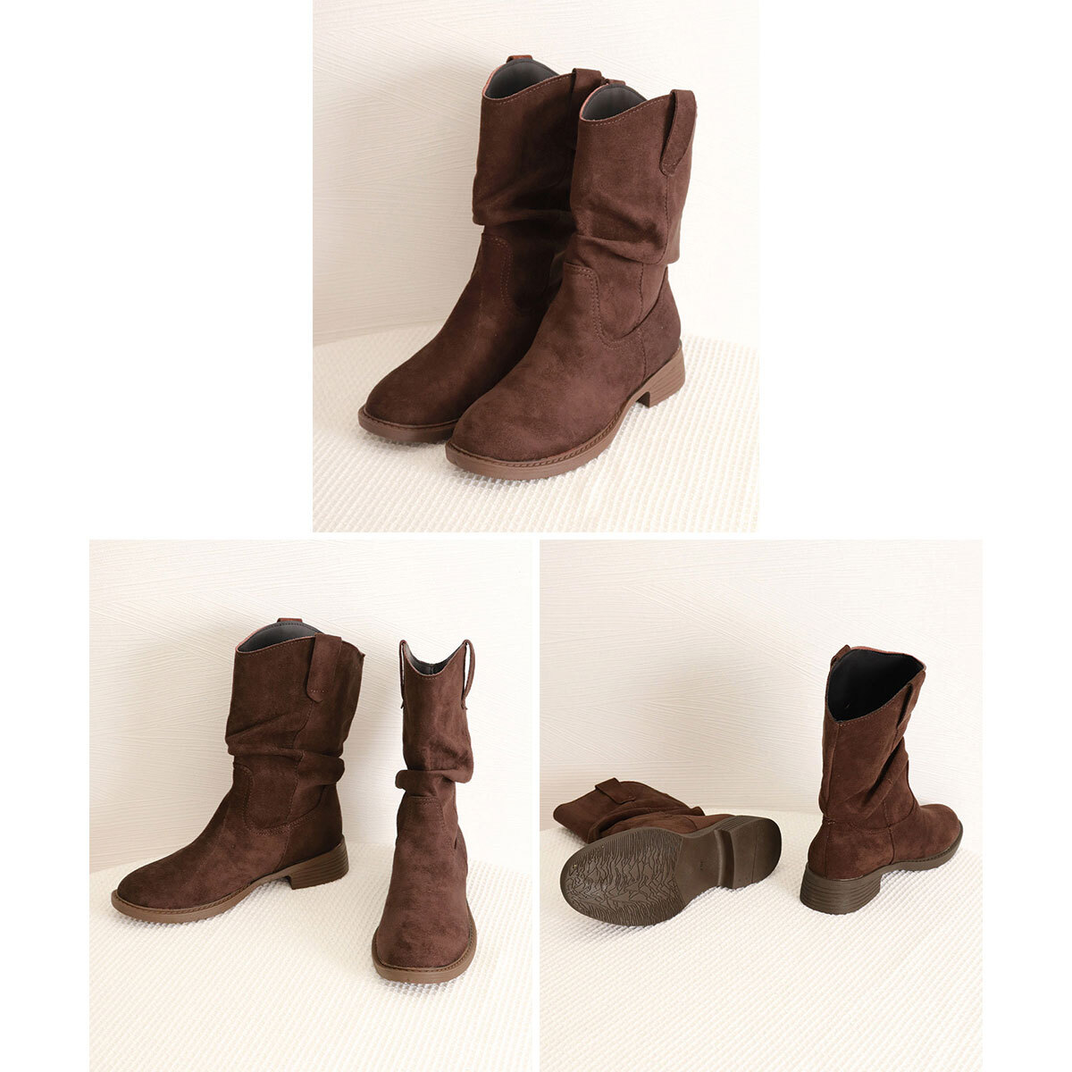 程よい高さのミドル丈に、くしゅくしゅっとしたシルエットが脚を美しく綺麗に見せて、足元に優雅な印象を与えてくれるウエスタンスタイルのミドルブーツです。