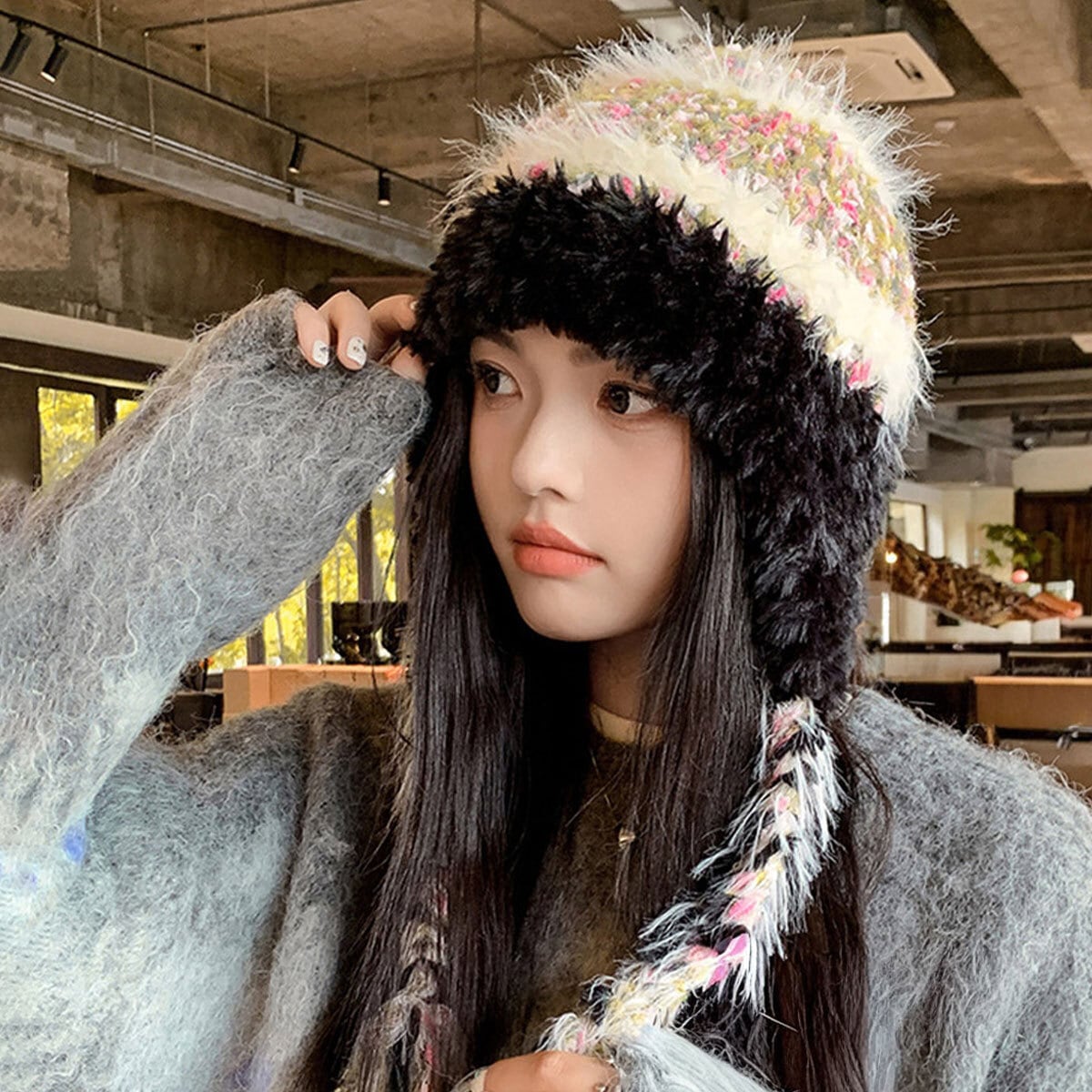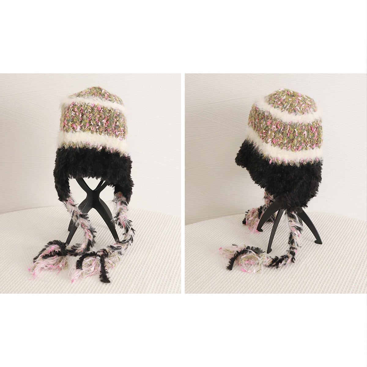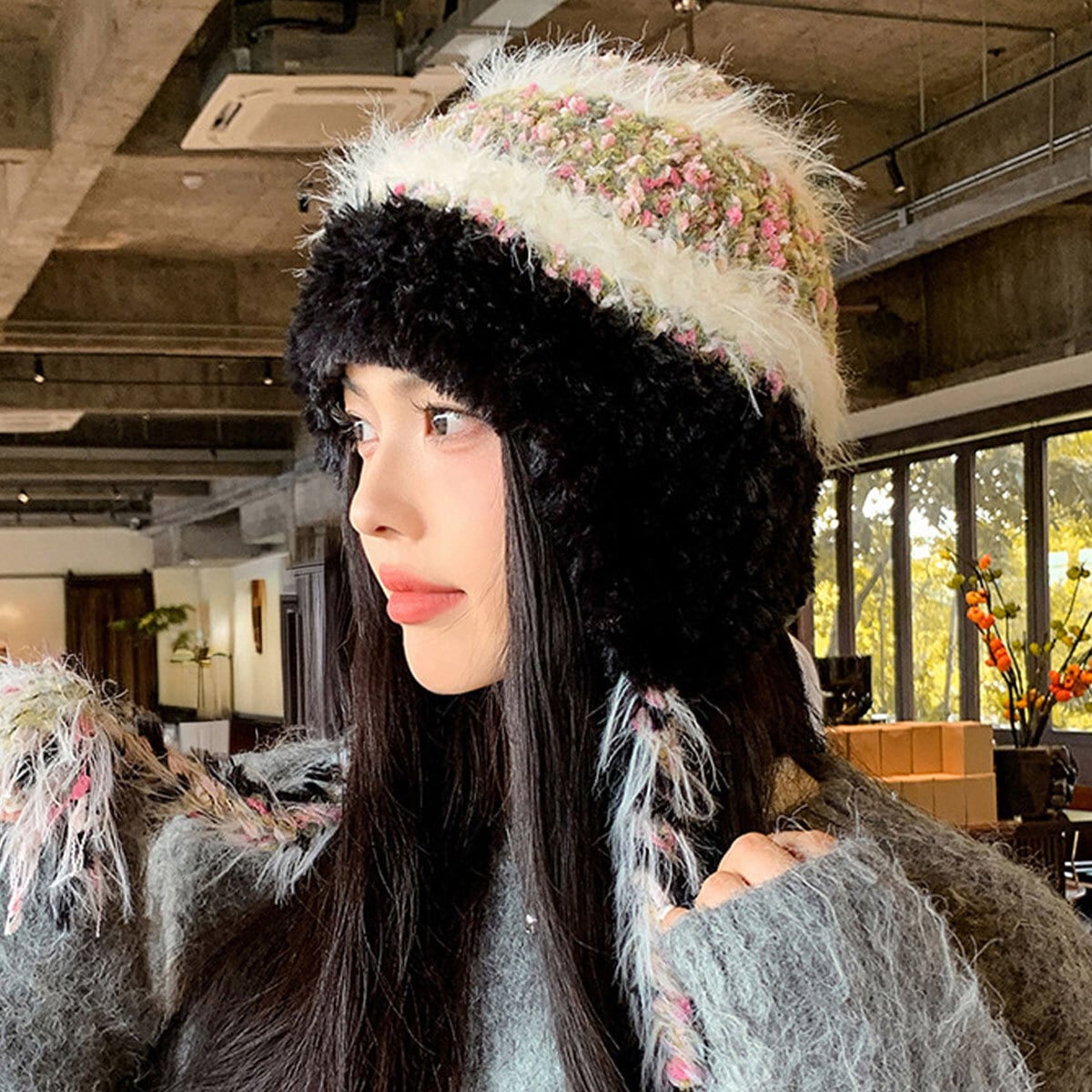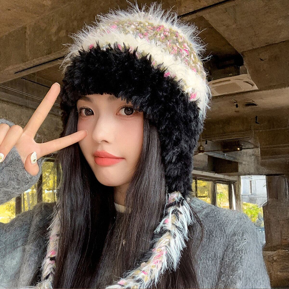 ふわふわのボア素材とニット素材を組み合わせたデザインで、配色のカラーリングがお洒落で可愛く、秋冬に嬉しい防寒性にも優れたニット帽です。