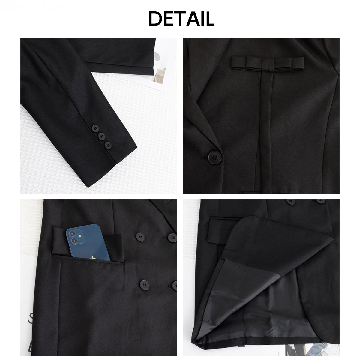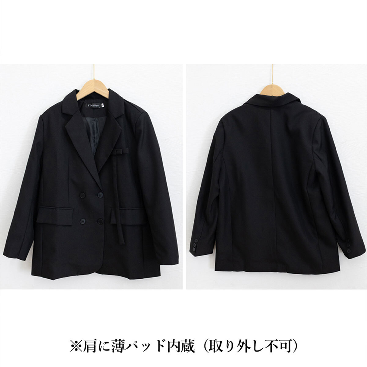 胸元にあしらった上品なリボンのデティールがポイントになり、シンプルながらも女性らしさを引き立てくれるダブルボタンのテーラードジャケットです。