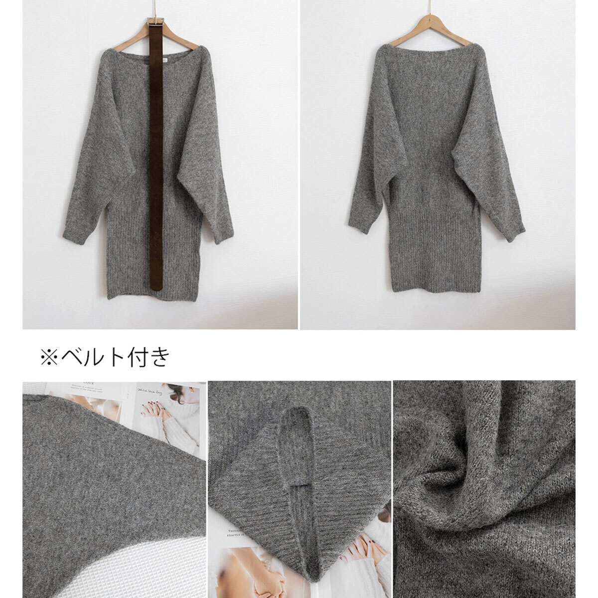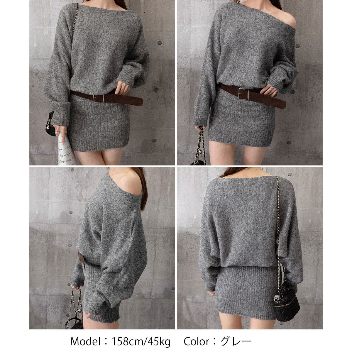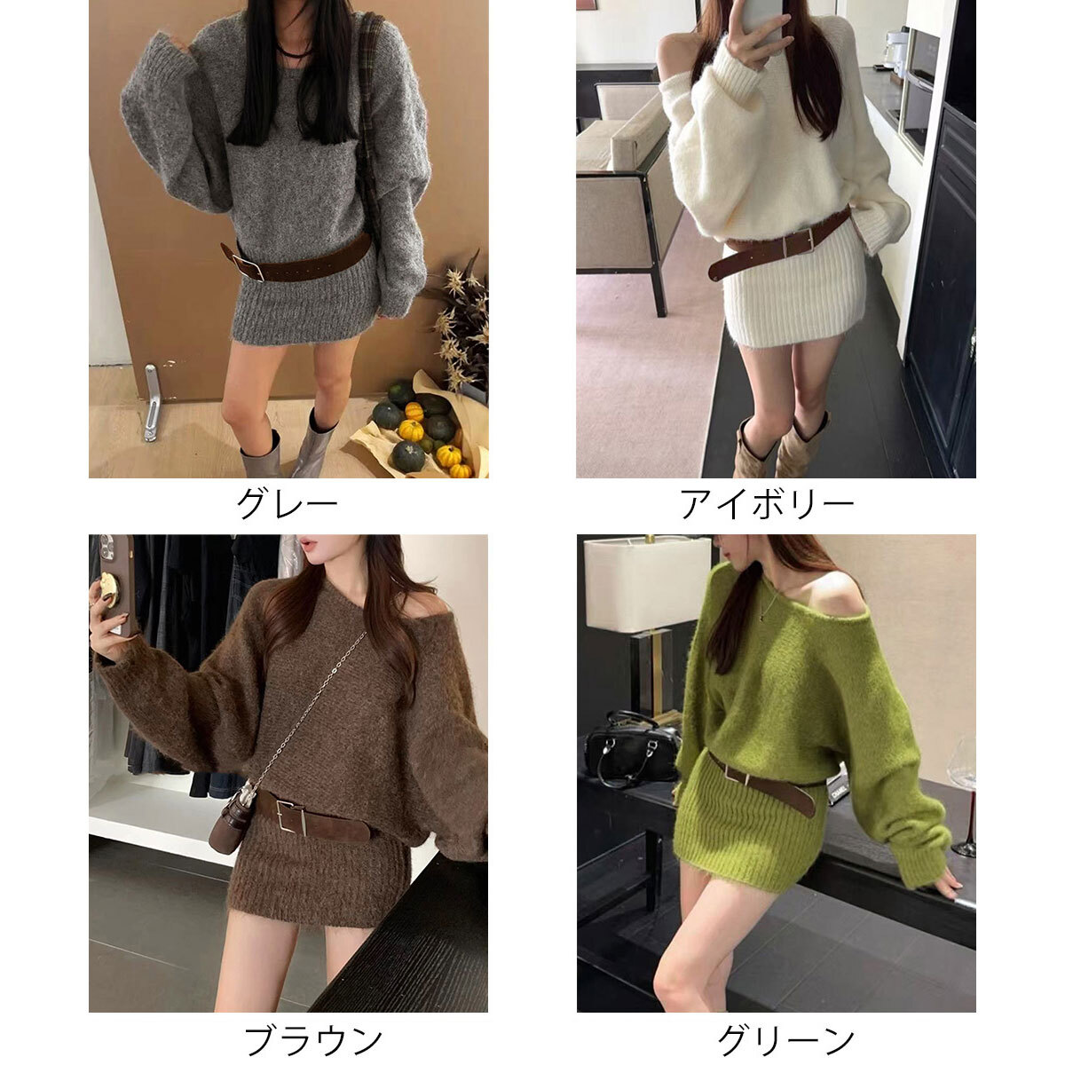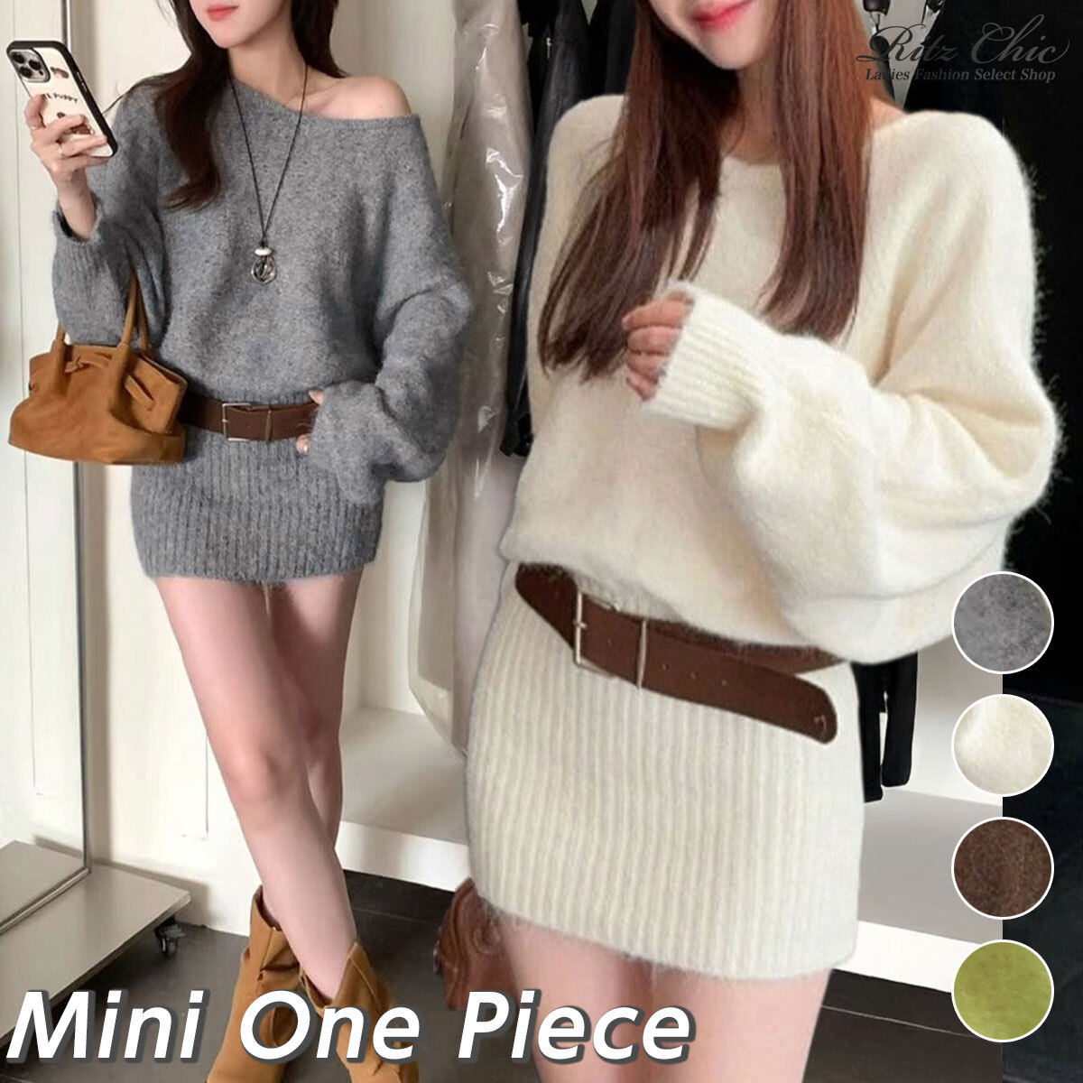 ミニワンピース ニット シャギー 長袖 レディース 秋冬 韓国 ワンピース ウエストマーク きれいめ 大人 カジュアル 肩出し オフショルダー セットアップ風 大人可愛い 大人女子