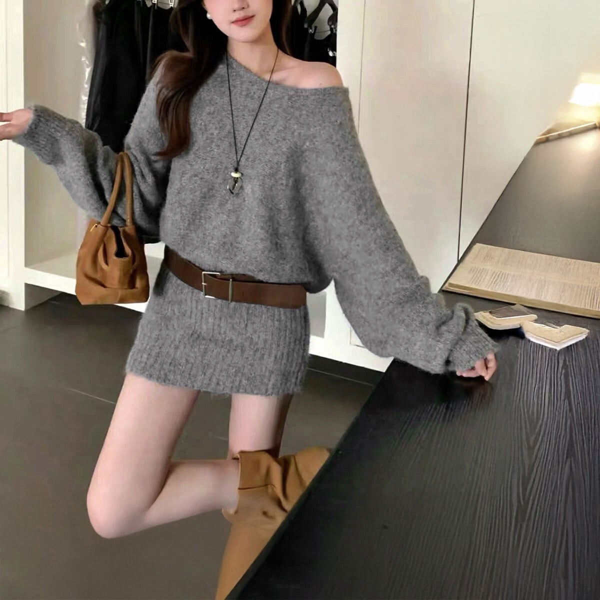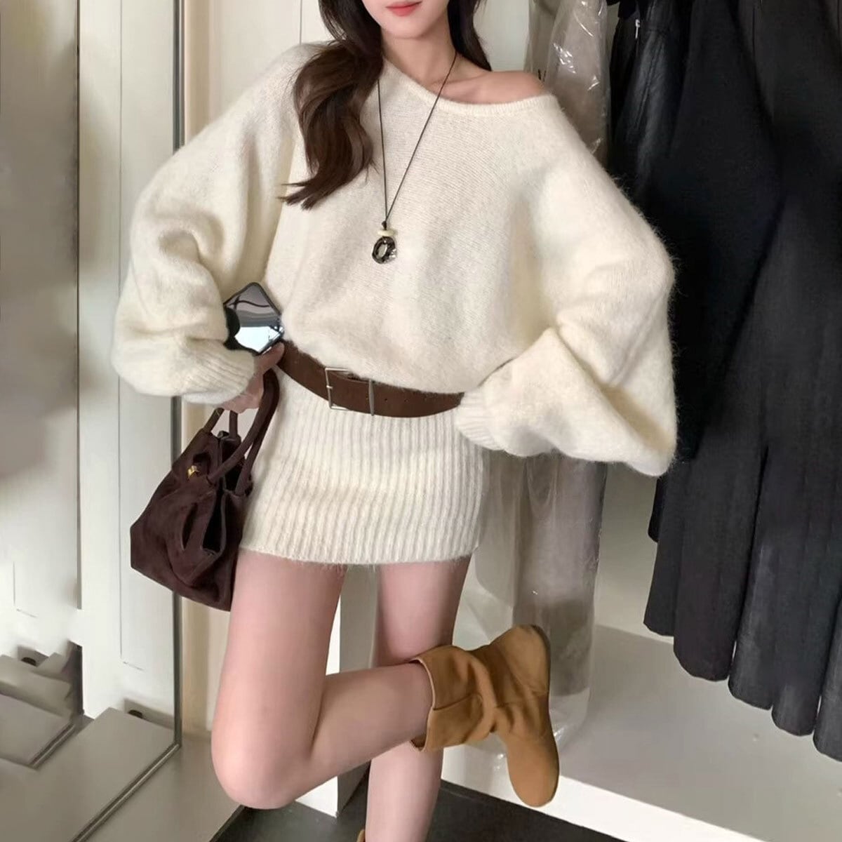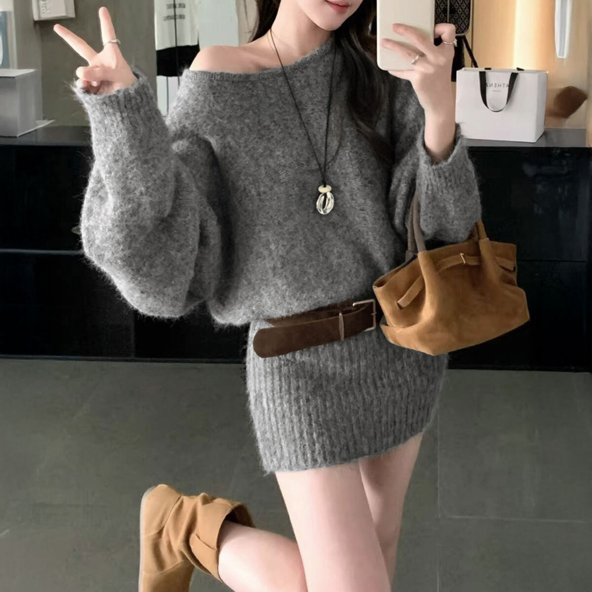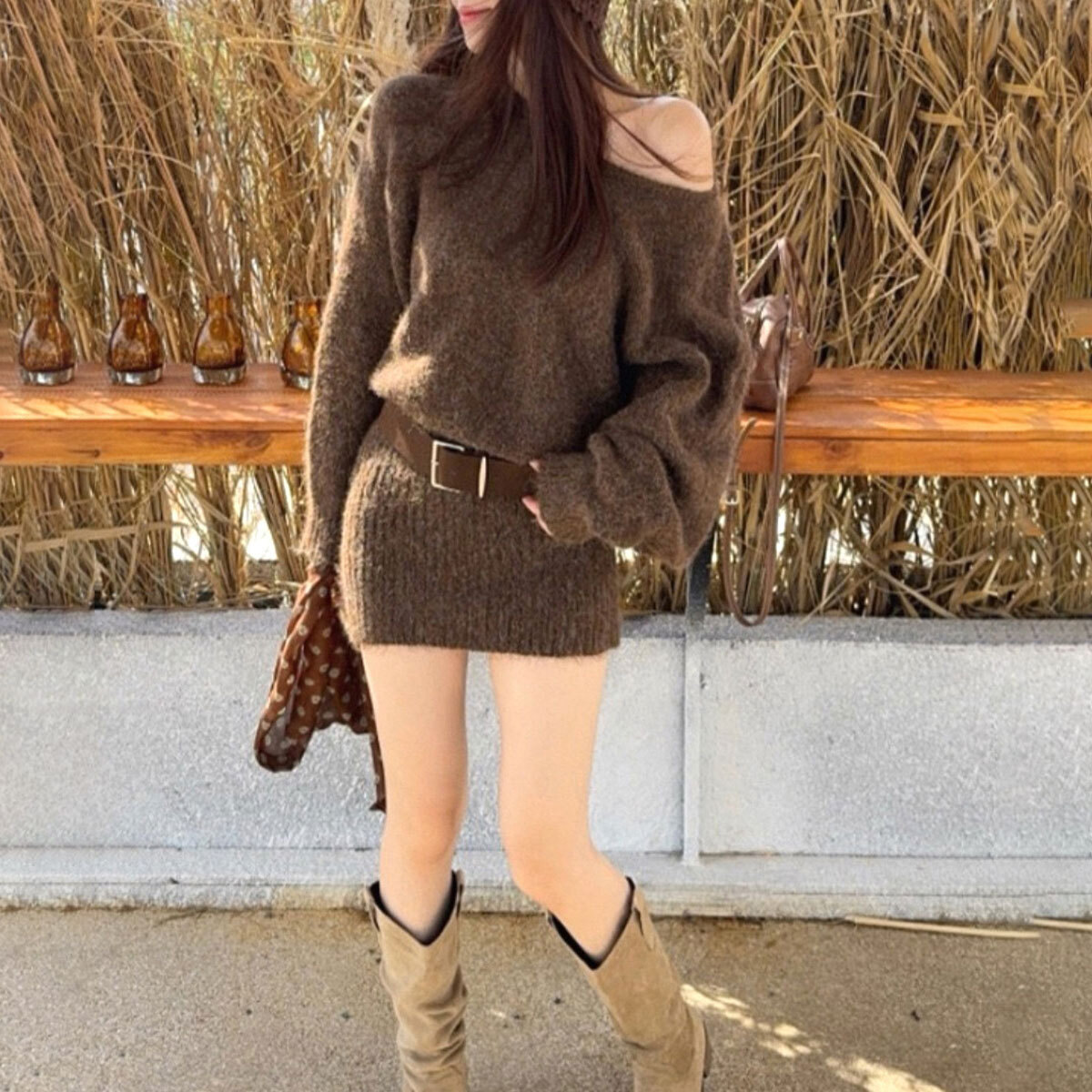 ミニワンピース ニット シャギー 長袖 レディース 秋冬 韓国 ワンピース ウエストマーク きれいめ 大人 カジュアル 肩出し オフショルダー セットアップ風 大人可愛い 大人女子