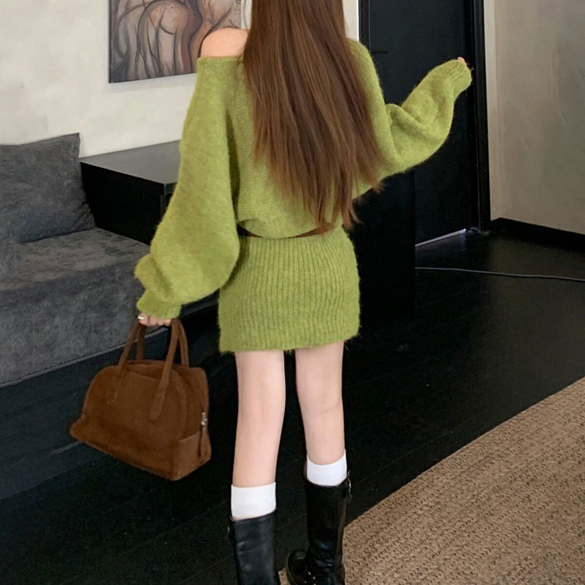 トップはボリューム袖になっていてさりげなく華奢見せし、スカートはリブ編みで脚を綺麗に美しく魅せてくれます。