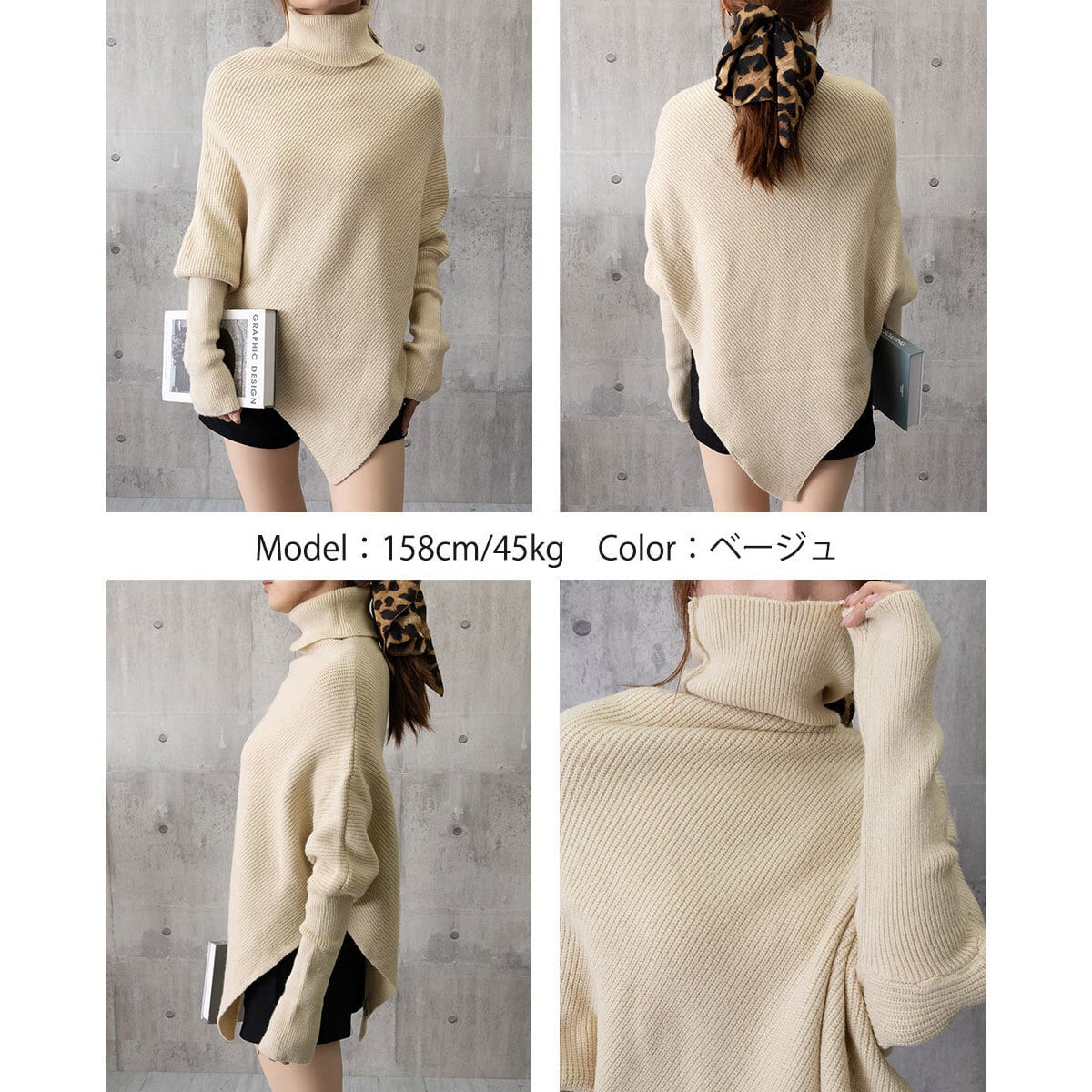 個性的な変形デザインが目を惹き、ハイネックと厚手のニットで寒い冬に暖かい着心地を与えてくれる、ドルマンスリーブのニットセーターです。