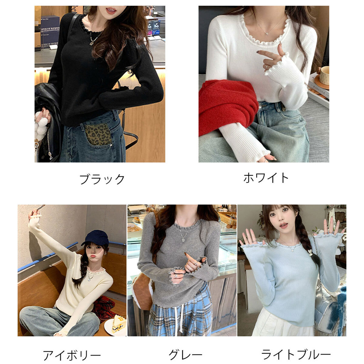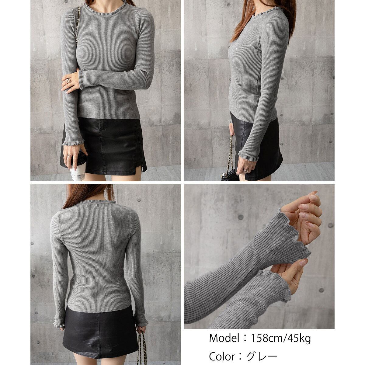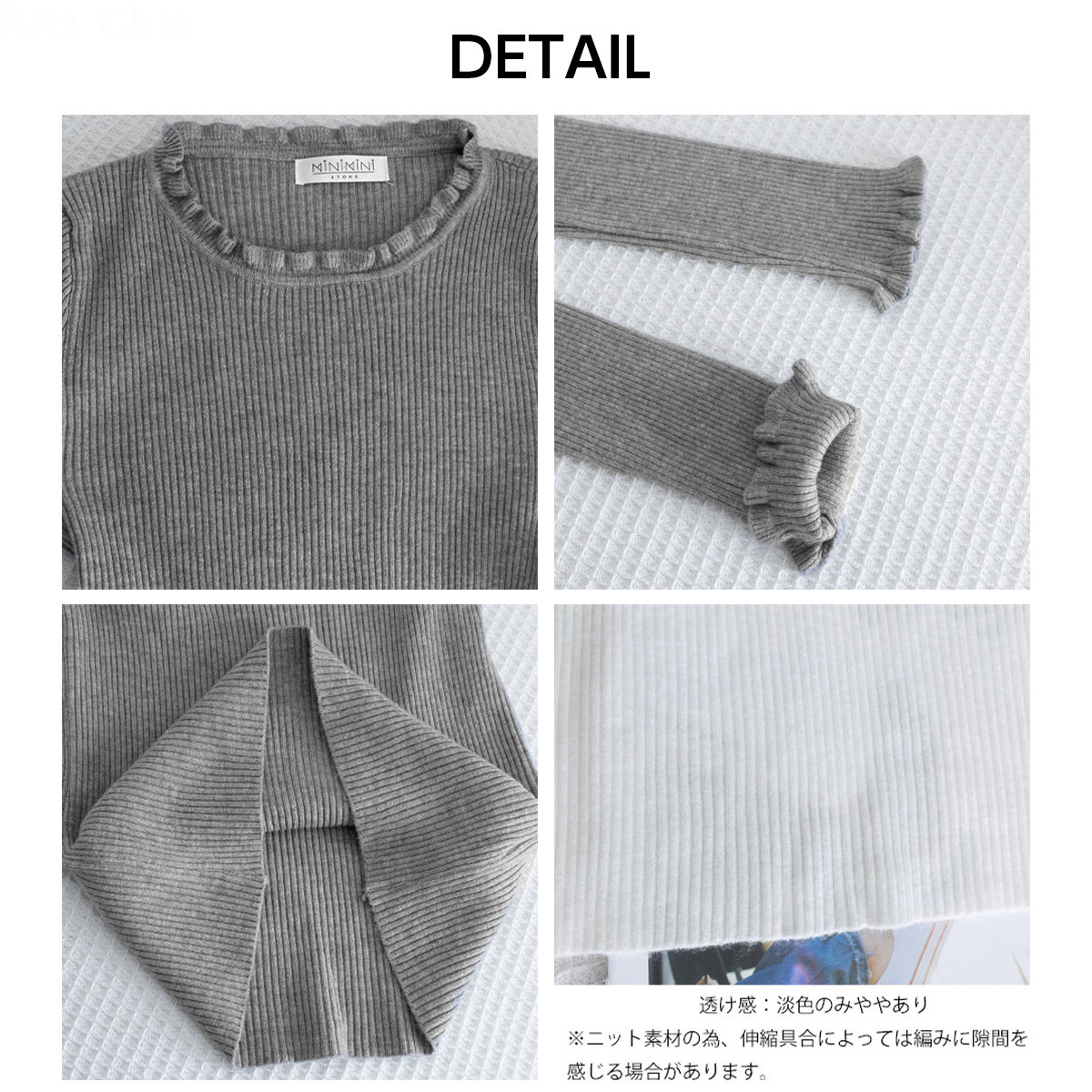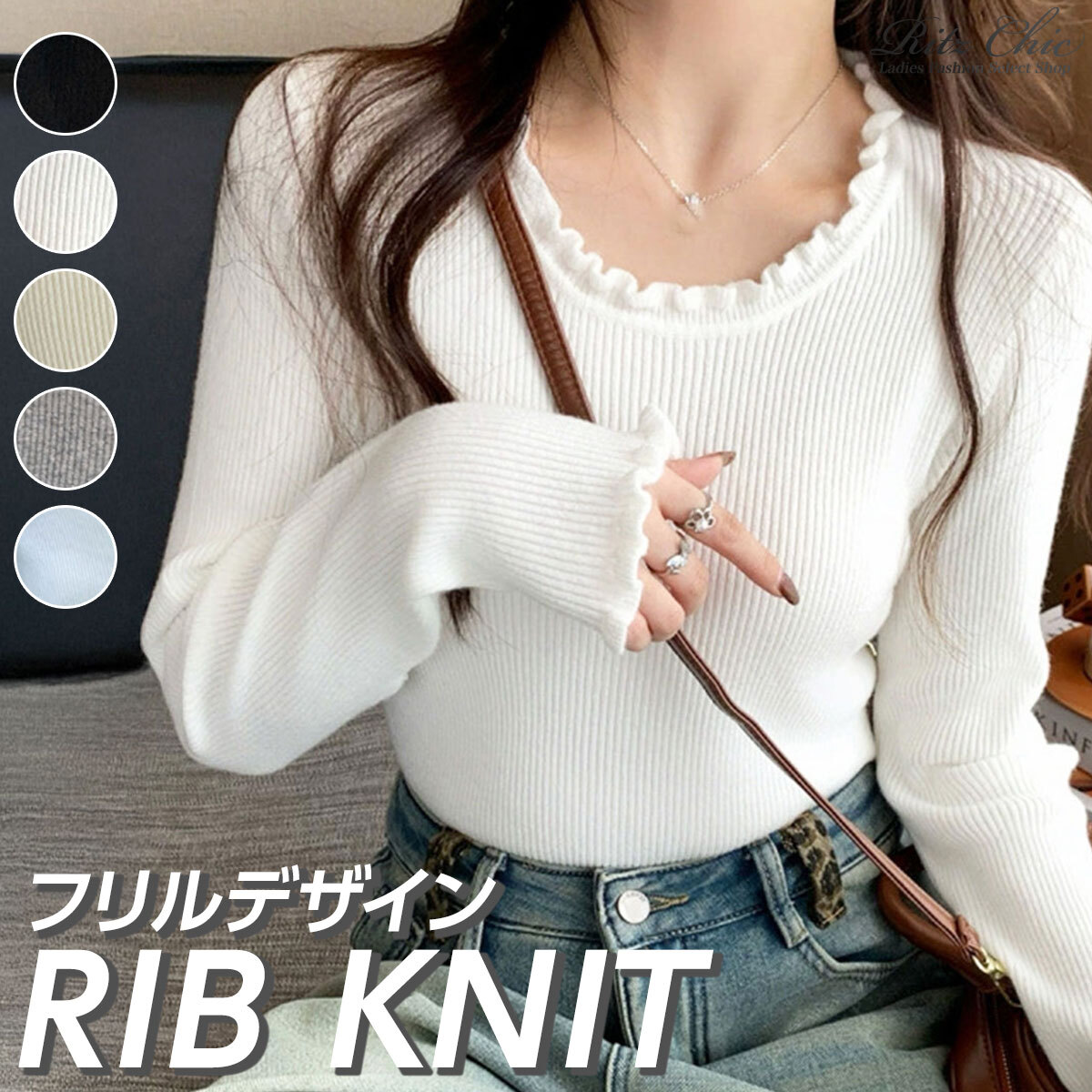 フリルネック リブニット 長袖 レディース 春秋冬 韓国 ニット きれいめ 大人 シンプル カジュアル 袖フリル フリル襟 フェミニン トップス 伸縮性 大人可愛い 大人女子