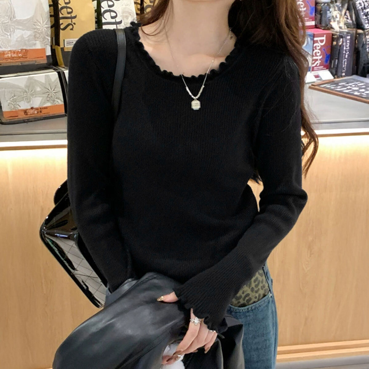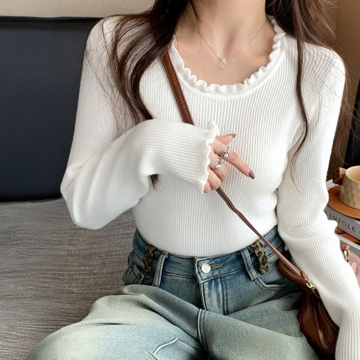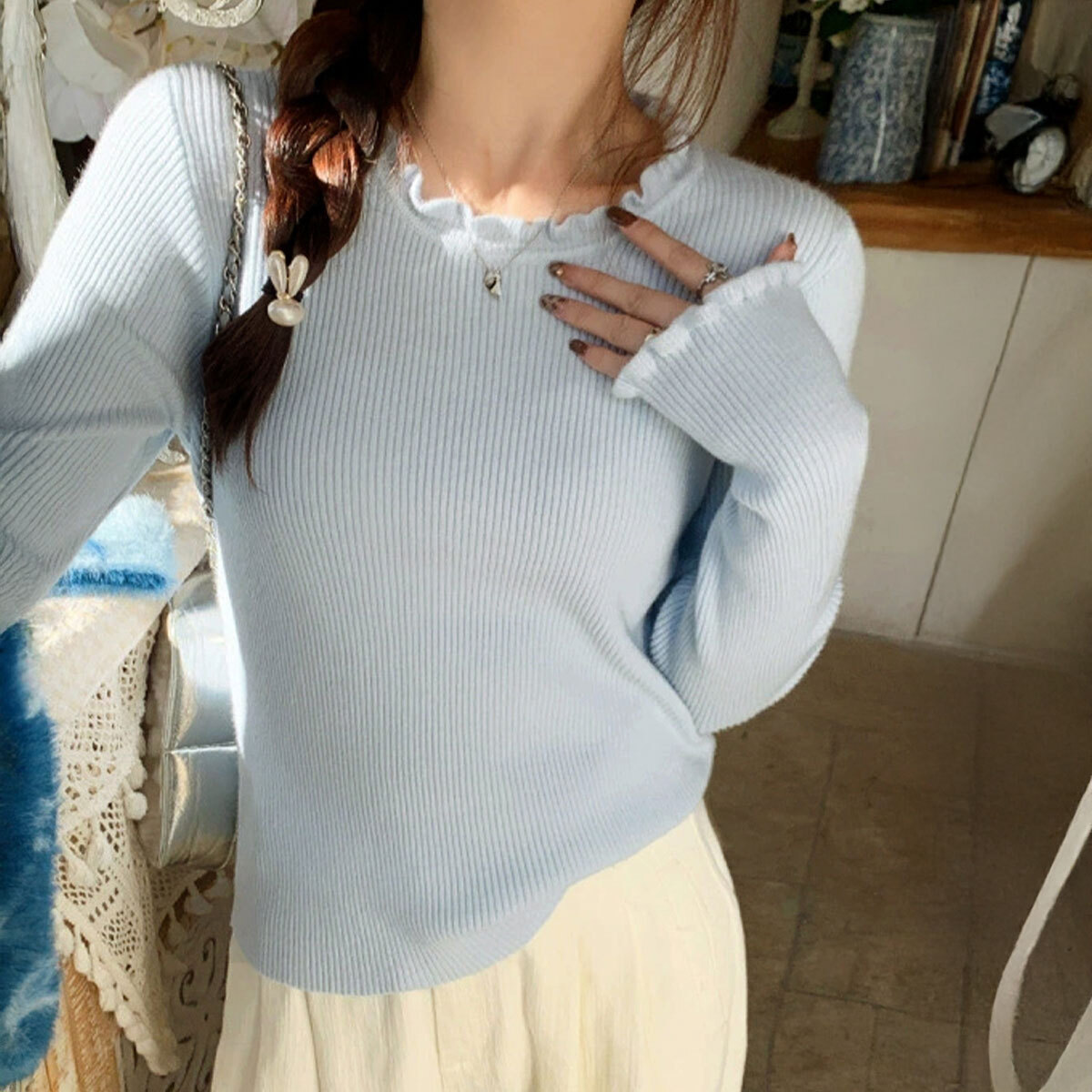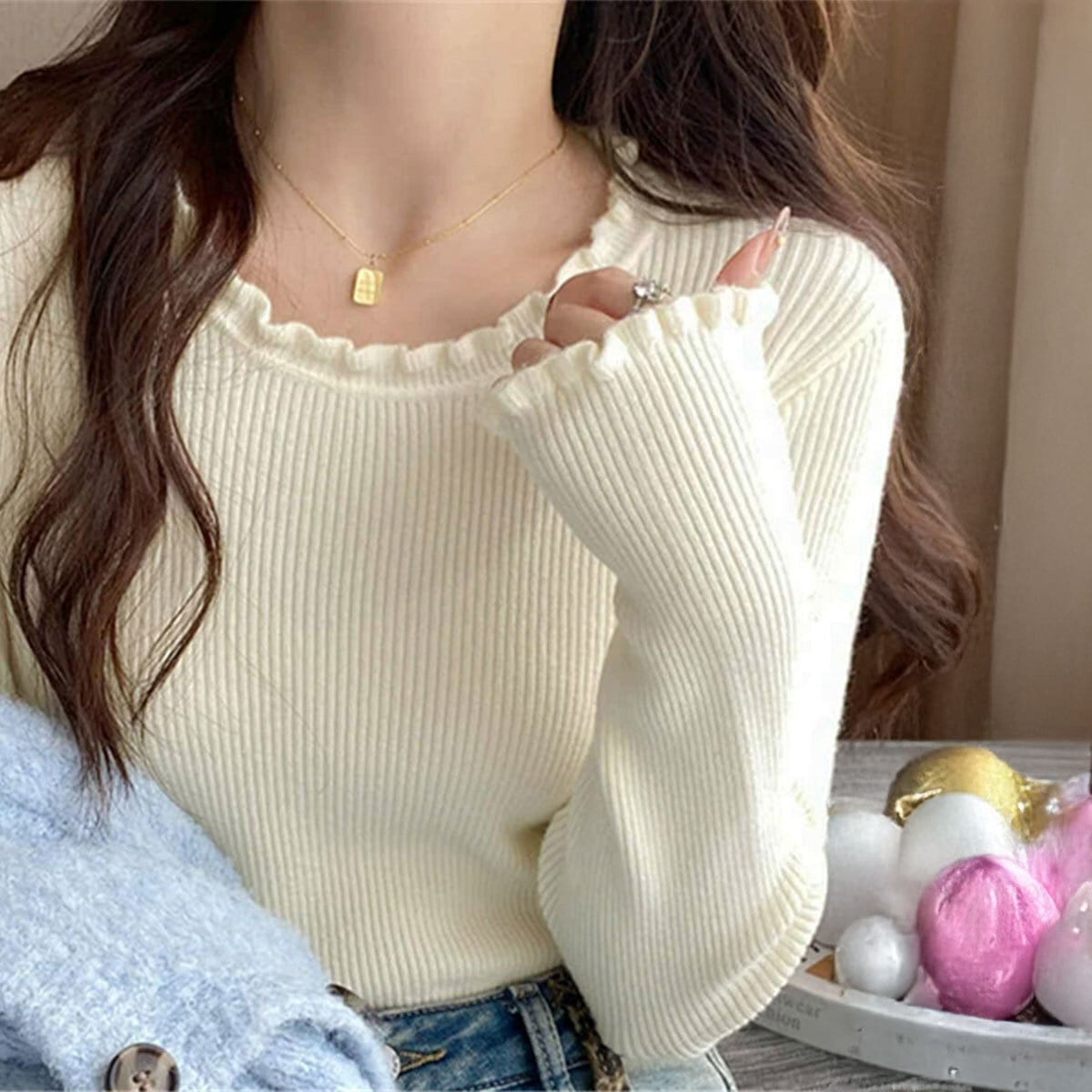 フリルネック リブニット 長袖 レディース 春秋冬 韓国 ニット きれいめ 大人 シンプル カジュアル 袖フリル フリル襟 フェミニン トップス 伸縮性 大人可愛い 大人女子