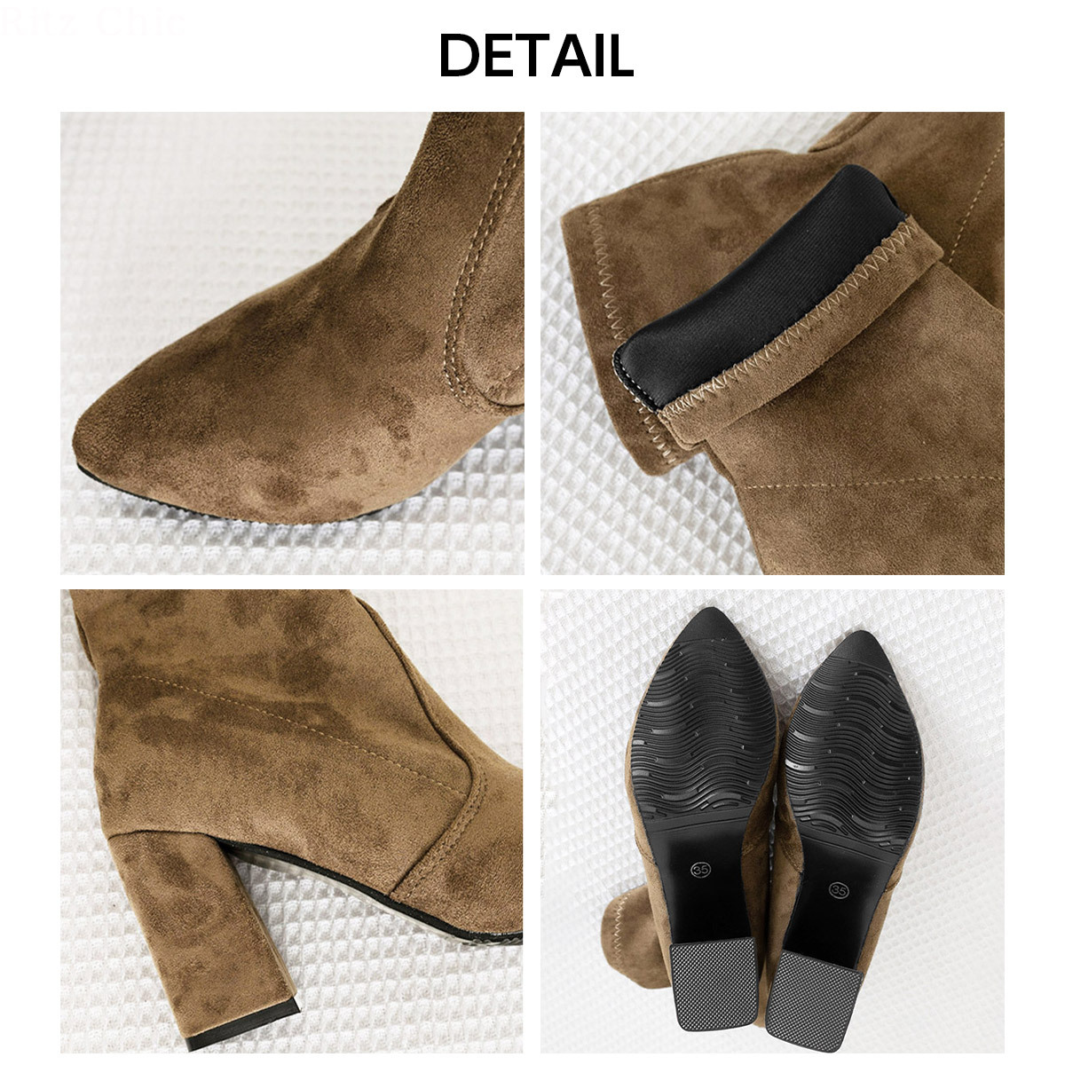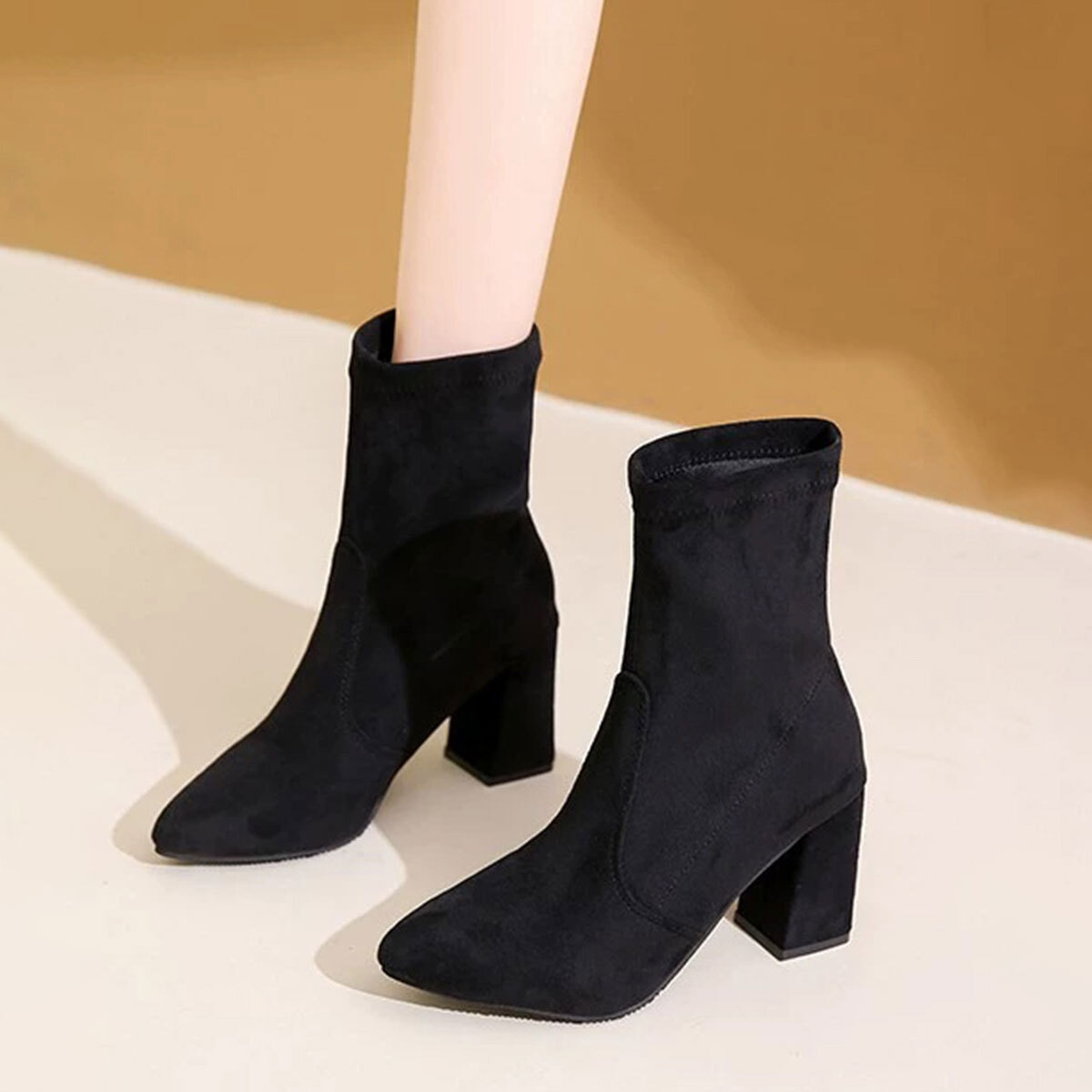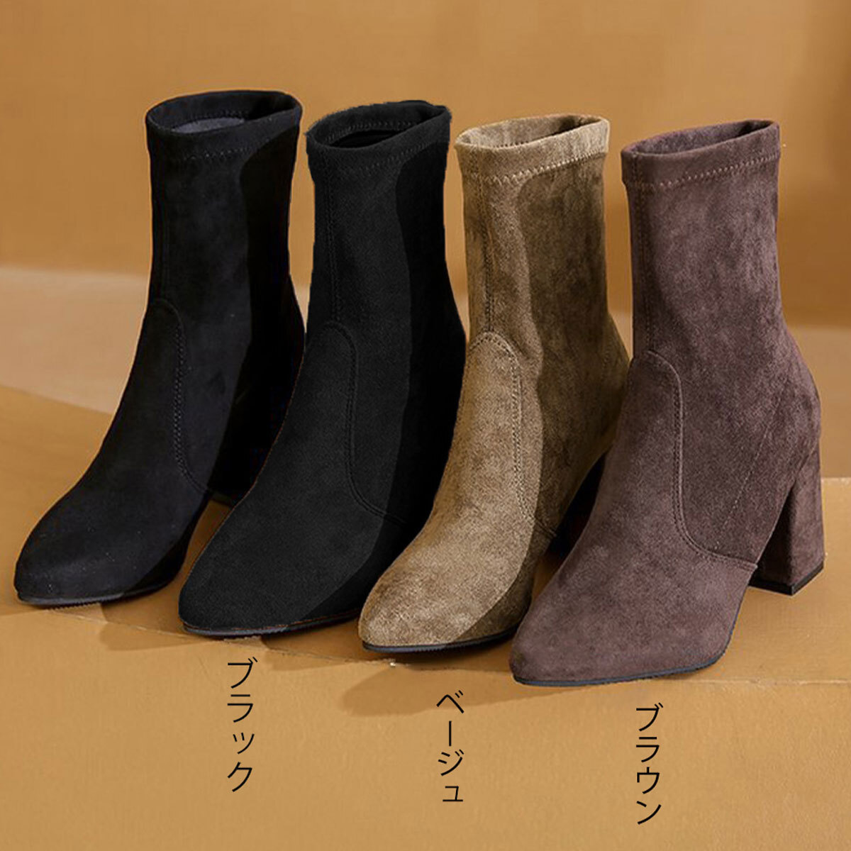 ショートブーツ スエード レディース 秋冬 韓国 ブーツ 通勤 ビジネス OL きれいめ 大人 シンプル ストレッチ 履きやすい 歩きやすい チャンキーヒール ポインテッドトゥ 上品 細見え 大人可愛い 大人女子