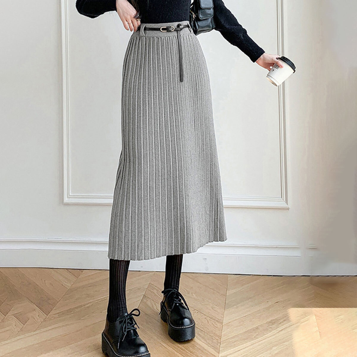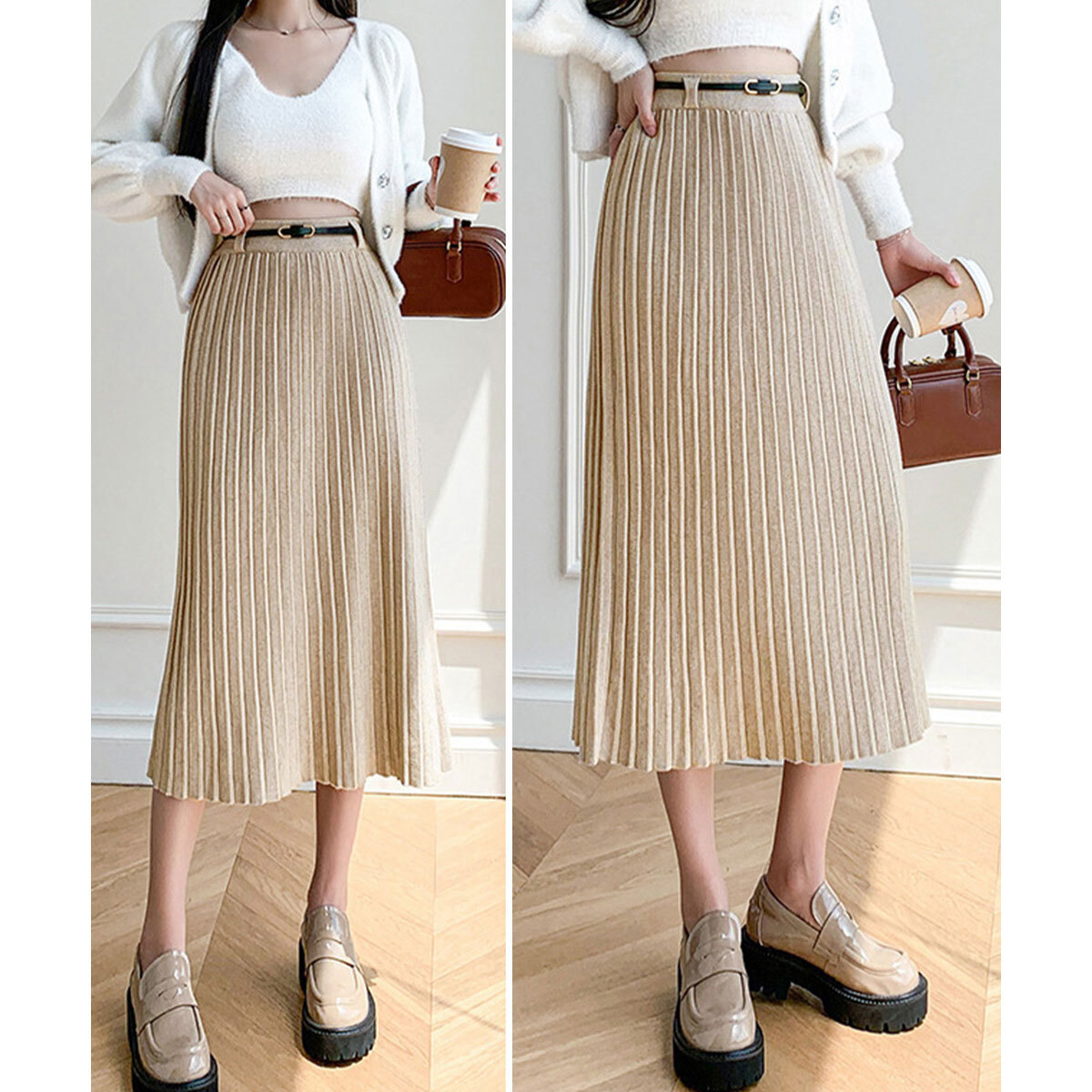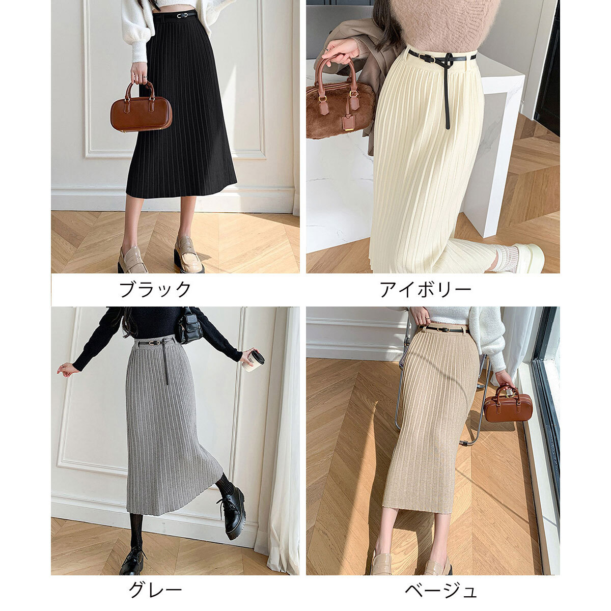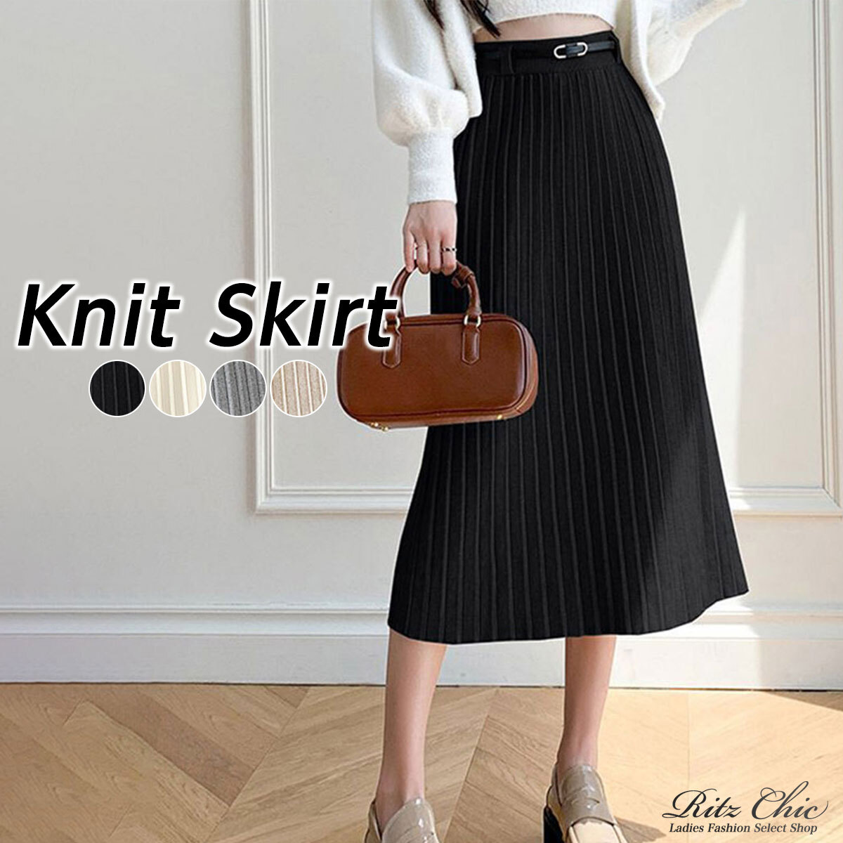 プリーツ ニット スカート レディース 秋冬 韓国 ロングスカート きれいめ 大人 かわいい フェミニン 通勤 ビジネス オフィス シンプル ウエストゴム ハイウエスト ミモレ丈 大人可愛い 大人女子