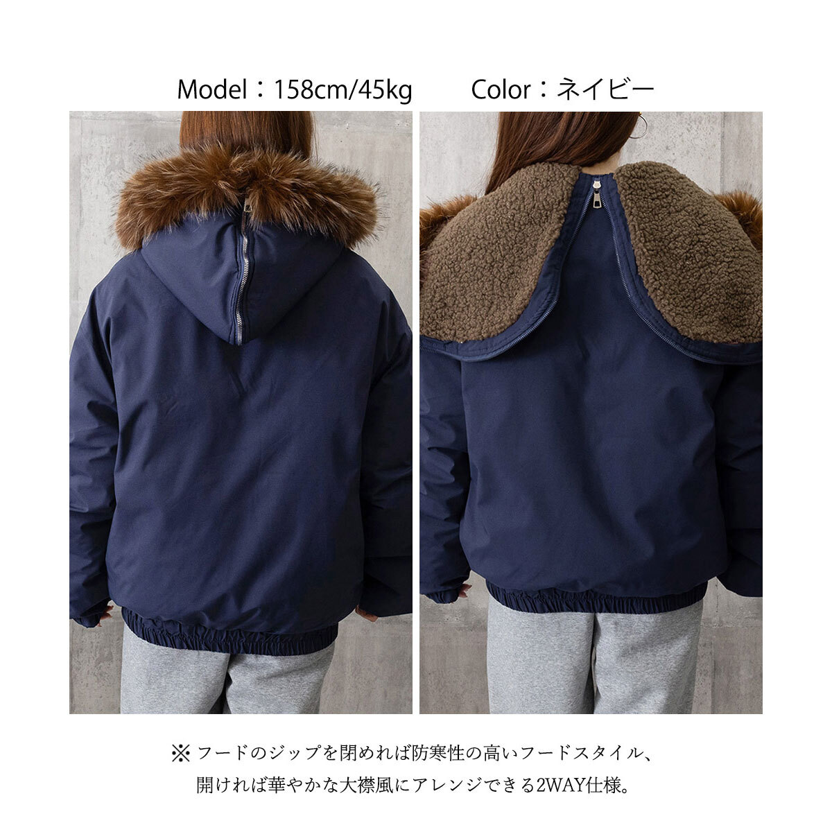 フードのジップを閉めれば防寒性の高いフードスタイル、開ければ華やかな大襟風にアレンジできる2way仕様になっていて、その日の気分やスタイルに合わせてお洒落を楽しめます。