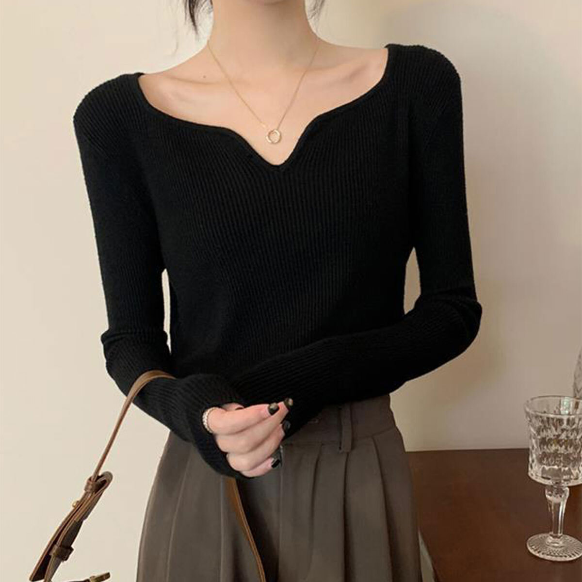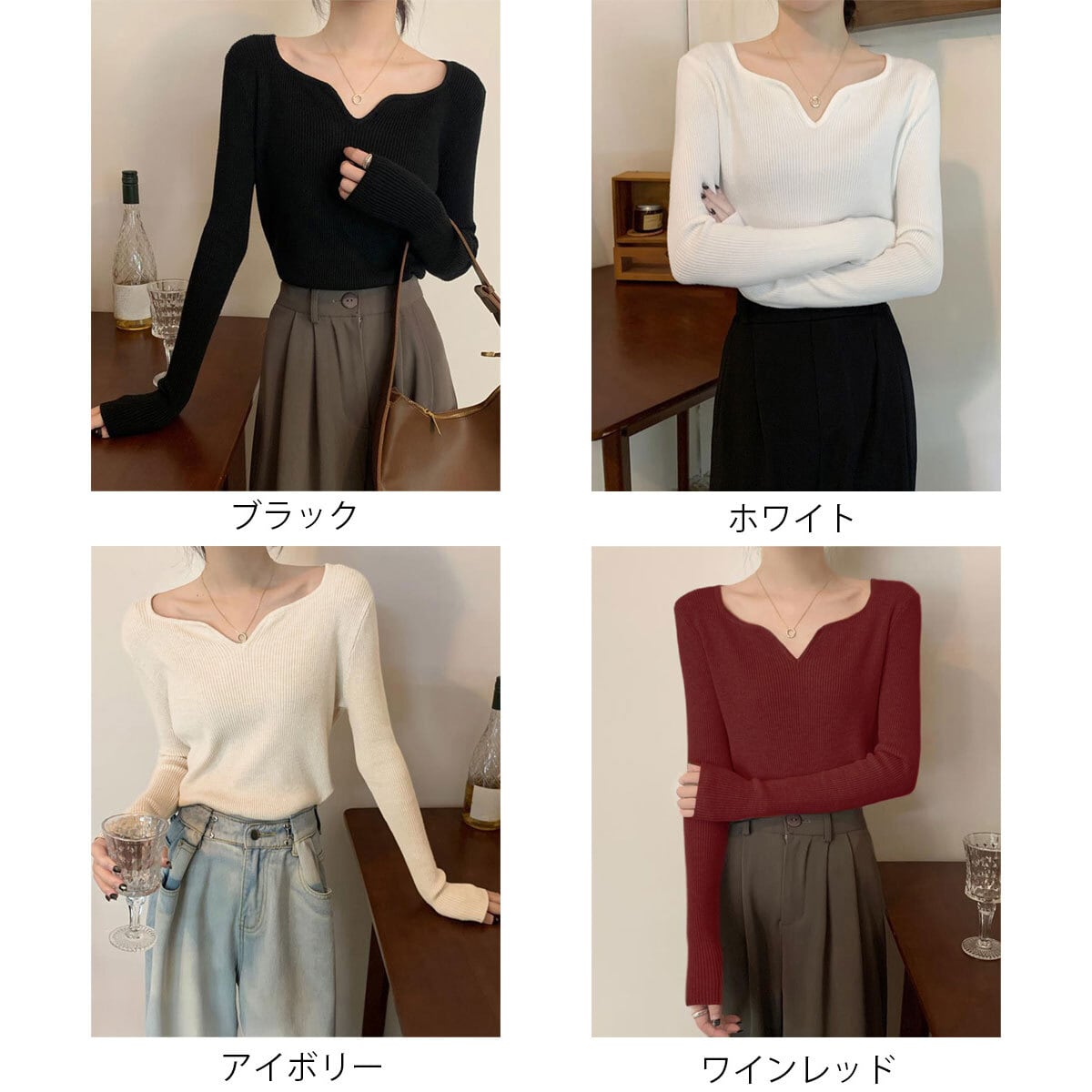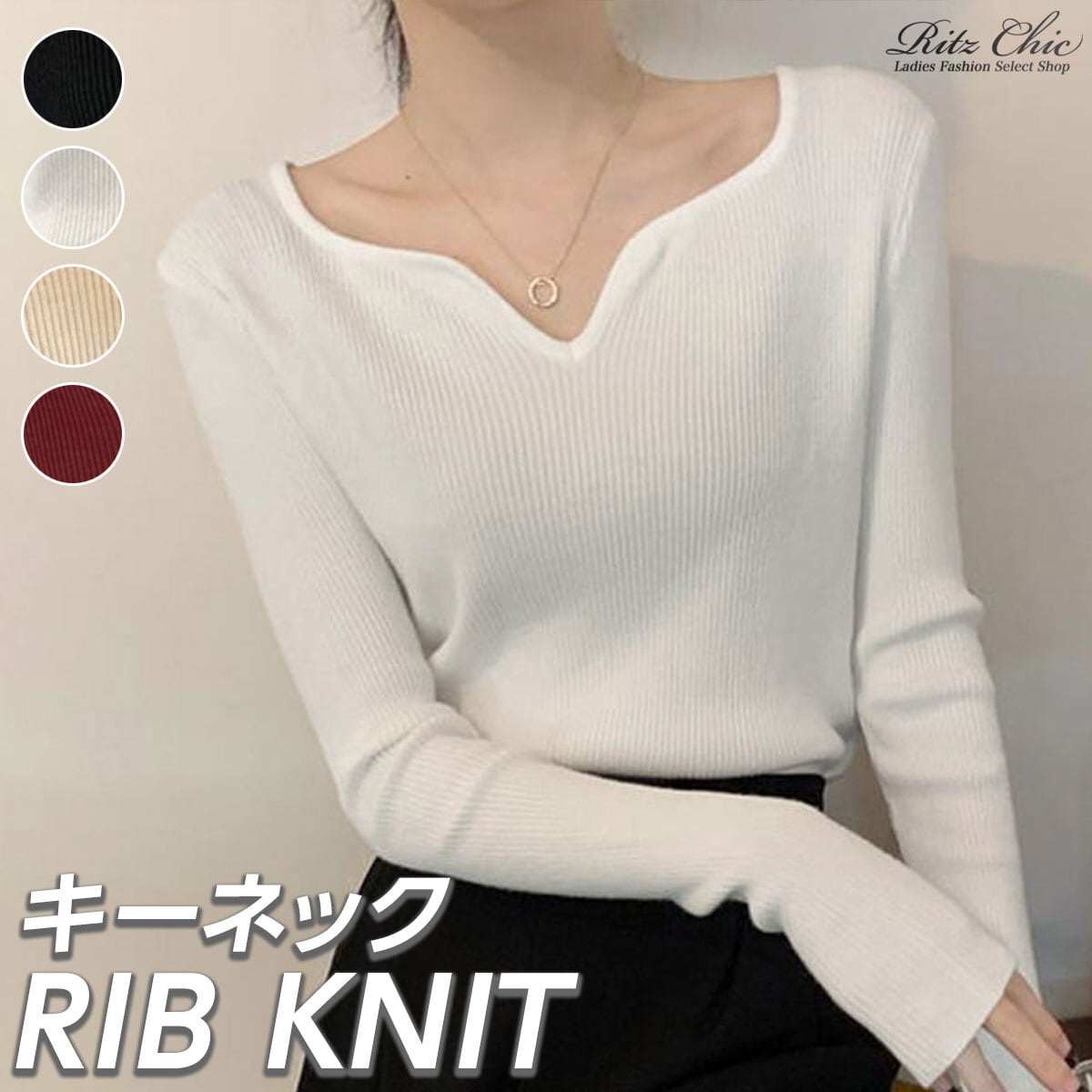 ◇キーネックデザインの長袖リブニットセーター。