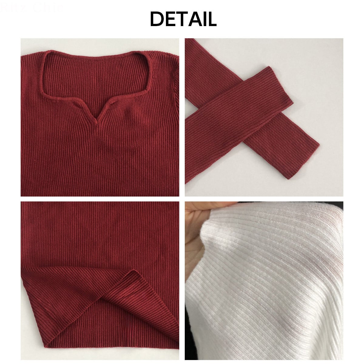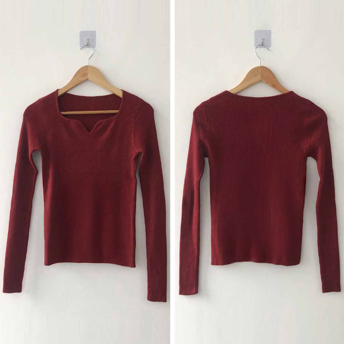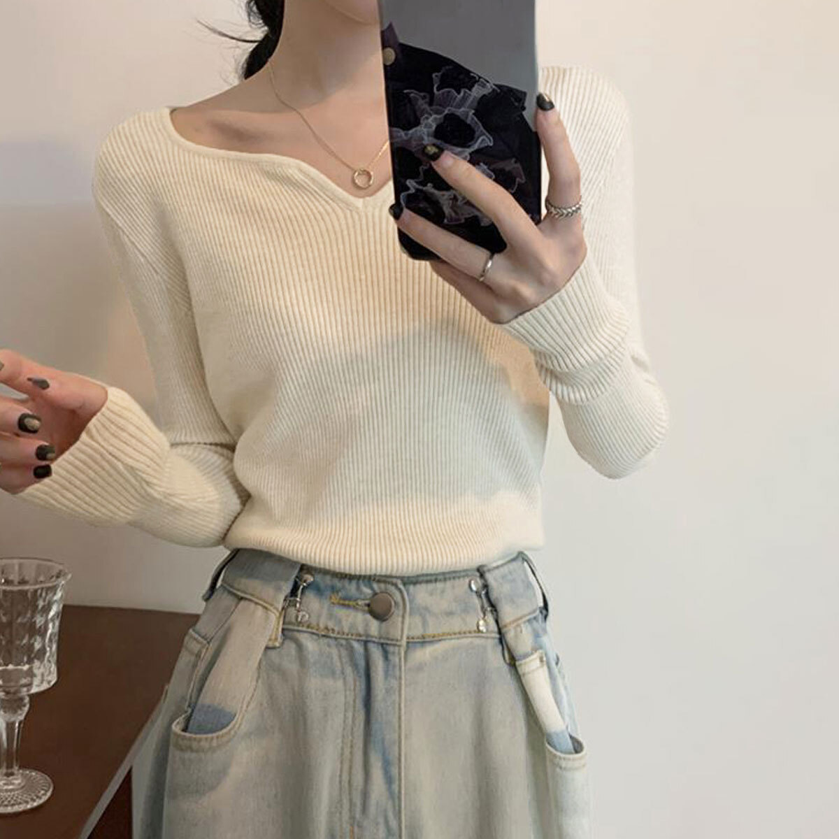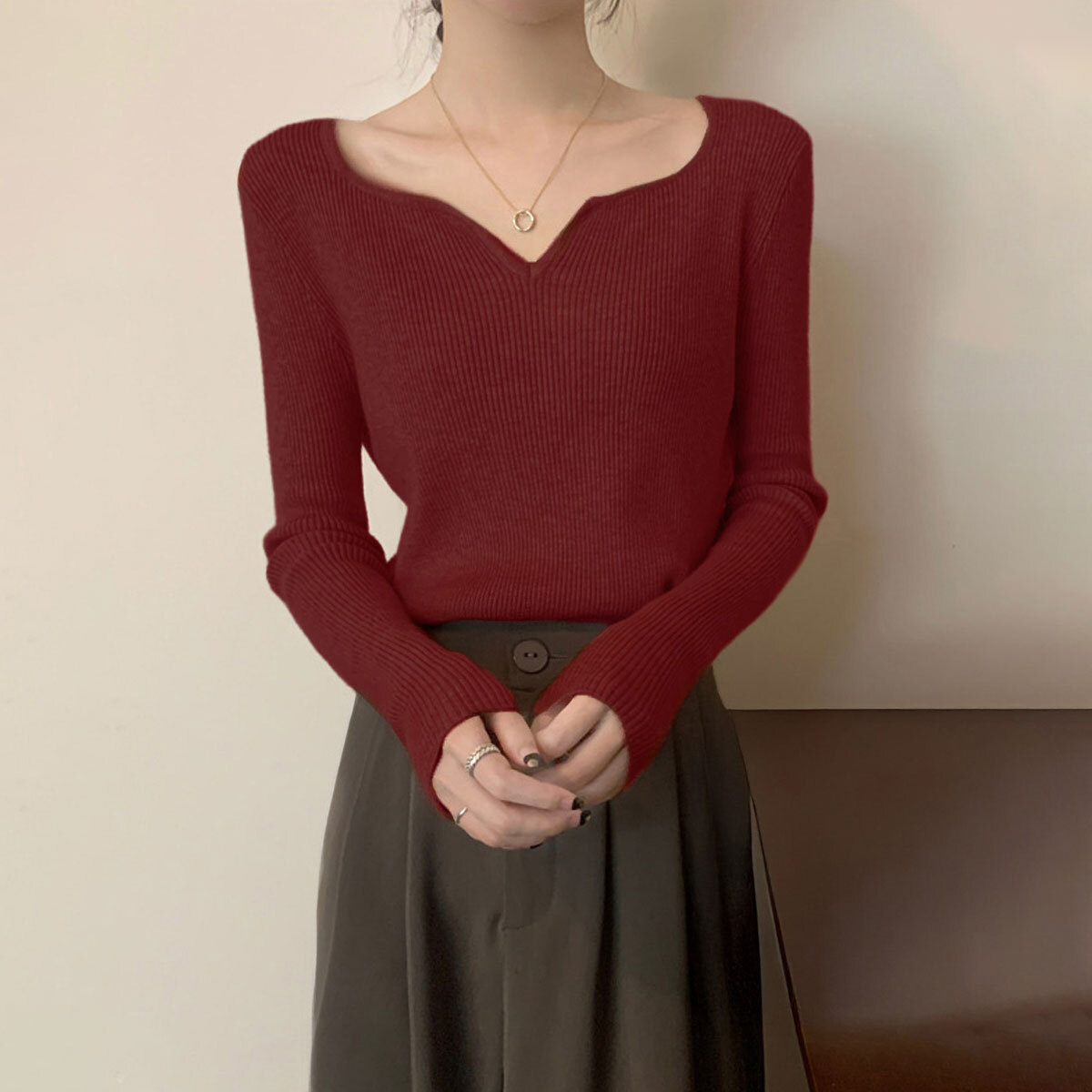 ◇キーネックデザインの長袖リブニットセーター。