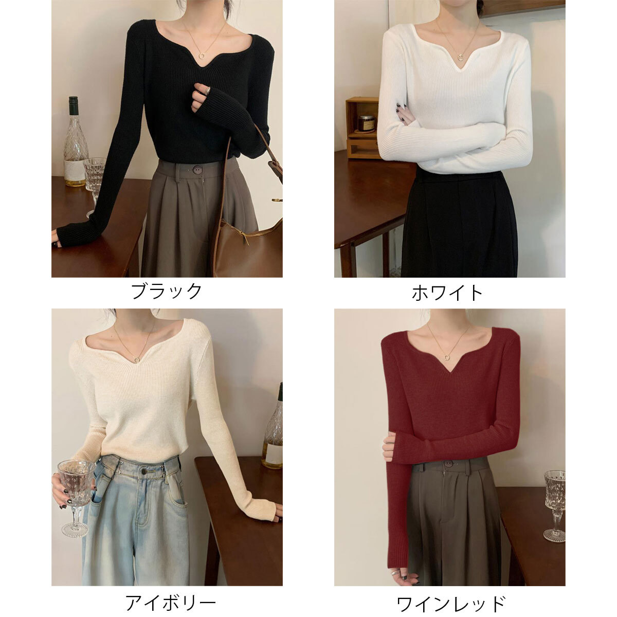 キーネック リブニット 長袖 トップス レディース 春秋冬 韓国 ニット きれいめ 大人 シンプル 重ね着 インナー カジュアル ニットセーター ストレッチ 大人可愛い 大人女子
