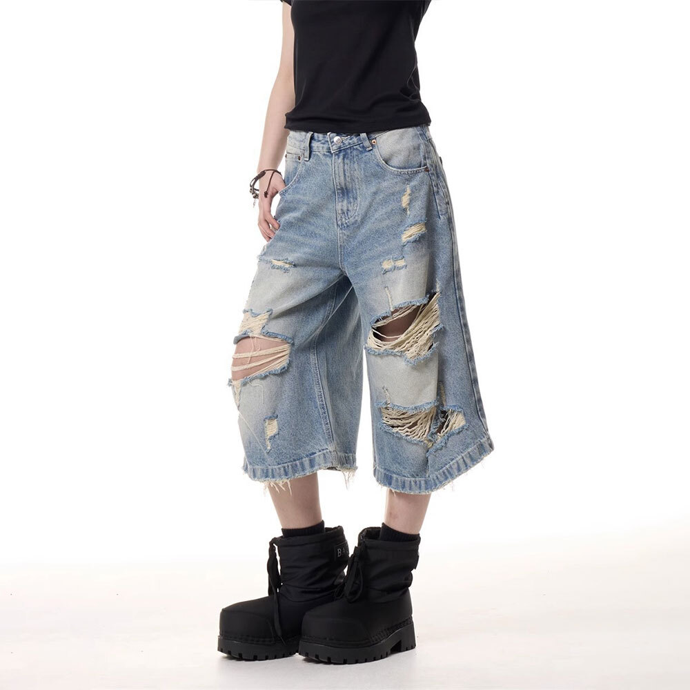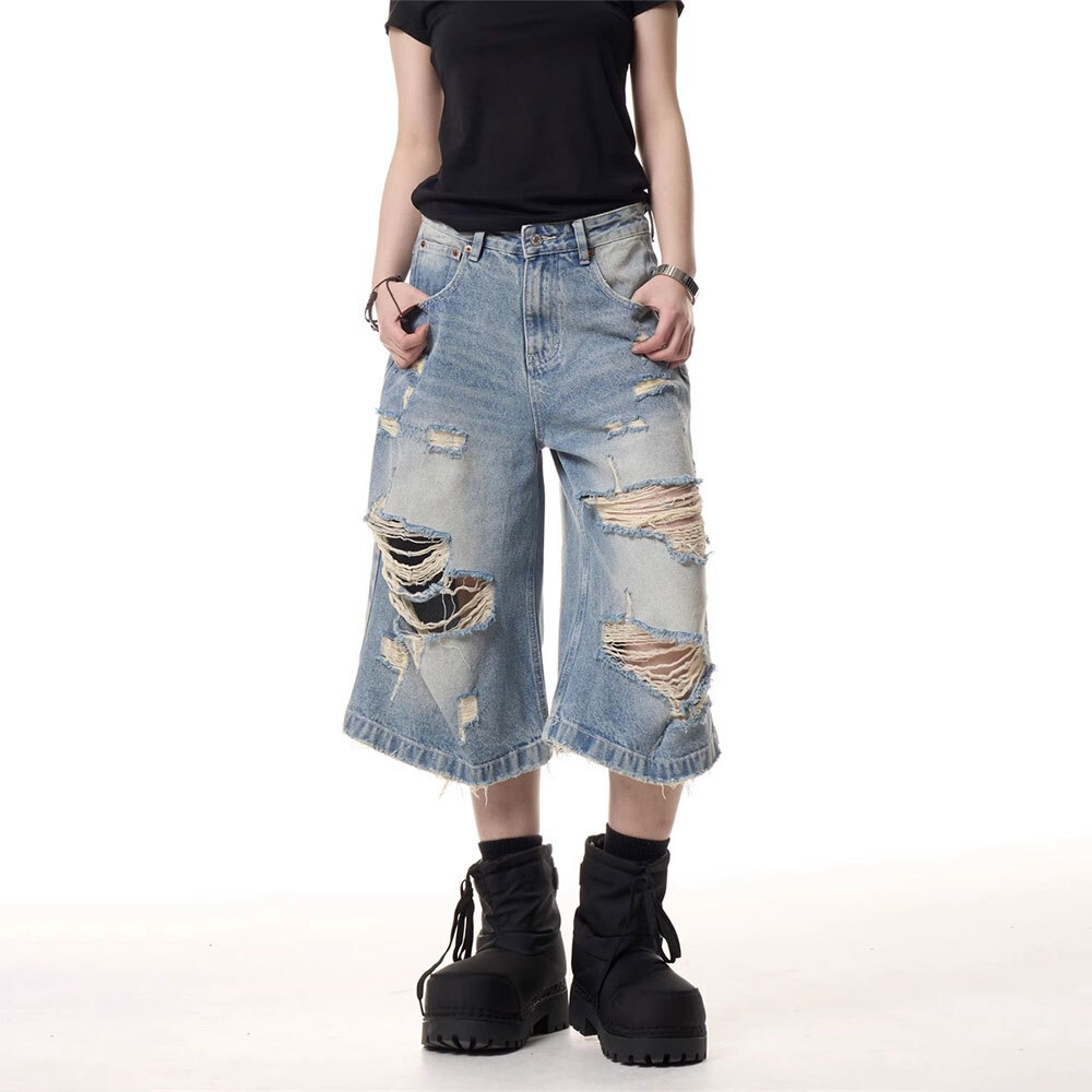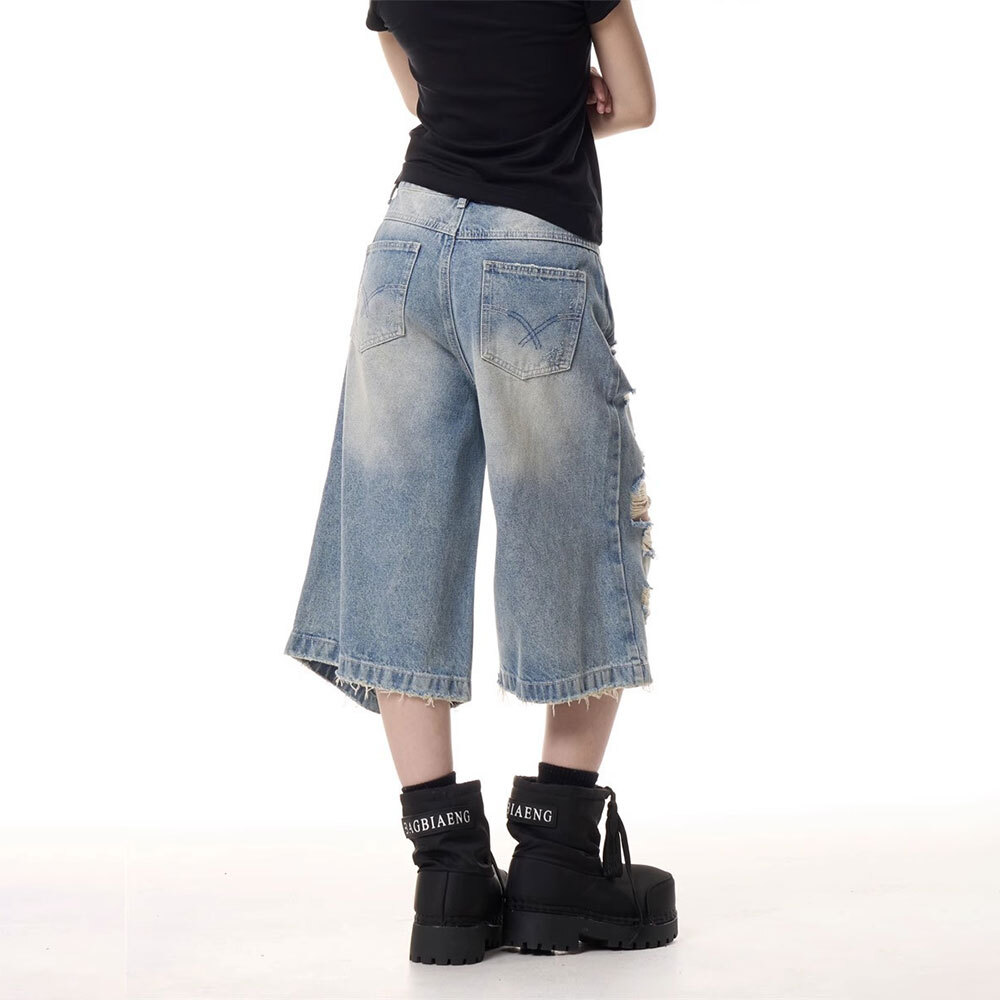 ◇ヴィンテージライクなダメージ加工のハーフデニムパンツ。