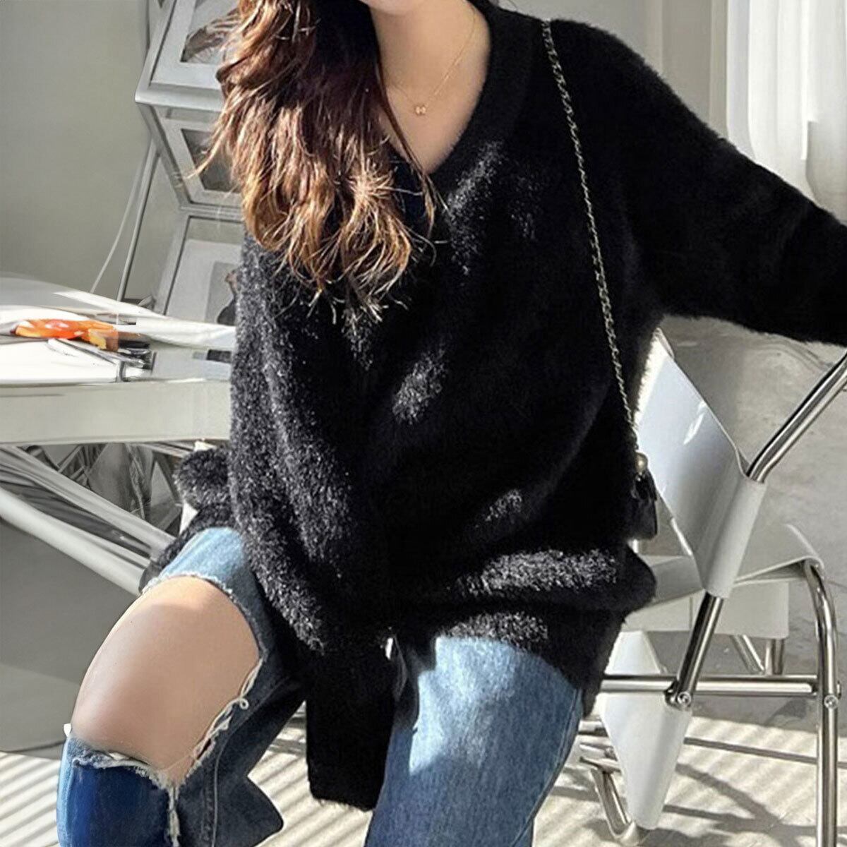 シャギーニット トップス 長袖 レディース 秋冬 韓国 ふわふわ 大人 かわいい きれいめ おしゃれ ゆったり ニット 体型カバー Vネック モヘア調 起毛 大人可愛い 大人女子