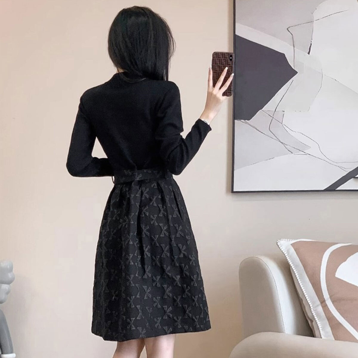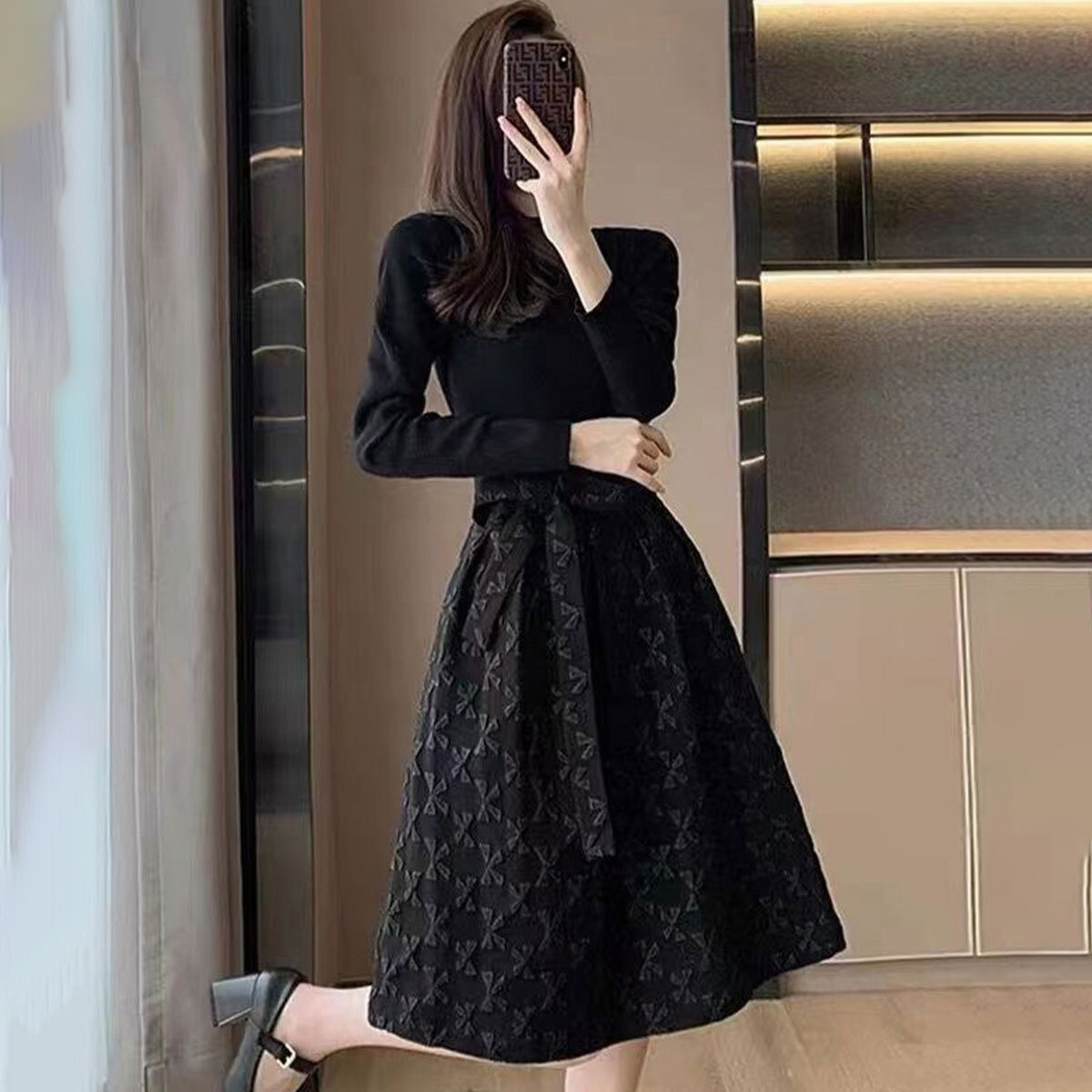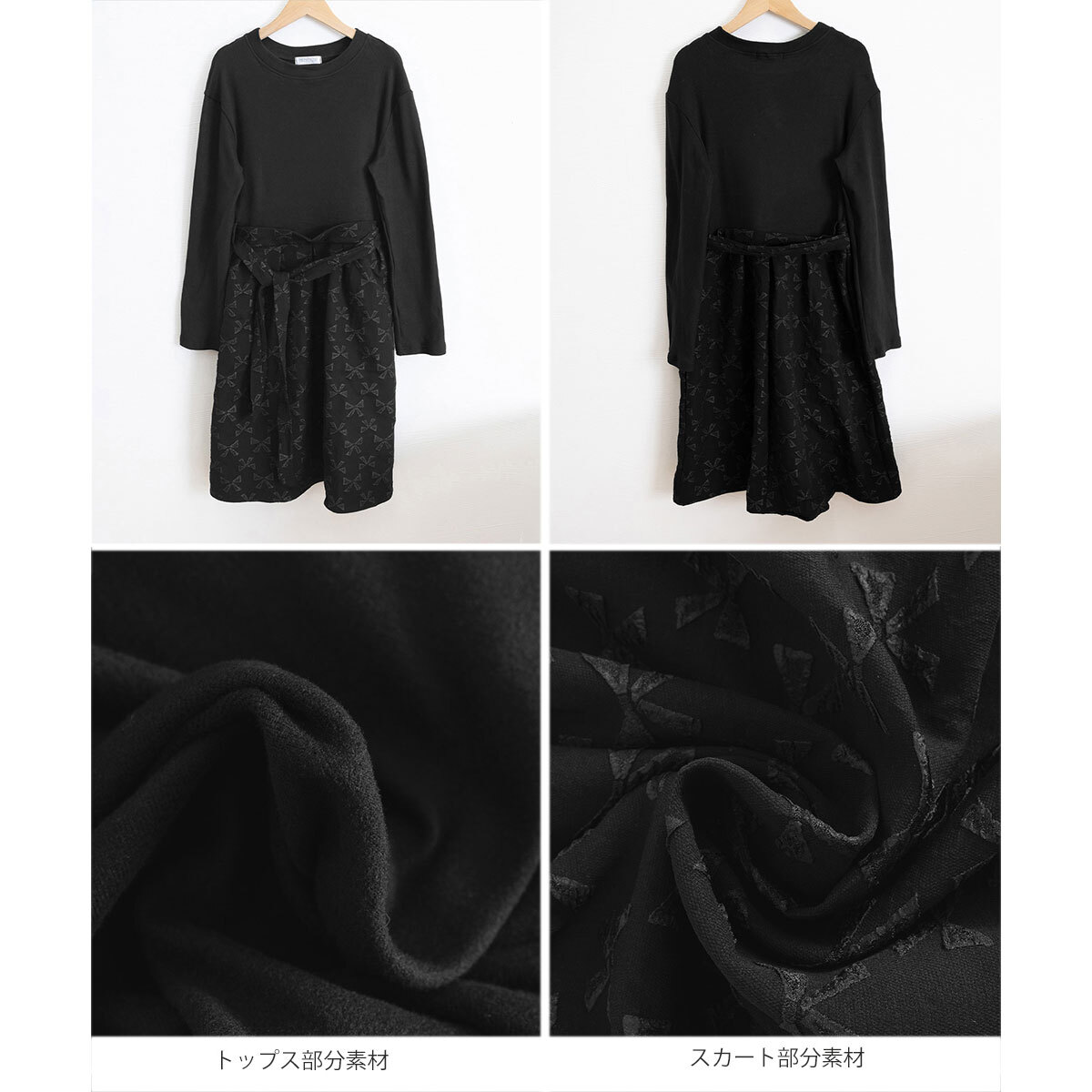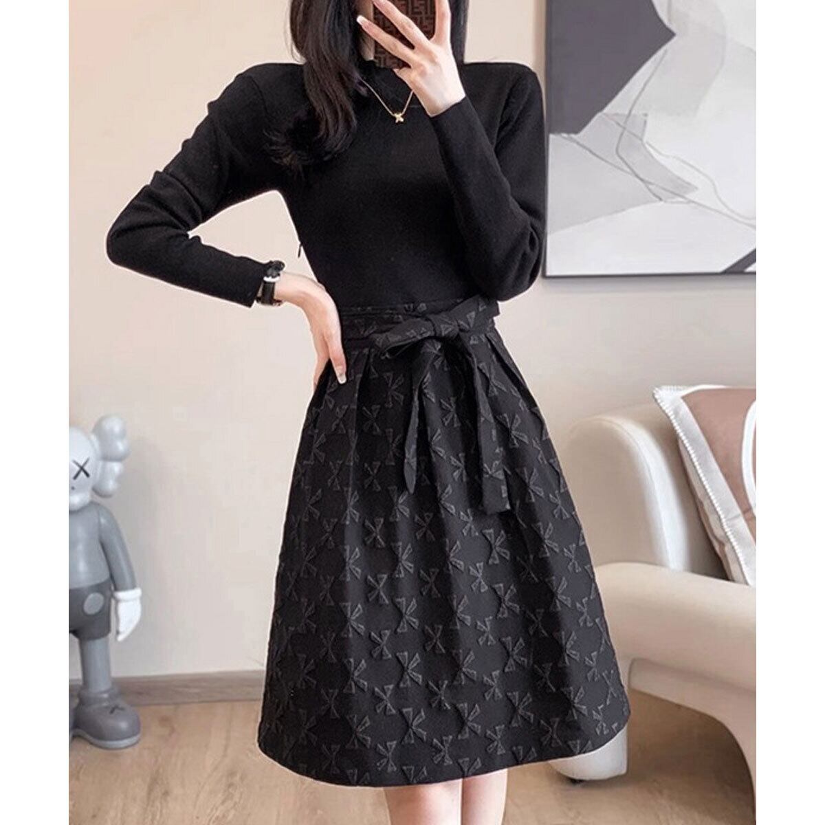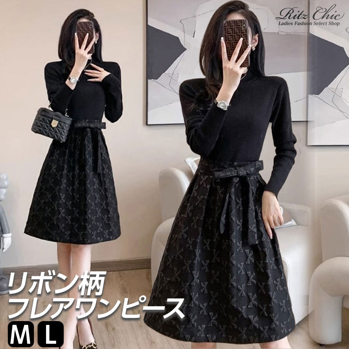 フレアワンピース リボン柄 長袖 ウエストマーク レディース 春秋冬 韓国 レトロ ワンピース おしゃれ きれいめ 大人 上品 Aライン ブラック 黒 結婚式 参観日 入学式 卒業式 大人可愛い 大人女子