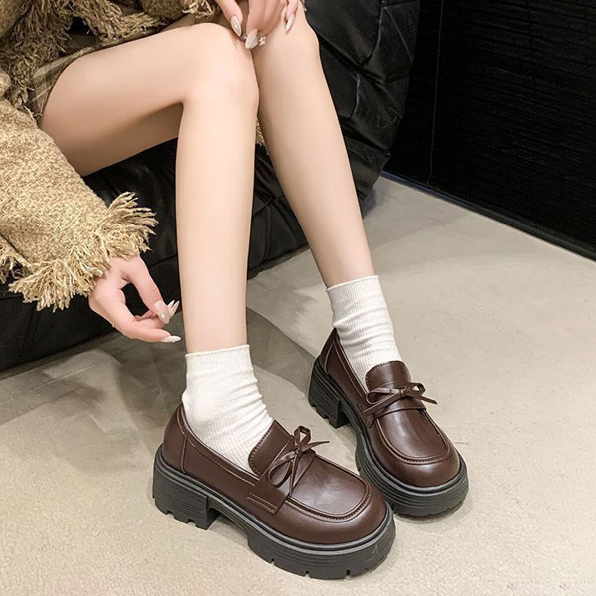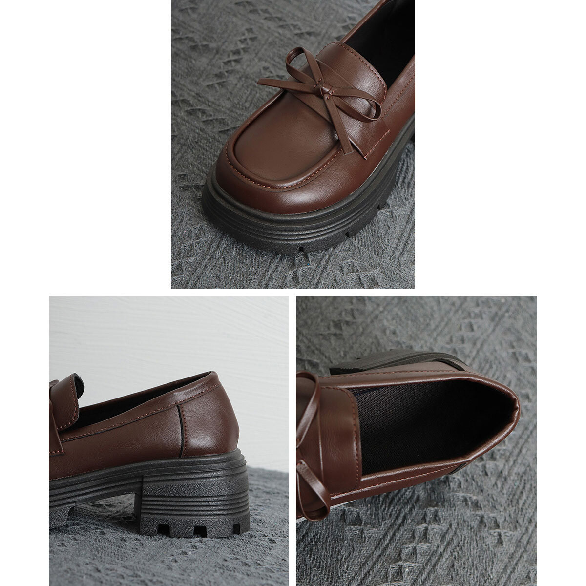 シンプルながら存在感があり、丸みのあるつま先とさりげないリボンデザインが、足元から大人フェミニンな印象を演出してくれる厚底ローファーです。
