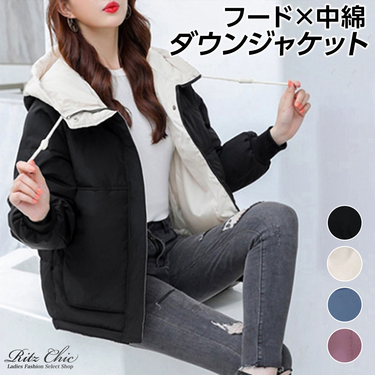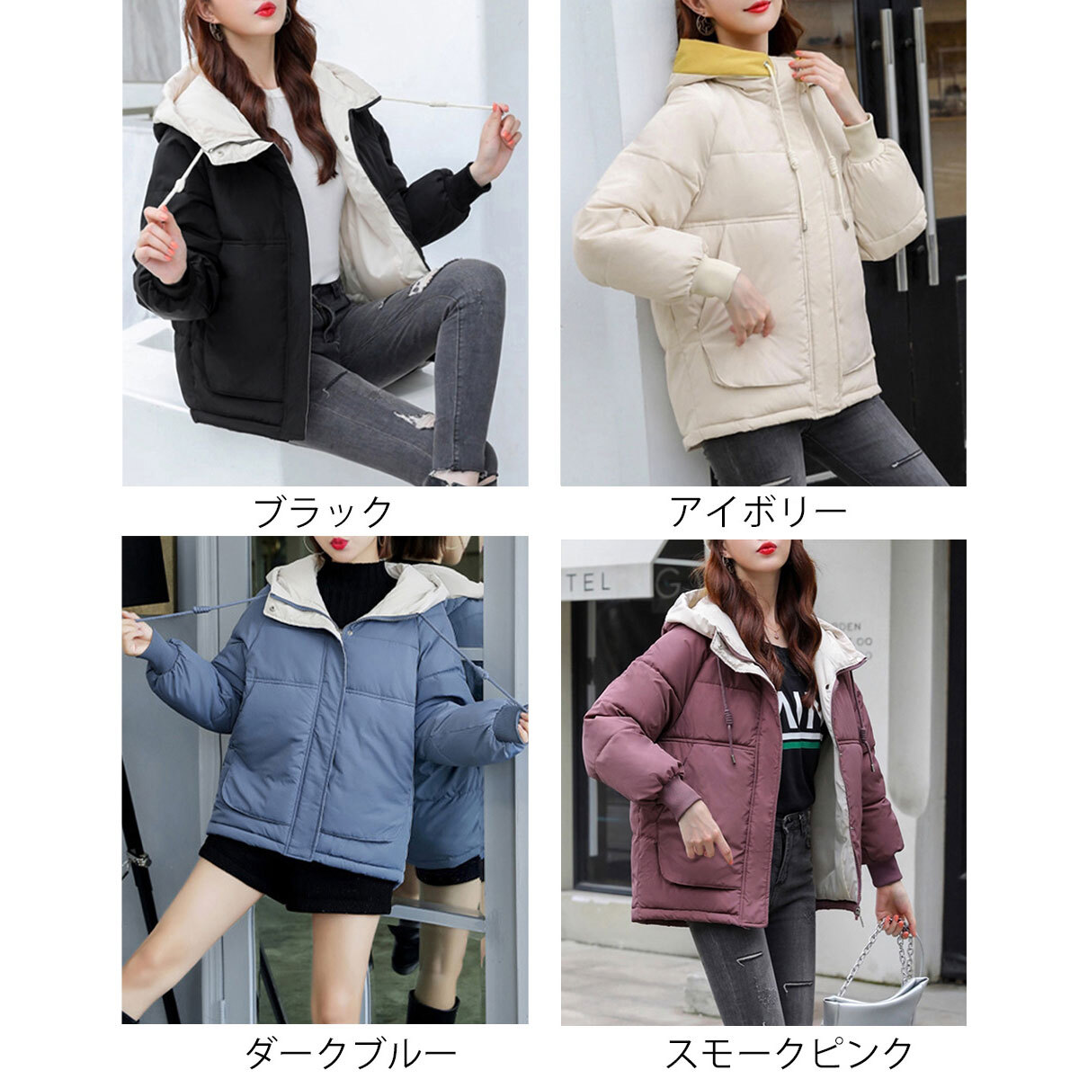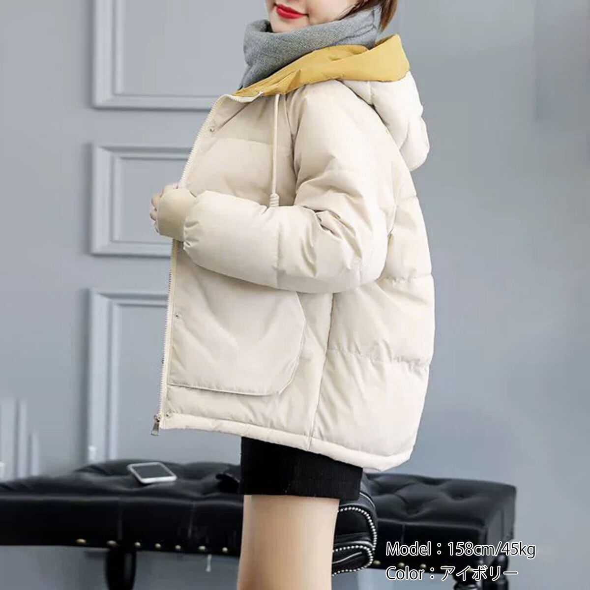 ダウンジャケット フード付き 中綿 アウター レディース 冬 防寒 保温 暖かい 韓国 きれいめ 大人 カジュアル フェイクダウン ブルゾン バイカラー 通勤 通学 大人可愛い 大人女子