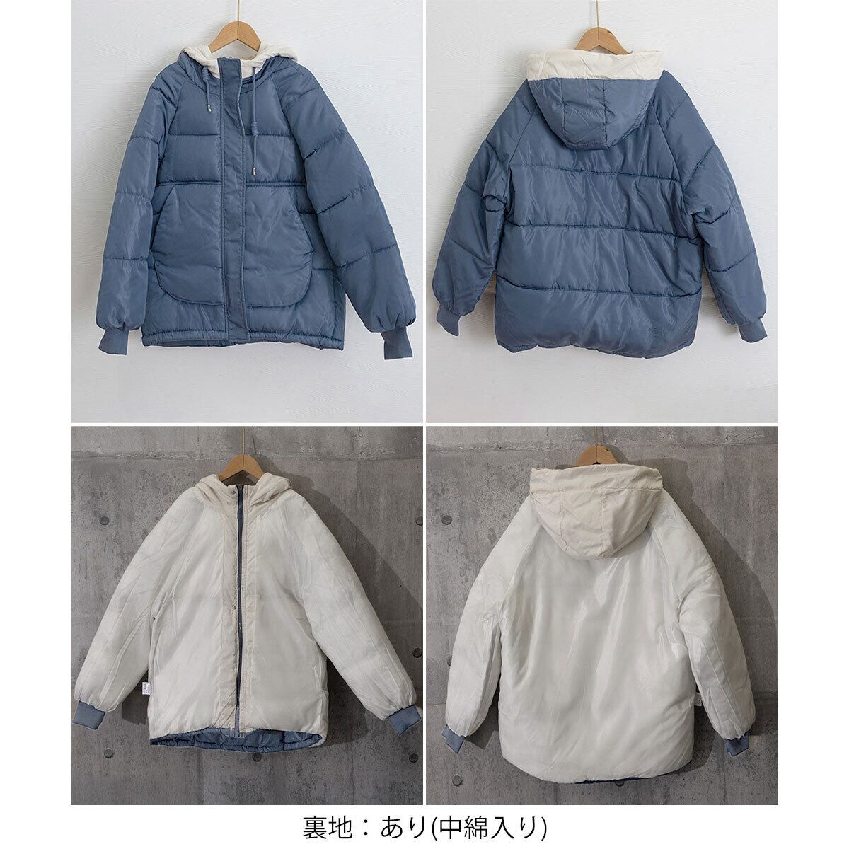 ◇バイカラーの配色が印象的なフード付き中綿ジャケット。