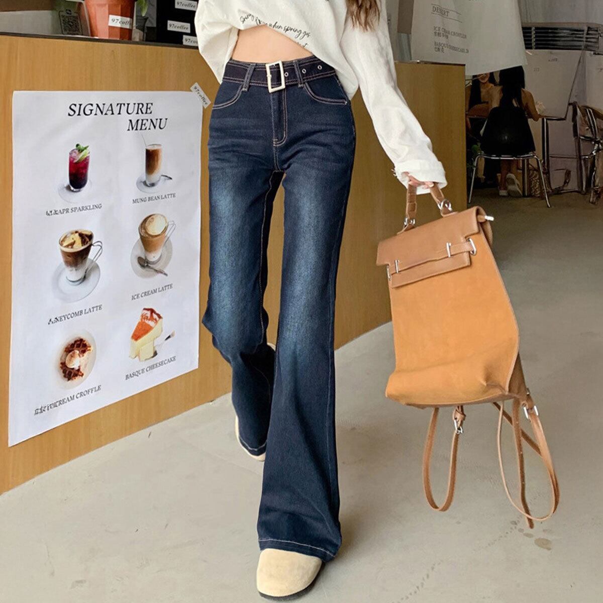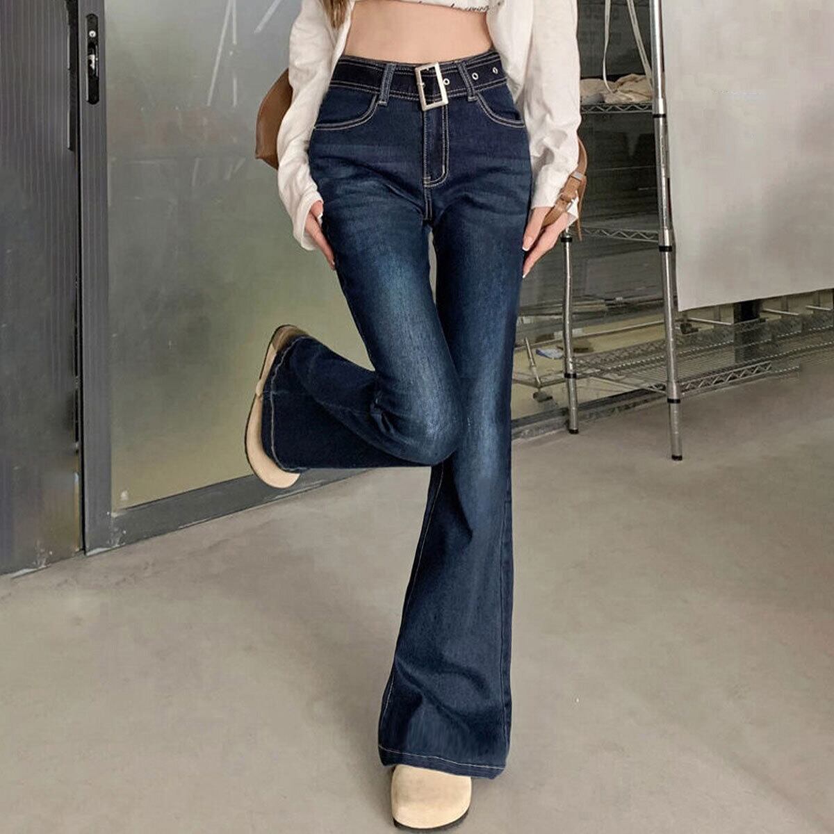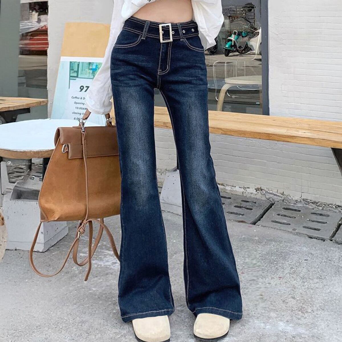 デニム パンツ セミフレア ジーンズ レディース 韓国 ベルボトム ヴィンテージ 大人 カジュアル レトロ おしゃれ ベルト付き デニムパンツ 美脚 脚長 ブーツカット 大人可愛い 大人女子