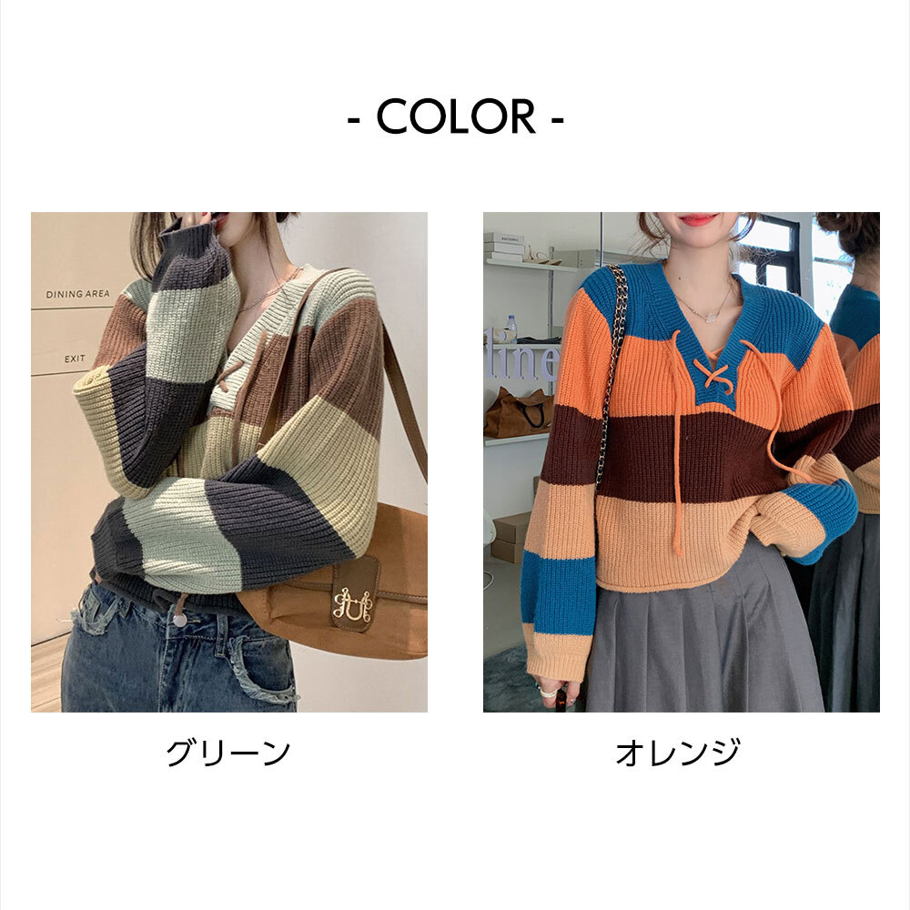 シックな印象のマルチボーダー柄に、レースアップのデザインで、韓国風のトレンドを取り入れたデザインが特徴的なショート丈のニットセーターです。