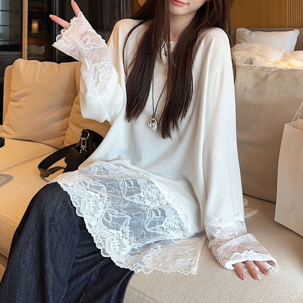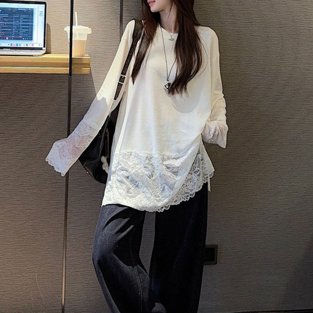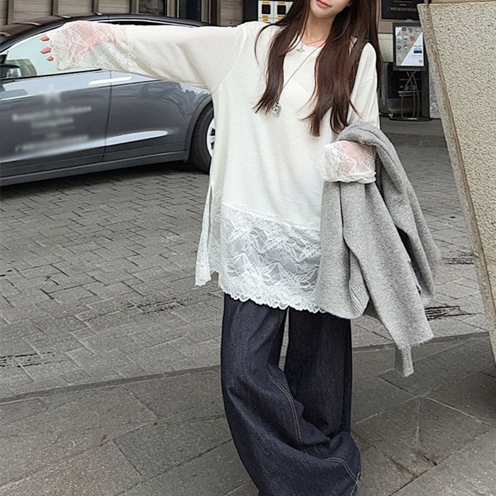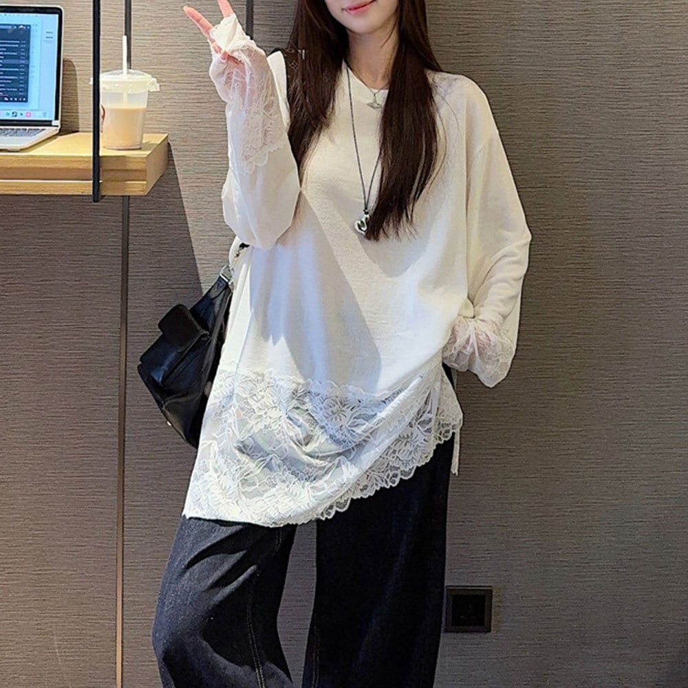 裾部分と袖部分にレースをあしらい、上品さと華やかな印象が特徴的なロング丈の長袖Tシャツです。