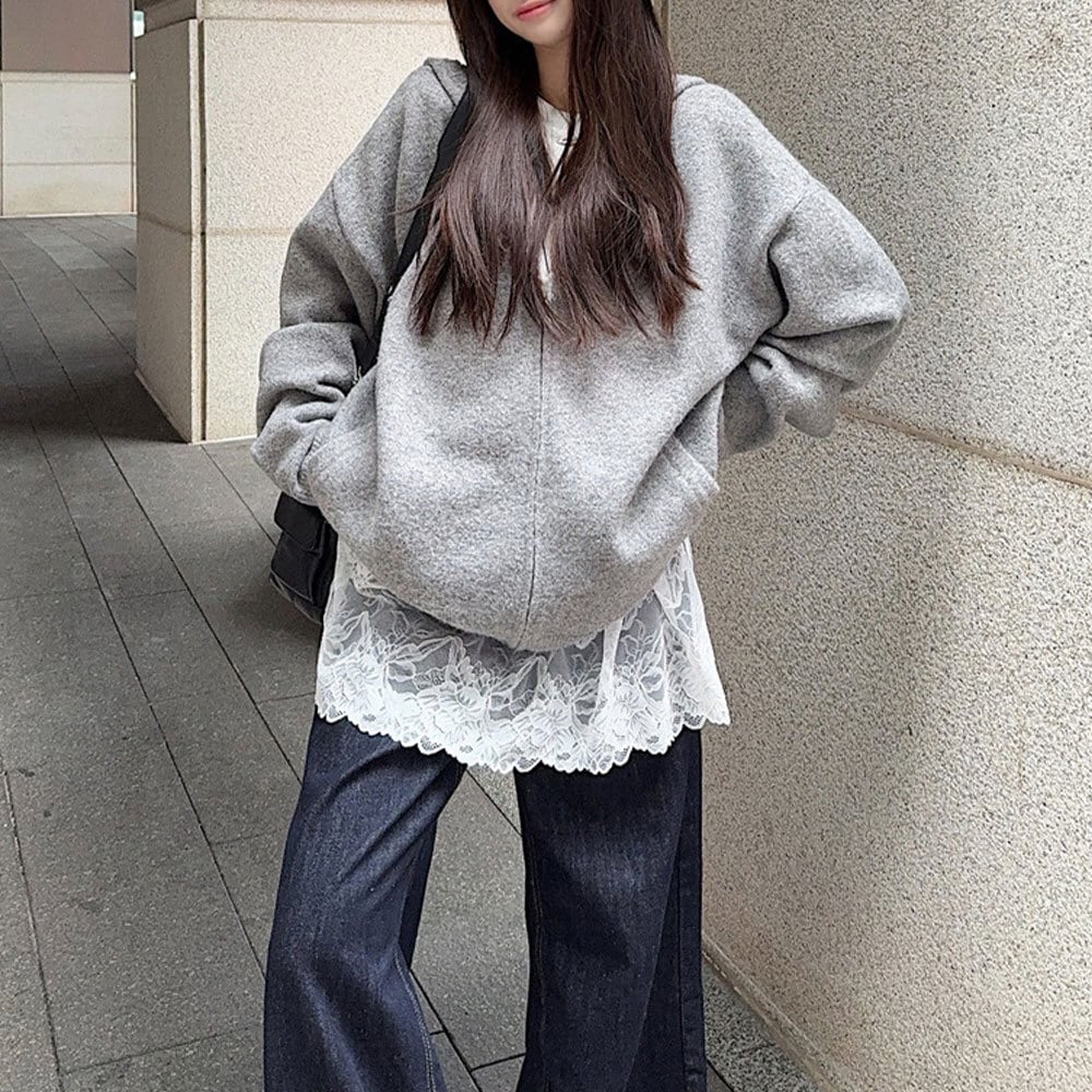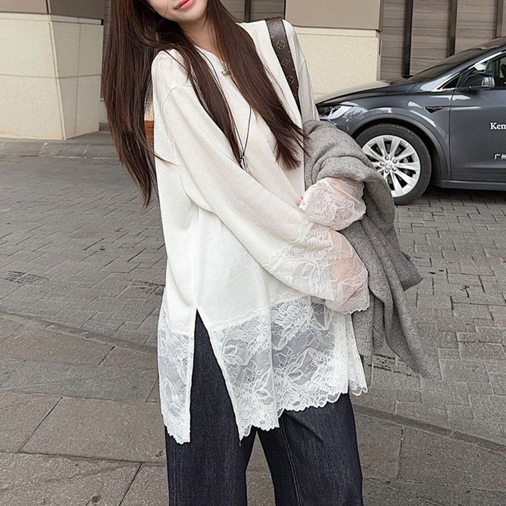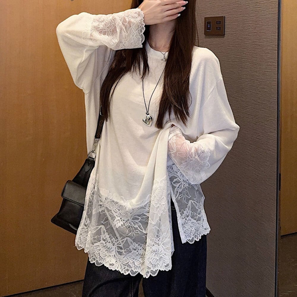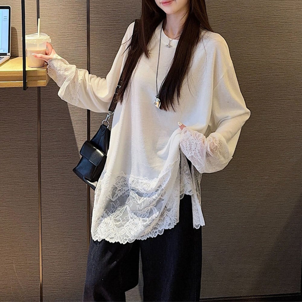 裾部分と袖部分にレースをあしらい、上品さと華やかな印象が特徴的なロング丈の長袖Tシャツです。