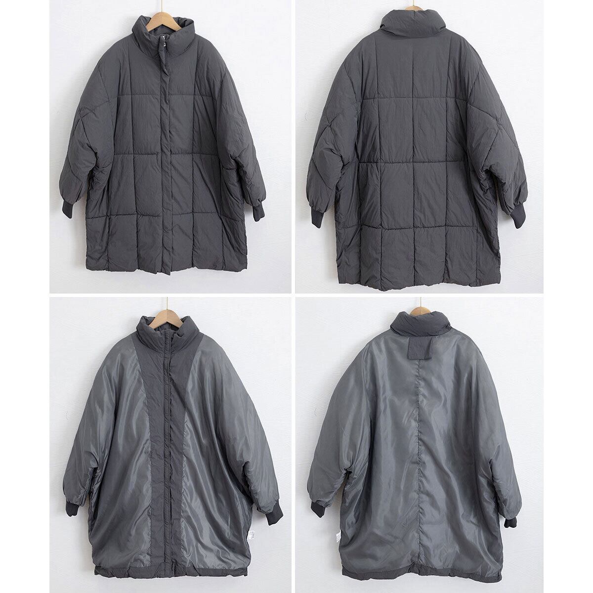 ◇スタンドカラーのミドル丈軽量中綿コート。