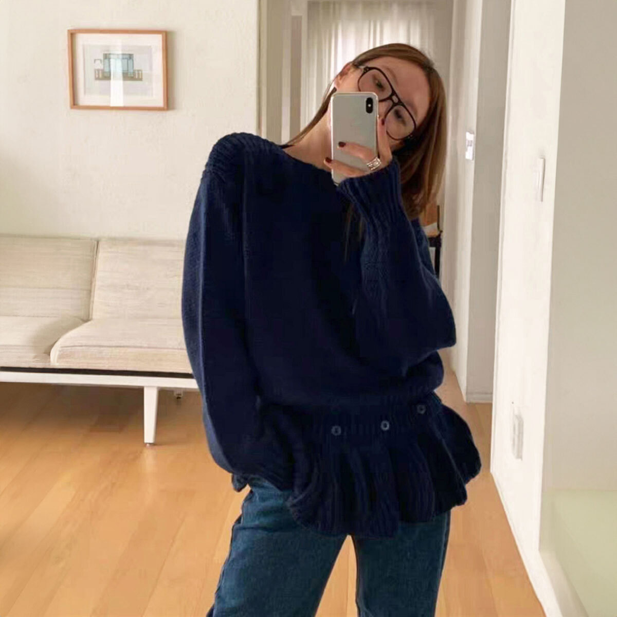 裾部分に施されたペプラムのデザインが、シルエットに女性らしさをプラスし、韓国風のレイヤード風デザインでお洒落を楽しめるペプラムニットの長袖トップスです。