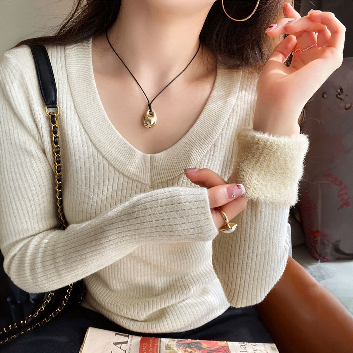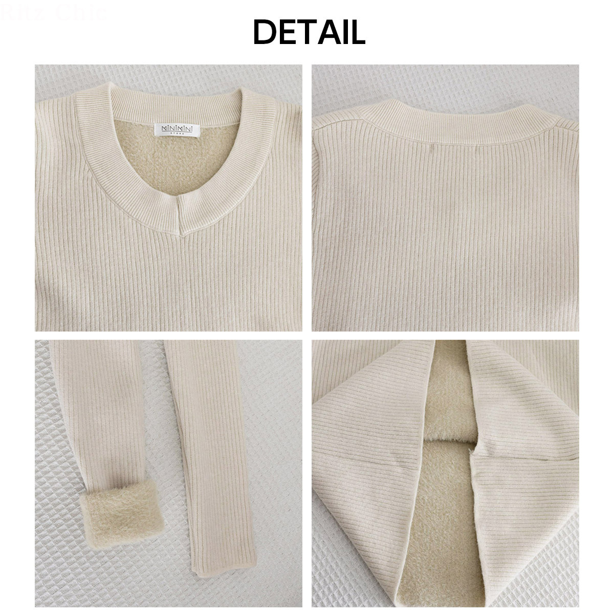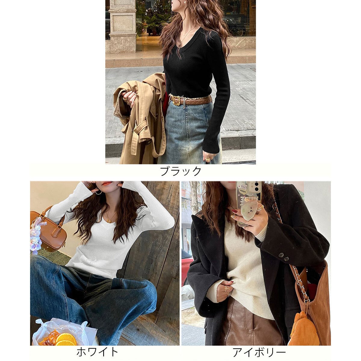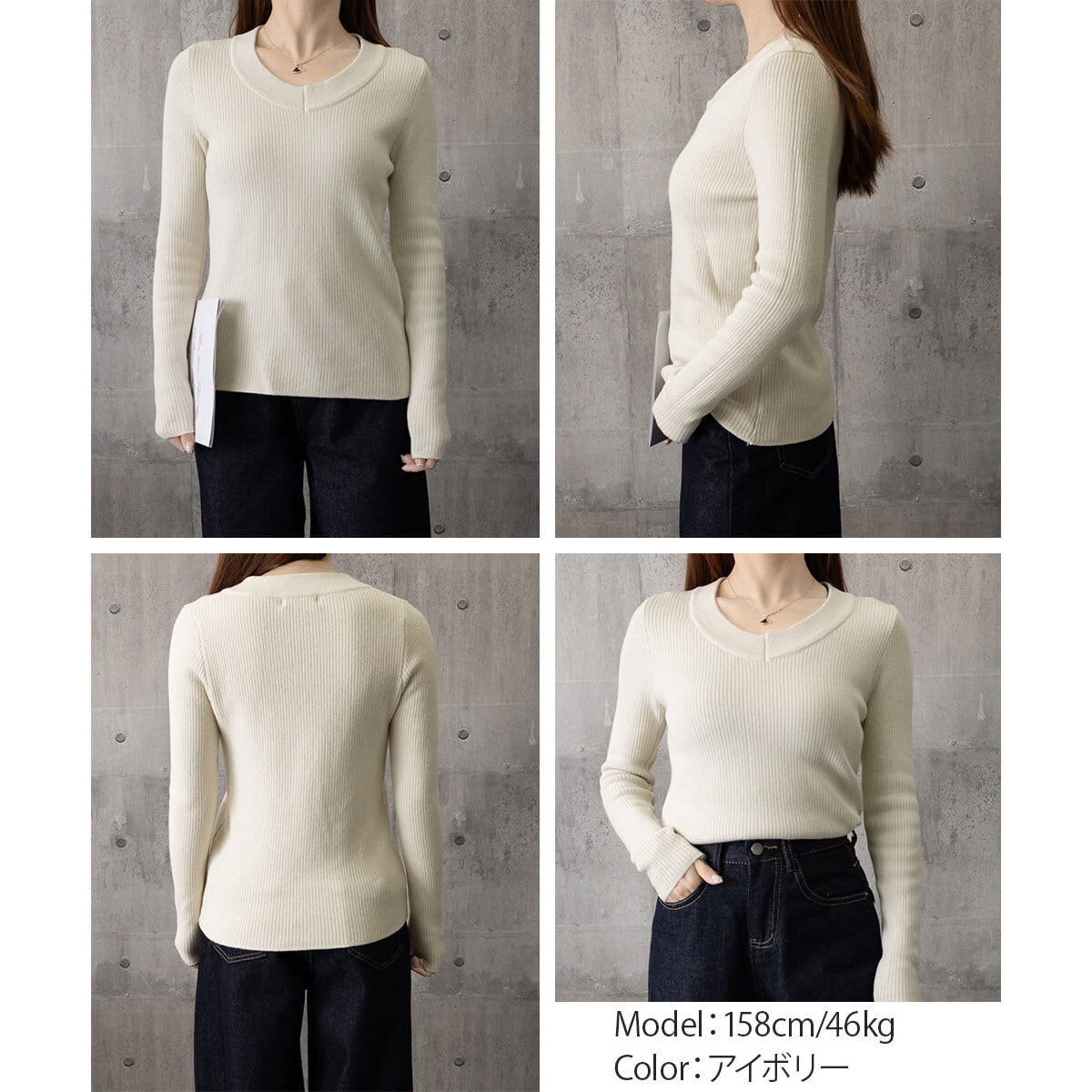 リブニット 裏起毛 Vネック レディース 秋冬 韓国 ニット セーター きれいめ 大人 カジュアル シンプル 長袖 トップス 防寒 保温 暖かい 厚手 大人可愛い 大人女子
