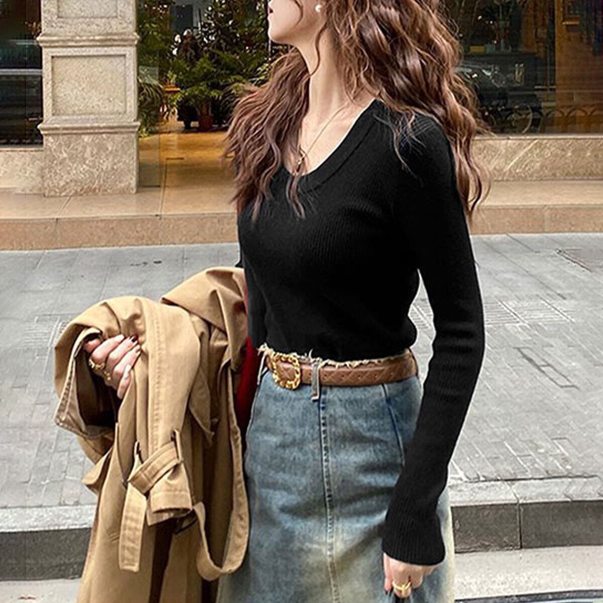 ◇女性らしいVネックが顔周りをすっきり見せる!