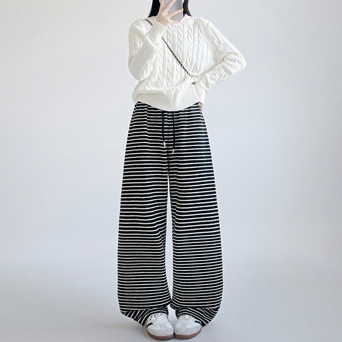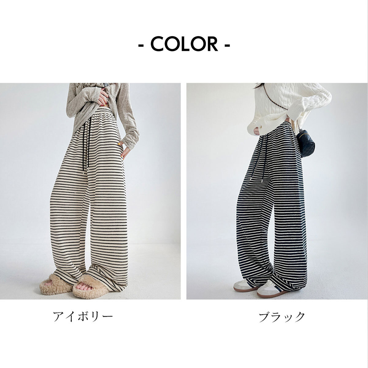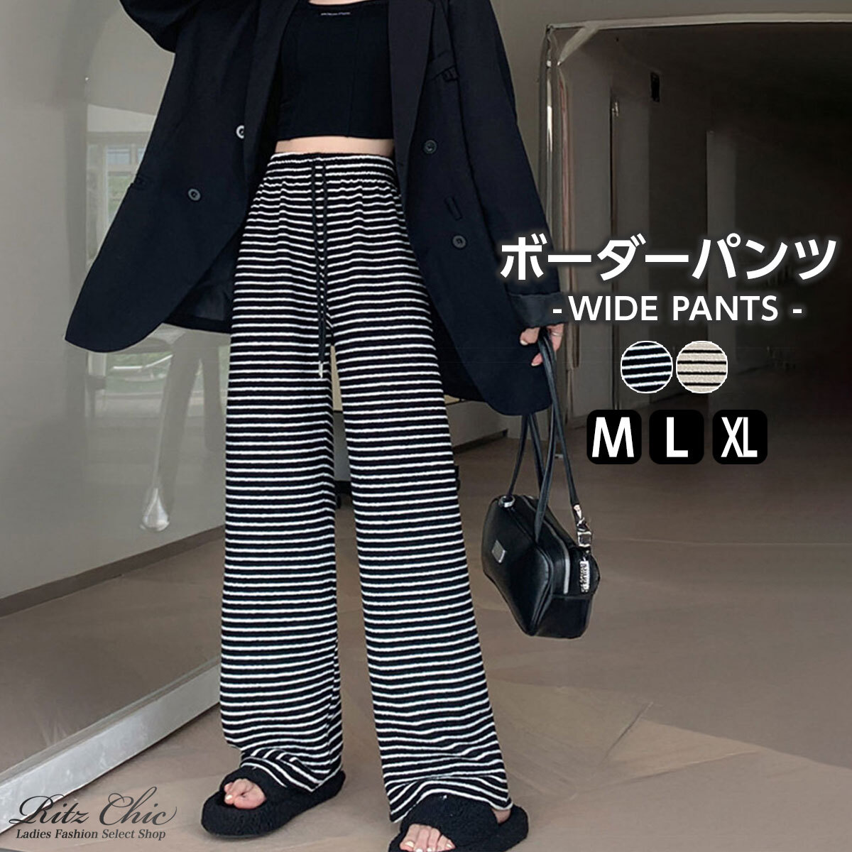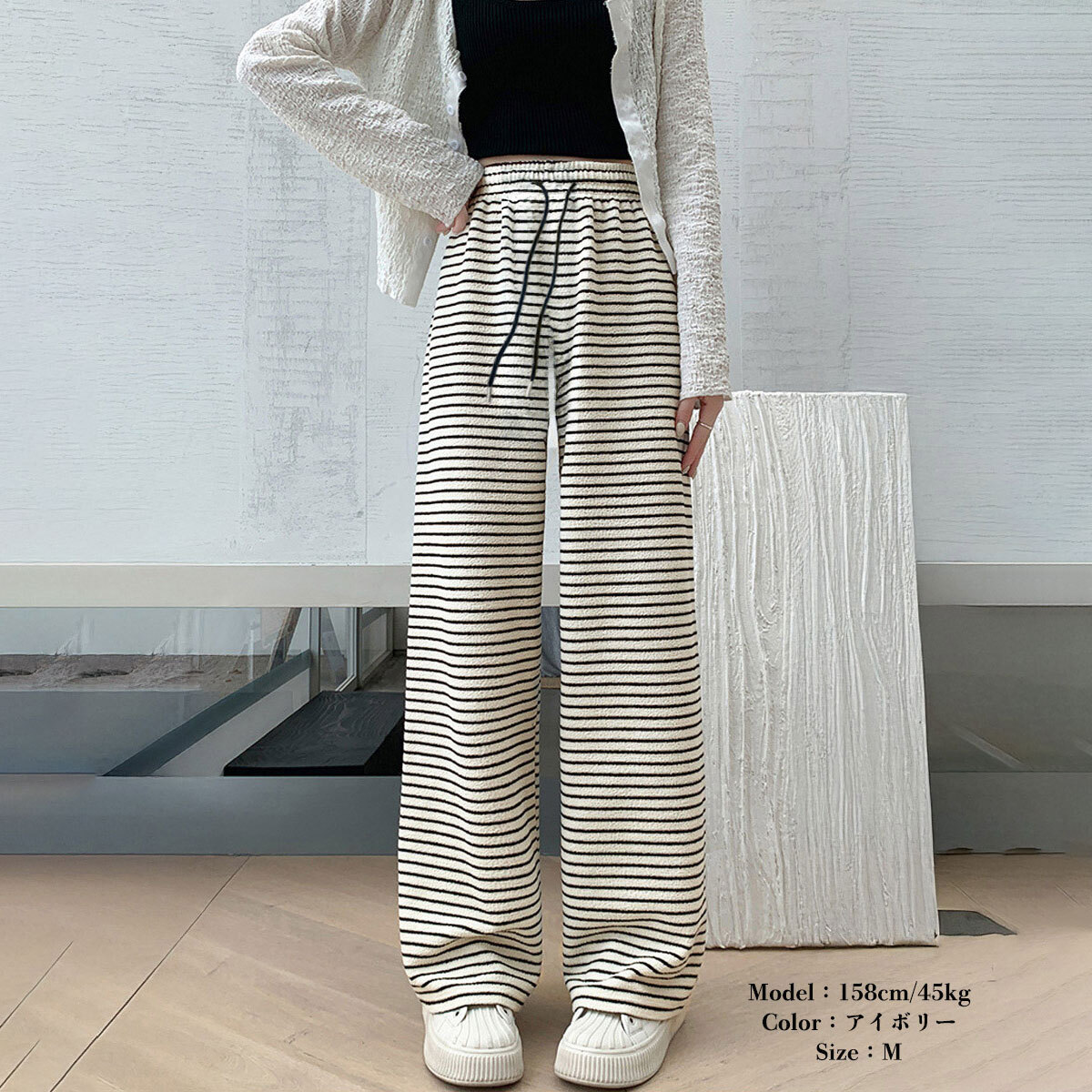 落ち感のあるワイドシルエットで、リラックスした穿き心地とトレンド感を両立させたボーダー柄のイージーパンツです。