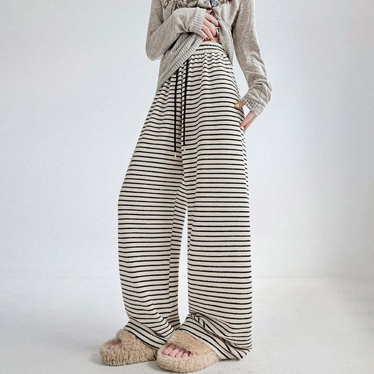 ボーダー柄 イージーパンツ レディース 春秋 韓国 ワイドパンツ ルームウェア きれいめ 大人 カジュアル おしゃれ 体型カバー リラックス ナチュラル 柄パンツ ウエストゴム 大人可愛い 大人女子