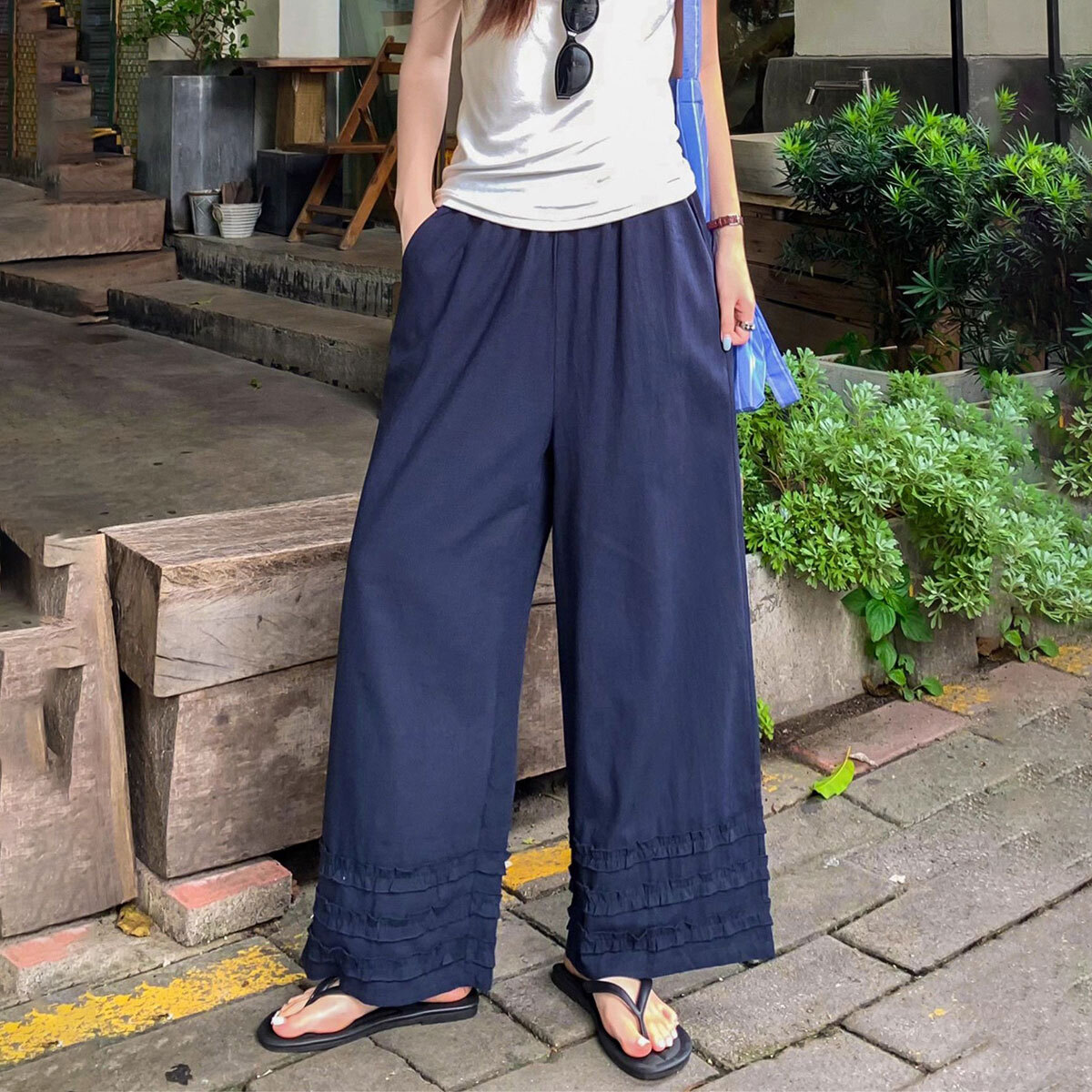 裾に施されたフリルがさりげなく女性らしさを引き立て、軽やかな落ち感が魅力的な9分丈のワイドパンツです。